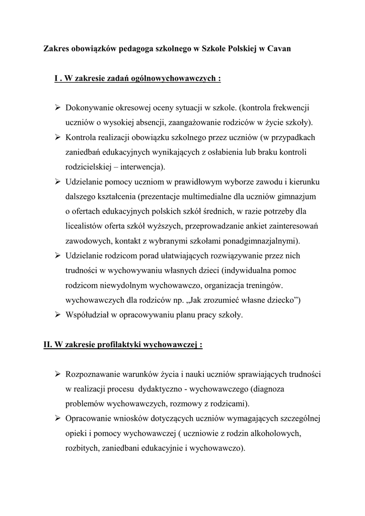 Zakres obowiązków pedagoga szkolnego w Szkole Polskiej w Cavan I . W zakresie zadań ogólnowychowawczych : Dokonywanie okresowej oceny sytuacji w szkole. (kontrola frekwencji uczniów o wysokiej absencji, zaangażowanie rodziców w życie szkoły). Kontrola realizacji obowiązku szkolnego przez uczniów (w przypadkach zaniedbań edukacyjnych wynikających z osłabienia lub braku kontroli rodzicielskiej – interwencja). Udzielanie pomocy uczniom w prawidłowym wyborze zawodu i kierunku dalszego kształcenia (prezentacje multimedialne dla uczniów gimnazjum o ofertach edukacyjnych polskich szkół średnich, w razie potrzeby dla licealistów oferta szkół wyższych, przeprowadzanie ankiet zainteresowań zawodowych, kontakt z wybranymi szkołami ponadgimnazjalnymi). Udzielanie rodzicom porad ułatwiających rozwiązywanie przez nich trudności w wychowywaniu własnych dzieci (indywidualna pomoc rodzicom niewydolnym wychowawczo, organizacja treningów. wychowawczych dla rodziców np. „Jak zrozumieć własne dziecko”) Współudział w opracowywaniu planu pracy szkoły. II. W zakresie profilaktyki wychowawczej : Rozpoznawanie warunków życia i nauki uczniów sprawiających trudności w realizacji procesu dydaktyczno - wychowawczego (diagnoza problemów wychowawczych, rozmowy z rodzicami). Opracowanie wniosków dotyczących uczniów wymagających szczególnej opieki i pomocy wychowawczej ( uczniowie z rodzin alkoholowych, rozbitych, zaniedbani edukacyjnie i wychowawczo). Udzielanie pomocy wychowawcom i nauczycielom w ich pracy z uczniami sprawiającymi trudności wychowawcze (wskazówki metodyczne jak pracować z dzieckiem trudnym, zbuntowanym, ale także dzieckiem dyslektycznym czy nadpobudliwym pycho – ruchowo ). III. W zakresie pracy dydaktyczno-wychowawczej : Organizowanie pomocy w wyrównywaniu braków w wiadomościach szkolnych uczniom napotykającym na szczególne trudności w nauce (zajęcia kompensacyjno – wyrównawcze, nadrobienie zaległości wynikających z niezrealizowania polskiego programu szkolnego spowodowane wyjazdem do Irlandii). Organizowanie pomocy w zakresie wyrównywania i likwidowania mikrodefektów i zaburzeń rozwojowych (wstępna diagnoza, reedukacja, korekcja). IV. W zakresie indywidualnej opieki pedagogicznej Udzielanie uczniom pomocy w eliminowaniu napięć psychicznych nawarstwiających się na tle niepowodzeń szkolnych (należy uwzględnić zarówno niepowodzenia w Szkole Polskiej, ale także problemy w szkole irlandzkiej- trudności adaptacyjne w grupie rówieśniczej, bariera językowa). Udzielanie porad uczniom w rozwiązywaniu trudności powstających na tle konfliktów rodzinnych (tryb życia na emigracji, zapracowanie rodziców, brak odpowiedniej komunikacji z nauczycielami w szkole irlandzkiej może prowadzić do zaburzonej komunikacji pomiędzy uczniem a rodzicami). Udzielanie porad i pomocy uczniom posiadającym trudności w kontaktach z rówieśnikami i kontaktach środowiskowych (prowadzenie zajęć profilaktycznych z zakresu kontrolowania emocji, asertywności). Udzielanie - na wniosek nauczycieli, rodziców, czy samego ucznia – indywidualnej pomocy uczniom mającym trudności. V. Praca terapeutyczna i profilaktyka (kompetencje pedagaoga) Organizowanie różnych form terapii zajęciowej. Pedagogizacja rodziców i nauczycieli ( wypalenie zawodowe, higiena pracy nauczyciela). Opracowanie tematyki i wyników badań w zakresie pracy korekcyjno – kompensacyjnej, wychowawczej i opiekuńczej na potrzeby szkoły. Prowadzenie edukacji prozdrowotnej i promocji zdrowia psychicznego. Prowadzenie profilaktyki uzależnień – przeciwdziałanie paleniu tytoniu, spożywania alkoholu i zażywania narkotyków ( ukazywanie społeczno – ekonomicznych, zdrowotnych i moralnych skutków uzależnień, wyjaśnianie przyczyn i mechanizmów tych zjawisk, konsultacje z rodzicami i nauczycielami). Podejmowanie działań mediacyjnych i interwencyjnych w sytuacjach kryzysowych (np. praca indywidualna z rodziną). Planowanie i organizowanie akcji profilaktycznych. Branie czynnego udziału w szkoleniach, warsztatach, współpraca z innymi pedagogami szkolnymi w Szkołach Polskich w Irlandii (wymiana informacji i doświadczeń, materiałów i pomocy ułatwiających pracę, organizowanie warsztatów tematycznych). VI. W zakresie prowadzenia dokumentacji : Dziennik pracy pedagoga, w którym rejestrowane są wykonywane czynności. Prowadzenie rejestru uczniów sprawiających trudności wychowawcze. Prowadzenie rejestru uczniów sprawiających trudności dydaktyczne. Dbałość o dokumentację, troska o własny warsztat pracy.