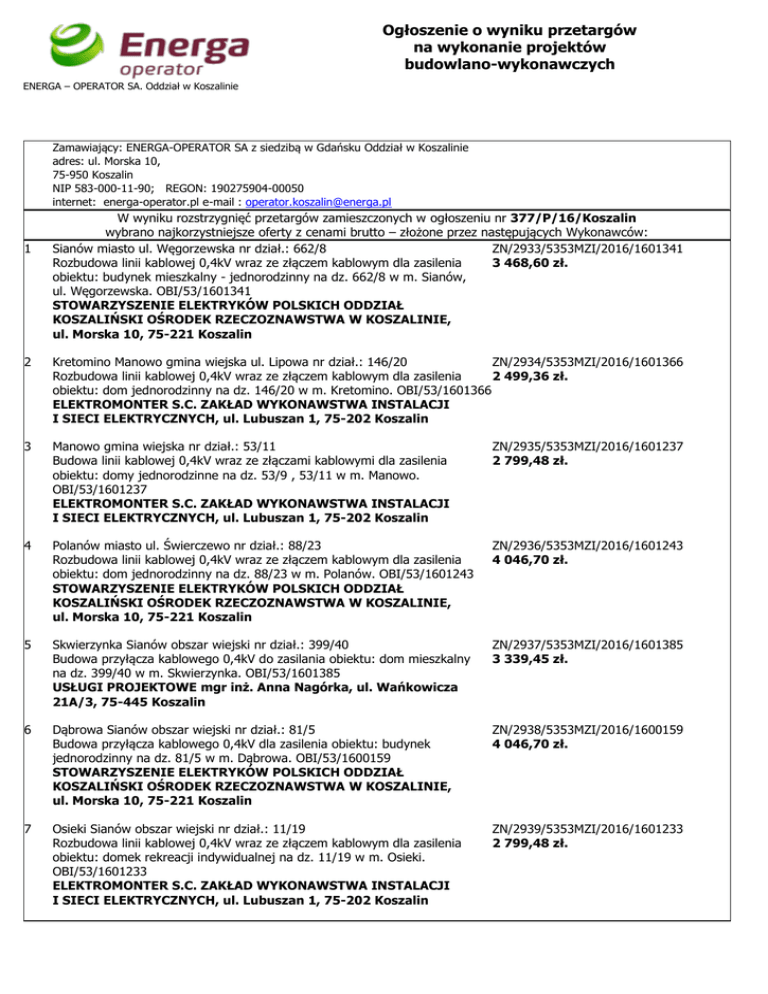 Ogłoszenie o wyniku przetargów na wykonanie projektów budowlano-wykonawczych ENERGA – OPERATOR SA. Oddział w Koszalinie Zamawiający: ENERGA-OPERATOR SA z siedzibą w Gdańsku Oddział w Koszalinie adres: ul. Morska 10, 75-950 Koszalin NIP 583-000-11-90; REGON: 190275904-00050 internet: energa-operator.pl e-mail : [email protected] 1 W wyniku rozstrzygnięć przetargów zamieszczonych w ogłoszeniu nr 377/P/16/Koszalin wybrano najkorzystniejsze oferty z cenami brutto – złożone przez następujących Wykonawców: Sianów miasto ul. Węgorzewska nr dział.: 662/8 ZN/2933/5353MZI/2016/1601341 Rozbudowa linii kablowej 0,4kV wraz ze złączem kablowym dla zasilenia 3 468,60 zł. obiektu: budynek mieszkalny - jednorodzinny na dz. 662/8 w m. Sianów, ul. Węgorzewska. OBI/53/1601341 STOWARZYSZENIE ELEKTRYKÓW POLSKICH ODDZIAŁ KOSZALIŃSKI OŚRODEK RZECZOZNAWSTWA W KOSZALINIE, ul. Morska 10, 75-221 Koszalin 2 Kretomino Manowo gmina wiejska ul. Lipowa nr dział.: 146/20 ZN/2934/5353MZI/2016/1601366 Rozbudowa linii kablowej 0,4kV wraz ze złączem kablowym dla zasilenia 2 499,36 zł. obiektu: dom jednorodzinny na dz. 146/20 w m. Kretomino. OBI/53/1601366 ELEKTROMONTER S.C. ZAKŁAD WYKONAWSTWA INSTALACJI I SIECI ELEKTRYCZNYCH, ul. Lubuszan 1, 75-202 Koszalin 3 Manowo gmina wiejska nr dział.: 53/11 Budowa linii kablowej 0,4kV wraz ze złączami kablowymi dla zasilenia obiektu: domy jednorodzinne na dz. 53/9 , 53/11 w m. Manowo. OBI/53/1601237 ELEKTROMONTER S.C. ZAKŁAD WYKONAWSTWA INSTALACJI I SIECI ELEKTRYCZNYCH, ul. Lubuszan 1, 75-202 Koszalin ZN/2935/5353MZI/2016/1601237 2 799,48 zł. 4 Polanów miasto ul. Świerczewo nr dział.: 88/23 Rozbudowa linii kablowej 0,4kV wraz ze złączem kablowym dla zasilenia obiektu: dom jednorodzinny na dz. 88/23 w m. Polanów. OBI/53/1601243 STOWARZYSZENIE ELEKTRYKÓW POLSKICH ODDZIAŁ KOSZALIŃSKI OŚRODEK RZECZOZNAWSTWA W KOSZALINIE, ul. Morska 10, 75-221 Koszalin ZN/2936/5353MZI/2016/1601243 4 046,70 zł. 5 Skwierzynka Sianów obszar wiejski nr dział.: 399/40 Budowa przyłącza kablowego 0,4kV do zasilania obiektu: dom mieszkalny na dz. 399/40 w m. Skwierzynka. OBI/53/1601385 USŁUGI PROJEKTOWE mgr inż. Anna Nagórka, ul. Wańkowicza 21A/3, 75-445 Koszalin ZN/2937/5353MZI/2016/1601385 3 339,45 zł. 6 Dąbrowa Sianów obszar wiejski nr dział.: 81/5 Budowa przyłącza kablowego 0,4kV dla zasilenia obiektu: budynek jednorodzinny na dz. 81/5 w m. Dąbrowa. OBI/53/1600159 STOWARZYSZENIE ELEKTRYKÓW POLSKICH ODDZIAŁ KOSZALIŃSKI OŚRODEK RZECZOZNAWSTWA W KOSZALINIE, ul. Morska 10, 75-221 Koszalin ZN/2938/5353MZI/2016/1600159 4 046,70 zł. 7 Osieki Sianów obszar wiejski nr dział.: 11/19 Rozbudowa linii kablowej 0,4kV wraz ze złączem kablowym dla zasilenia obiektu: domek rekreacji indywidualnej na dz. 11/19 w m. Osieki. OBI/53/1601233 ELEKTROMONTER S.C. ZAKŁAD WYKONAWSTWA INSTALACJI I SIECI ELEKTRYCZNYCH, ul. Lubuszan 1, 75-202 Koszalin ZN/2939/5353MZI/2016/1601233 2 799,48 zł. Ogłoszenie o wyniku przetargów na wykonanie projektów budowlano-wykonawczych ENERGA – OPERATOR SA. Oddział w Koszalinie 8 Kępiny Polanów obszar wiejski nr dział.: 586/1, 591, 577/6, 592, 593 Rozbudowa linii kablowej 0,4kV wraz ze złączem kablowym dla zasilenia obiektu: zbiornik na tlen ciekły na dz. 586/1 w m. Kępiny. OBI/53/1601427 STOWARZYSZENIE ELEKTRYKÓW POLSKICH ODDZIAŁ KOSZALIŃSKI OŚRODEK RZECZOZNAWSTWA W KOSZALINIE, ul. Morska 10, 75-221 Koszalin ZN/2940/5353MZI/2016/1601427 4 415,70 zł. 9 Wielin Polanów obszar wiejski nr dział.: 75/1 Rozbudowa linii kablowej 0,4kV wraz ze złączem kablowym dla zasilenia obiektu: dom letniskowy na dz. 75/1 w m. Wielin. OBI/53/1601421 STOWARZYSZENIE ELEKTRYKÓW POLSKICH ODDZIAŁ KOSZALIŃSKI OŚRODEK RZECZOZNAWSTWA W KOSZALINIE, ul. Morska 10, 75-221 Koszalin ZN/2941/5353MZI/2016/1601421 4 415,70 zł. 10 Kretomino Manowo gmina wiejska ul. Rolna nr dział.: 135/4 Rozbudowa linii kablowej 0,4kV wraz ze złączem kablowym dla zasilenia obiektu: budynek mieszkalny -jednorodzinny i garaż na dz. 135/4 w m. Kretomino. OBI/53/1601364 ELEKTROMONTER S.C. ZAKŁAD WYKONAWSTWA INSTALACJI I SIECI ELEKTRYCZNYCH, ul. Lubuszan 1, 75-202 Koszalin ZN/2942/5353MZI/2016/1601364 2 499,36 zł. Sporządził(a): Ewelina Przewoźna Koszalin, dnia 13-07-2016