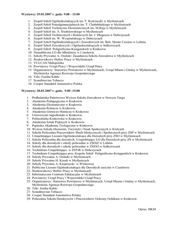 Wystawcy 29.03.2007 r. godz. 9.00 - 15.00 1. 2. 3. 4. 5. 6. 7. 8. 9. 10. 11. 12. 13. 14. 15. Zespół Szkół Ogólnokształcących im. T. Kościuszki w Myślenicach Zespół Szkół Ponadgimnazjalnych im. T. Chałubińskiego w Myślenicach Zespół Szkół Techniczno Ekonomicznych im. M.Reja w Myślenicach Zespół Szkół im. A. Średniawskiego w Myślenicach Zespół Szkół Technicznych i Rolniczych im. J. Długosza w Dobczycach Zespół Szkół im. W. Wyspiańskiego w Dobczycach Zespół Szkół Ogólnokształcących i Zawodowych im. Boh. Monte Cassino w Lubniu Zespół Szkół Zawodowych i Ogólnokształcących w Sułkowicach Zespół Szkół Poligraficzno-Księgarskich w Krakowie Niepubliczne LO dla MłodzieŜy w Czasławiu Szkoły Prywatne A. Osiński: Zasadnicza Szkoła Zawodowa w Myślenicach Środowiskowy Hufiec Pracy w Myślenicach VULCAN Małopolska Powiatowy Urząd Pracy i Wojewódzki Urząd Pracy Organizatorzy: Starostwo Powiatowe w Myślenicach, Urząd Miasta i Gminy w Myślenicach, Myślenicka Agencja Rozwoju Gospodarczego 16. Tele- Fonika Kable 17. Scandinavian Tobacco 18. Cooper Standard Automotive Polska Wystawcy 30.03.2007 r. godz. 9.00 -15.00 1. 2. 3. 4. 5. 6. 7. 8. 9. 10. 11. 12. 13. 14. 15. 16. 17. 18. 19. 20. 21. 22. 23. 24. 25. 26. 27. 28. 29. Podhalańska Państwowa WyŜsza Szkoła Zawodowa w Nowym Targu Akademia Pedagogiczna w Krakowie Akademia Ekonomiczna w Krakowie Akademia Rolnicza w Krakowie Akademia Górniczo Hutnicza w Krakowie Uniwersytet Jagielloński w Krakowie Politechnika Krakowska w Krakowie Akademia Sztuk Pięknych w Krakowie Papieska Akademia Teologiczna w Krakowie WyŜsza Szkoła Ekonomii, Turystyki i Nauk Społecznych w Kielcach Szkoła Policealna Pracowników SłuŜb Medycznych i Społecznych przy ZSP w Myślenicach Uzupełniające Liceum Ogólnokształcące dla Dorosłych przy ZSO w Myślenicach Szkoła Policealna dla dorosłych, Uzupełniające LO dla Dorosłych przy ZS w Myślenicach Szkoły dla dorosłych i szkoły policealne w ZSOiZ w Lubniu Szkoły dla dorosłych i szkoły policealne w ZSZiO w Sułkowicach Technikum Uzupełniające w ZSTiR w Dobczycach Technikum Uzupełniające przy Zespole Szkół Poligraficzno-Księgarskich w Krakowie Szkoły Prywatne A. Osiński w Myślenicach Szkoły Prywatne H. Kosek w Myślenicach Szkoły Prywatne A. Kasprzycki w Wiśniowej Publiczne Liceum Ogólnokształcące dla Dorosłych zaoczne w Czasławiu Środowiskowy Hufiec Pracy w Myślenicach Informatyczne Centrum Edukacyjne w Myślenicach Powiatowy Urząd Pracy i Wojewódzki Urząd Pracy Organizatorzy: Starostwo Powiatowe w Myślenicach, Urząd Miasta i Gminy w Myślenicach, Myślenicka Agencja Rozwoju Gospodarczego. Tele- fonika Kable Scandinavian Tobacco Cooper Standard Automotive Polska Policealna Szkoła Detektywów i Pracowników Ochrony Ochikara w Krakowie Oprac. HKM