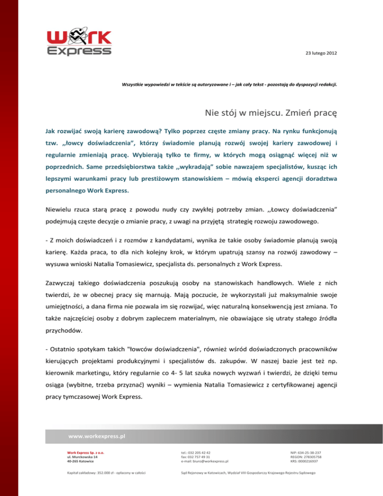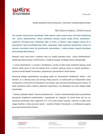 23 lutego 2012 Wszystkie wypowiedzi w tekście są autoryzowane i – jak cały tekst - pozostają do dyspozycji redakcji. Nie stój w miejscu. Zmień pracę Jak rozwijać swoją karierę zawodową? Tylko poprzez częste zmiany pracy. Na rynku funkcjonują tzw. ,,łowcy doświadczenia”, którzy świadomie planują rozwój swojej kariery zawodowej i regularnie zmieniają pracę. Wybierają tylko te firmy, w których mogą osiągnąć więcej niż w poprzednich. Same przedsiębiorstwa także ,,wykradają” sobie nawzajem specjalistów, kusząc ich lepszymi warunkami pracy lub prestiżowym stanowiskiem – mówią eksperci agencji doradztwa personalnego Work Express. Niewielu rzuca starą pracę z powodu nudy czy zwykłej potrzeby zmian. ,,Łowcy doświadczenia” podejmują częste decyzje o zmianie pracy, z uwagi na przyjętą strategię rozwoju zawodowego. - Z moich doświadczeń i z rozmów z kandydatami, wynika że takie osoby świadomie planują swoją karierę. Każda praca, to dla nich kolejny krok, w którym upatrują szansy na rozwój zawodowy – wysuwa wnioski Natalia Tomasiewicz, specjalista ds. personalnych z Work Express. Zazwyczaj takiego doświadczenia poszukują osoby na stanowiskach handlowych. Wiele z nich twierdzi, że w obecnej pracy się marnują. Mają poczucie, że wykorzystali już maksymalnie swoje umiejętności, a dana firma nie pozwala im się rozwijać, więc naturalną konsekwencją jest zmiana. To także najczęściej osoby z dobrym zapleczem materialnym, nie obawiające się utraty stałego źródła przychodów. - Ostatnio spotykam takich "łowców doświadczenia", również wśród doświadczonych pracowników kierujących projektami produkcyjnymi i specjalistów ds. zakupów. W naszej bazie jest też np. kierownik marketingu, który regularnie co 4- 5 lat szuka nowych wyzwań i twierdzi, że dzięki temu osiąga (wybitne, trzeba przyznać) wyniki – wymienia Natalia Tomasiewicz z certyfikowanej agencji pracy tymczasowej Work Express. www.workexpress.pl Work Express Sp. z o.o. ul. Murckowska 14 40-265 Katowice tel.: 032 205 42 42 fax: 032 757 49 31 e-mail: [email protected] NIP: 634-25-38-237 REGON: 278305758 KRS: 0000216937 Kapitał zakładowy: 352.000 zł - opłacony w całości Sąd Rejonowy w Katowicach, Wydział VIII Gospodarczy Krajowego Rejestru Sądowego „Łowcy doświadczenia” nie decydują się na zatrudnienie w firmie, co do której domyślają się lub mają pewność, że nie rozwiną tam skrzydeł. Najczęściej to ludzie, którzy chcą stworzyć coś nowego lub ulepszać istniejące rozwiązania, bo mają w sobie duże pokłady pasji twórczej. Tacy kandydaci potrafią być bardzo dociekliwi i starannie „badają” potencjalnego pracodawcę, nie tylko szukając informacji na forach i portalach społecznościowych, ale też nawiązując bezpośredni kontakt z aktualnymi pracownikami danej firmy. Bywa, że zaskakują szczegółową znajomością firmy, nawet wieloletnich pracowników swojego potencjalnego pracodawcy. Przy okazji dostarczają bardzo cennych informacji pracownikom działów personalnych, którzy podczas rozmów kwalifikacyjnych z takimi kandydatami, dowiadują się, jak ich firmy są postrzegane na rynku. Firmy ,,wykradają” sobie specjalistów Większość firm nadal obawia się kandydatów, którzy często zmieniają pracę Boją się, że zainwestują w pracownika, a on w niedługim czasie odejdzie. Na szczęście, w takim przypadku pomagają udokumentowane sukcesy z poprzednich firm i pozytywne referencje od byłego pracodawcy. Większość pracodawców, zatrudniając nową osobę i inwestując w nią, chce żeby pracowała jak najdłużej. Pracodawcy najbardziej chcą wiązać się długoterminowo z księgowymi, analitykami i kontrolerami finansowymi. Sytuacja ta nie dziwi, bo to wysoko wykwalifikowani pracownicy, którzy mają dostęp do najważniejszych informacji w firmie. - Inaczej jest z zawodami, w których pracuje się w systemach projektowych. Osoby takie cenią sobie przede wszystkim niezależność – zauważa Natalia Tomasiewicz. - Są zatrudniane zazwyczaj na kontrakt, po to aby coś stworzyć, poprawić lub ulepszyć. Kiedy kończy się projekt, zazwyczaj kończy się także współpraca i zaczyna poszukiwanie nowych zleceń - informuje specjalistka ds. personalnych Work Express. Dużą rotację wśród niektórych grup zawodowych, powodują same firmy, które ,,wykradają’’ sobie nawzajem specjalistów. - Jeżeli konkurencyjna firma zaoferuje lepsze możliwości rozwoju i warunki pracy, to kandydaci zazwyczaj korzystają z takiej szansy. Często wystarcza po prostu lepsza wypłata – mówi Natalia www.workexpress.pl Work Express Sp. z o.o. ul. Murckowska 14 40-265 Katowice tel.: 32 721 56 15 gsm: 513 015 260 e-mail: [email protected] NIP: 634-25-38-237 REGON: 278305758 KRS: 0000216937 Kontakt z mediami: Artur Ragan Sąd Rejonowy w Katowicach, Wydział VIII Gospodarczy Krajowego Rejestru Sądowego Tomasiewicz. – jednak nie brak także sytuacji, w których doświadczony specjalista, mimo dobrych warunków, odchodzi do innej firmy, ponieważ w obecnej nie widzi perspektyw. Zdumiewające, jak wielu pracodawców to zaniedbuje i traci dobrych fachowców. Specjalistka Work Express podkreśla, że można zwiększyć szansę na zatrzymanie w firmie wartościowego pracownika. Zazwyczaj poprzez podwyżki, większe prowizje, lepszy samochód i nowe wyzwania stawiane przed pracownikami. Niektórzy będą zmotywowani, widząc kiedy i na jakie stanowisko mogą awansować. Jeszcze inna grupa kandydatów ceni sobie podnoszenie kwalifikacji i właśnie szkolenia uważa za wartościowy czynnik motywujący. Na sytuację „łowców doświadczenia”, może wpłynąć postulowana przez Komisję Europejską, zmiana regulacji prawnych, zakładająca zniesienie podziału w umowach na czas określony i nieokreślony. - W uproszczeniu oznacza to, że wszyscy będą pracowali na czas nieokreślony, ale wypowiedzenie