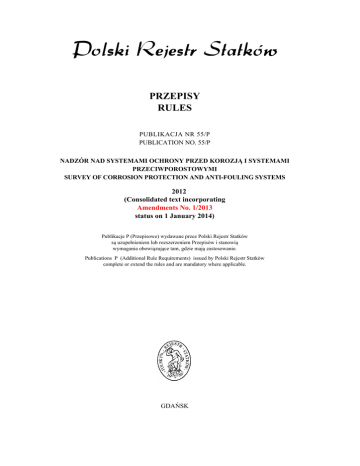 PRZEPISY RULES PUBLIKACJA NR 55/P PUBLICATION NO. 55/P NADZÓR NAD SYSTEMAMI OCHRONY PRZED KOROZJĄ I SYSTEMAMI PRZECIWPOROSTOWYMI SURVEY OF CORROSION PROTECTION AND ANTI-FOULING SYSTEMS 2012 (Consolidated text incorporating Amendments No. 1/2013 status on 1 January 2014) Publikacje P (Przepisowe) wydawane przez Polski Rejestr Statków są uzupełnieniem lub rozszerzeniem Przepisów i stanowią wymagania obowiązujące tam, gdzie mają zastosowanie. Publications P (Additional Rule Requirements) issued by Polski Rejestr Statków complete or extend the rules and are mandatory where applicable. GDAŃSK Publikacja Nr 55/P – Nadzór nad systemami ochrony przed korozją i systemami przeciwporostowymi – 2012, stanowi rozszerzenie wymagań Części II – Kadłub, Przepisów klasyfikacji i budowy statków morskich oraz wszystkich innych Przepisów, w których jest przywołana. Publikacja ta została zatwierdzona przez Zarząd PRS S.A. w dniu 29 grudnia 2011 r. i wchodzi w życie z dniem 1 stycznia 2012 r. Niniejsza Publikacja zastępuje Publikację Nr 55/P – Nadzór nad systemami ochrony przed korozją i porastaniem – 2007 wraz z wydanymi do niej Zmianami: Nr 1/2008 i Nr 2/2011. Publication No. 55/P – Survey of corrosion protection and anti-fouling systems – 2012, is an extension of the requirements contained in Part II – Hull of the Rules for the Classification and Construction of Sea-Going Ships, as well as in all other PRS Rules, in which reference to the Publication has been made. The Publication was approved by the PRS Board on 29 December 2011 and enters into force on 1 January 2012. The present Publication replaces Publication No. 55/P – Survey of corrosion protection and anti-fouling systems – 2007, including the issued Amendments thereto – No. 1/2008 and No. 2/2011. © Copyright by Polski Rejestr Statków S.A., 2012 PRS/AW, 02/2012 ISBN 978-83-7664-072-3 SPIS TREŚCI str. 1 Postanowienia ogólne .................................................................................................................................... 1.1 Zakres stosowania................................................................................................................................... 1.2 Określenia ............................................................................................................................................... 1.3 Dokumenty przywołane w Publikacji..................................................................................................... 5 5 5 5 2 Powłoki ochronne w zbiornikach balastowanych wodą morską ............................................................... 2.1 Zakres stosowania................................................................................................................................... 2.2 Określenia ............................................................................................................................................... 2.3 Postanowienia ogólne ............................................................................................................................. 2.4 Poziom wykonania powłok..................................................................................................................... 2.5 Podstawowe wymagania dla systemu powłokowego.............................................................................. 2.6 Uznanie systemu powłokowego.............................................................................................................. 2.7 Inspekcja powłok .................................................................................................................................... 2.8 Alternatywne systemy powłokowe ......................................................................................................... 6 6 6 7 8 8 11 11 12 3 Systemy przeciwporostowe........................................................................................................................... 3.1 Postanowienia ogólne ............................................................................................................................. 3.2 Określenia ............................................................................................................................................... 3.3 Wymagania ............................................................................................................................................. 3.4 Przeglądy systemów przeciwporostowych ............................................................................................. 3.5 Weryfikacja systemów przeciwporostowych.......................................................................................... 13 13 13 13 14 14 4 Ochrona katodowa ........................................................................................................................................ 4.1 Ochrona katodowa przestrzeni balastowanych wodą morską................................................................. 15 15 CONTENTS page 1 General ........................................................................................................................................................... 1.1 Application ............................................................................................................................................. 1.2 Definitions .............................................................................................................................................. 1.3 Reference Documents ............................................................................................................................. 17 17 17 17 2 Protective Coatings for Seawater Ballast Tanks......................................................................................... 2.1 Application ........................................................................................................................