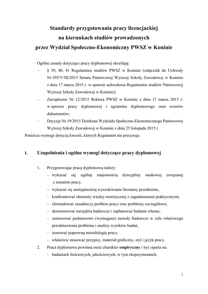 Standardy przygotowania pracy licencjackiej na kierunkach studiów prowadzonych przez Wydział Społeczno-Ekonomiczny PWSZ w Koninie Ogólne zasady dotyczące pracy dyplomowej określają: ‒ § 39, 40, 41 Regulaminu studiów PWSZ w Koninie (załącznik do Uchwały Nr 293/V/III/2015 Senatu Państwowej Wyższej Szkoły Zawodowej w Koninie z dnia 17 marca 2015 r. w sprawie uchwalenia Regulaminu studiów Państwowej ‒ ‒ Wyższej Szkoły Zawodowej w Koninie); Zarządzenie Nr 12/2015 Rektora PWSZ w Koninie z dnia 17 marca 2015 r. w sprawie pracy dyplomowej i egzaminu dyplomowego oraz wzorów dokumentów; Decyzja Nr 19/2015 Dziekana Wydziału Społeczno-Ekonomicznego Państwowej Wyższej Szkoły Zawodowej w Koninie z dnia 25 listopada 2015 r. Poniższe wymogi dotyczą kwestii, których Regulamin nie precyzuje. I. Uzupełnienia i ogólne wymogi dotyczące pracy dyplomowej 1. Przygotowując pracę dyplomową należy: ‒ wykazać się ogólną z tematem pracy, znajomością dyscypliny naukowej związanej ‒ wykazać się umiejętnością wyszukiwania literatury przedmiotu, ‒ konfrontować elementy wiedzy teoretycznej z zagadnieniami praktycznymi, ‒ sformułować zasadniczy problem pracy oraz problemy szczegółowe, ‒ skonstruować narzędzia badawcze i zaplanować badania własne, ‒ zastosować podstawowe (wymagane) metody badawcze w celu właściwego przedstawienia problemu i analizy wyników badań, ‒ stosować poprawną metodologię pracy, 2. ‒ właściwie stosować przypisy, materiał graficzny, styl i język pracy. Praca dyplomowa powinna mieć charakter empiryczny i być oparta na: ‒ badaniach ilościowych, jakościowych, w tym eksperymentach, 1 ‒ projektach (w nawiązaniu do praktyki i metodyki danej dziedziny, np. analiza materiałów metodycznych), ‒ studium przypadku, ‒ innych pracach badawczych. W miarę możliwości temat pracy powinien odzwierciedlać zainteresowania 3. studenta i uwzględniać możliwości uzyskania materiału źródłowego. Bezpośrednią opiekę nad wykonaniem pracy dyplomowej sprawuje promotor. Zbieranie materiałów powinno odbywać się od momentu ustalenia tematu i planu. Napisane fragmenty należy sukcesywnie przekazywać promotorowi w celu ich 4. akceptacji lub naniesienia uwag, umożliwiających dokonanie zmian. Wykonana praca ma być materialnym dowodem opanowania umiejętności potrzebnych do pisania prac dyplomowych. Musi być samodzielna. Autor korzystający z obcego tekstu, bez wskazania jego źródła, popełnia plagiat, dokonuje kradzieży własności intelektualnej i naraża się na restrykcje prawne. Prace dyplomowe w PWSZ w Koninie są sprawdzane pod względem samodzielności ich wykonania przez autorów przy pomocy elektronicznego systemu antyplagiatowego Plagiat.pl. Prace, w których wykryte zapożyczenia będą przekraczały ustalone współczynniki, nie będą dopuszczone do egzaminu 5. dyplomowego. Weryfikacji antyplagiatowej podlega złożony we właściwej jednostce organizacyjnej WSE egzemplarz pracy licencjackiej oprawiony w miękką, przezroczystą oprawę (nie może być bindowany), drukowany dwustronnie z widoczną stroną tytułową pracy, na której promotor potwierdził przyjęcie pracy umieszczonym zapisem „Pracę przyjmuję” wraz z podpisem i datą. Do egzemplarza w formie papierowej należy dołączyć egzemplarz w formie elektronicznej (na płycie CD lub DVD) zgodnie z odrębnym zarządzeniem 6. w sprawie zasad procedury antyplagiatowej stosowanej na WSE. Po pozytywnej weryfikacji antyplagiatowej student w wydziałowej jednostce organizacyjnej składa pozostałe dwa egzemplarze wydrukowane jednostronnie, rodzaj oprawy do uzgodnienia z promotorem. 2 II. Konstrukcja pracy dyplomowej 1. Strona tytułowa – według wzoru (Załącznik nr 1 do Zarządzenia Rektora 2. Spis treści 3. Nr 12/2015 PWSZ w Koninie z dnia 17 marca 2015 r.). Wstęp – stanowi wprowadzenie do badanych i analizowanych zagadnień (około 2 stron). Powinien zawierać: wyjaśnienie, czego dotyczy praca, uzasadnienie wyboru tematu pracy, skorelowany z tytułem cel pracy, określenie charakteru i rodzaju wykorzystanych źródeł, zastosowane metody badawcze, 4. krótką charakterystykę struktury pracy. Tekst pracy – tworzą go poszczególne rozdziały i podrozdziały pracy, które powinny stanowić logiczną i zwartą tematycznie całość. Rozdział 1 – teoretyczny dotyczący głównego problemu pracy (około 15 stron). Rozdział 2 – metodologiczny (około 15 stron). Rozdział 3 – empiryczny, analiza wyników badań (około 15 – 20 stron). Struktura pracy (tj. rozdziały) może ulec zmianie w zależności od dyscypliny 5. naukowej, z zakresu której pisana jest praca dyplomowa. Zakończenie – powinno zawierać podsumowanie i być odniesieniem do sformułowanych na wstępie celów (około 2 – 3 stron). Wynikające z pracy spostrzeżenia własne autora, skonstruowane w formie wniosków, muszą być 6. jednoznaczne i oparte na badanym materiale. Bibliografia – zawiera wszystkie pozycje, z których autor korzystał przy pisaniu pracy, z podziałem na: a. wydawnictwa zwarte; b. wydawnictwa ciągłe; c. akty prawne; 7. 8. 9. d. źródła internetowe. Streszczenie i słowa kluczowe Abstract and key words - streszczenie pracy i słowa kluczowe w języku angielskim. Spis tabel 10. Spis rysunków 11. Spis wykresów 3 12. Spis załączników 13. Załączniki: narzędzia stosowane w badaniach (jeżeli są konstrukcji własnej lub dostępne dla użytku publicznego za zgoda autora); tabele z wynikami w formie podsumowania; cytowane ustawy, rozporządzenia lub inne ogólnodostępne materiały. 14. Oświadczenie o samodzielności wykonanej pracy (Załącznik nr do Zarządzenia Nr 12/2015 Rektora PWSZ w Koninie z dnia 17 marca 2015 r.). 2 15. Oświadczenie u udzieleniu licencji (Załącznik nr 1.1 do Regulaminu procedury antyplagiatowej, stanowiącego Załącznik do Decyzji Nr 19/2015 Dziekana WSE PWSZ w Koninie z dnia 25 listopada 