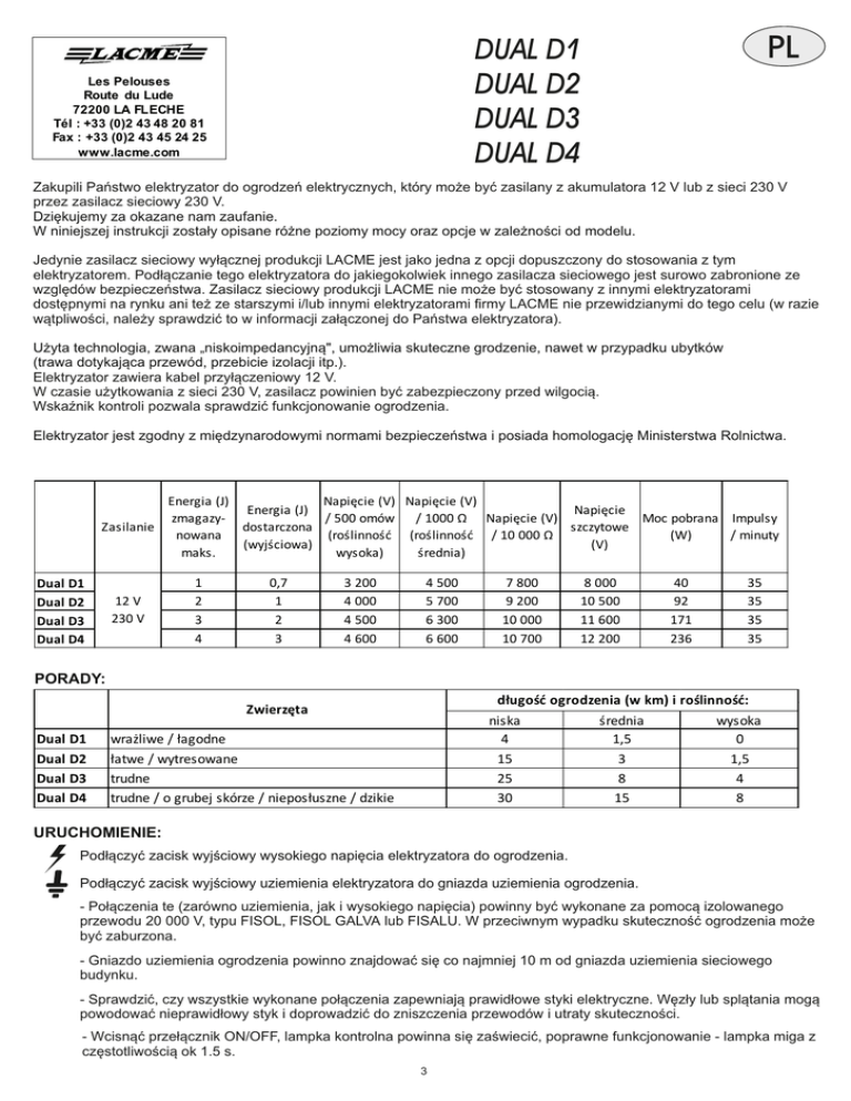 PL DUAL D1 DUAL D2 DUAL D3 DUAL D4 Les Pelouses Route du Lude 72200 LA FLECHE Tél : +33 (0)2 43 48 20 81 Fax : +33 (0)2 43 45 24 25 www.lacme.com Zakupili Państwo elektryzator do ogrodzeń elektrycznych, który może być zasilany z akumulatora 12 V lub z sieci 230 V przez zasilacz sieciowy 230 V. Dziękujemy za okazane nam zaufanie. W niniejszej instrukcji zostały opisane różne poziomy mocy oraz opcje w zależności od modelu. Jedynie zasilacz sieciowy wyłącznej produkcji LACME jest jako jedna z opcji dopuszczony do stosowania z tym elektryzatorem. Podłączanie tego elektryzatora do jakiegokolwiek innego zasilacza sieciowego jest surowo zabronione ze względów bezpieczeństwa. Zasilacz sieciowy produkcji LACME nie może być stosowany z innymi elektryzatorami dostępnymi na rynku ani też ze starszymi i/lub innymi elektryzatorami firmy LACME nie przewidzianymi do tego celu (w razie wątpliwości, należy sprawdzić to w informacji załączonej do Państwa elektryzatora). Użyta technologia, zwana „niskoimpedancyjną", umożliwia skuteczne grodzenie, nawet w przypadku ubytków (trawa dotykająca przewód, przebicie izolacji itp.). Elektryzator zawiera kabel przyłączeniowy 12 V. W czasie użytkowania z sieci 230 V, zasilacz powinien być zabezpieczony przed wilgocią. Wskaźnik kontroli pozwala sprawdzić funkcjonowanie ogrodzenia. Elektryzator jest zgodny z międzynarodowymi normami bezpieczeństwa i posiada homologację Ministerstwa Rolnictwa. Energia (J) Napięcie (V) Napięcie (V) Energia (J) Napięcie zmagazy/ 500 omów / 1000 Ω Napięcie (V) Moc pobrana Impulsy Zasilanie dostarczona szczytowe nowana (roślinność (roślinność / 10 000 Ω (W) / minuty (wyjściowa) (V) maks. wysoka) średnia) Dual D1 Dual D2 Dual D3 Dual D4 12 V 230 V 1 2 3 4 0,7 1 2 3 3 200 4 000 4 500 4 600 4 500 5 700 6 300 6 600 7 800 9 200 10 000 10 700 8 000 10 500 11 600 12 200 40 92 171 236 35 35 35 35 PORADY: długość ogrodzenia (w km) i roślinność: Zwierzęta Dual D1 Dual D2 Dual D3 Dual D4 niska 4 15 25 30 wrażliwe / łagodne łatwe / wytresowane trudne trudne / o grubej skórze / nieposłuszne / dzikie średnia 1,5 3 8 15 wysoka 0 1,5 4 8 URUCHOMIENIE: Podłączyć zacisk wyjściowy wysokiego napięcia elektryzatora do ogrodzenia. Podłączyć zacisk wyjściowy uziemienia elektryzatora do gniazda uziemienia ogrodzenia. - Połączenia te (zarówno uziemienia, jak i wysokiego napięcia) powinny być wykonane za pomocą izolowanego przewodu 20 000 V, typu FISOL, FISOL GALVA lub FISALU. W przeciwnym wypadku skuteczność ogrodzenia może być zaburzona. - Gniazdo uziemienia ogrodzenia powinno znajdować się co najmniej 10 m od gniazda uziemienia sieciowego budynku. - Sprawdzić, czy wszystkie wykonane połączenia zapewniają prawidłowe styki elektryczne. Węzły lub splątania mogą powodować nieprawidłowy styk i doprowadzić do zniszczenia przewodów i utraty skuteczności. - Wcisnąć przełącznik ON/OFF, lampka kontrolna powinna się zaświecić, poprawne funkcjonowanie - lampka miga z częstotliwością ok 1.5 s. 3 Podłączenie kabli zasilających akumulatora. Włącznik ON/OFF - + - + Możliwość podłączenia kabli z prawej lub lewej strony z uwzględnieniem polaryzacji (+) i (-). Przykład podłączenia klasycznego : Izolator Izolator Podłączenie do akumulatora 12 V : + -+ Przewód czarny Przewód czerwony Podłączenie z zasilaczem sieciowym LACME : -+ + Przewód czarny Przewód czerwony Podłączenie z zasilaczem sieciowym LACME i akumulatorem 12 V : + Przewód czarny Przewód czerwony -+-+ Zasilacz zasila elektryzator i ładuje akumulator. W przypadku odcięcia prądu akumulator zasila elektryzator. Działanie elektryzatora jest zagwarantowane. 2