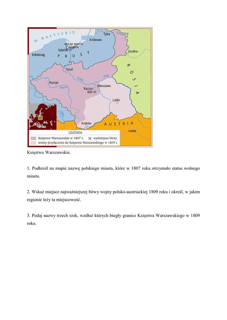 Księstwo Warszawskie. 1. Podkreśl na mapie nazwę polskiego miasta, które w 1807 roku otrzymało status wolnego miasta. 2. Wskaż miejsce najważniejszej bitwy wojny polsko-austriackiej 1809 roku i określ, w jakim regionie leży ta miejscowość. 3. Podaj nazwy trzech rzek, wzdłuż których biegły granice Księstwa Warszawskiego w 1809 roku.