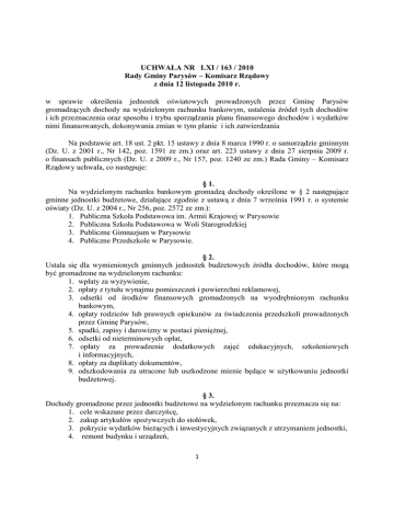 UCHWAŁA NR LXI / 163 / 2010 Rady Gminy Parysów – Komisarz Rządowy z dnia 12 listopada 2010 r. w sprawie określenia jednostek oświatowych prowadzonych przez Gminę Parysów gromadzących dochody na wydzielonym rachunku bankowym, ustalenia źródeł tych dochodów i ich przeznaczenia oraz sposobu i trybu sporządzania planu finansowego dochodów i wydatków nimi finansowanych, dokonywania zmian w tym planie i ich zatwierdzania Na podstawie art. 18 ust. 2 pkt. 15 ustawy z dnia 8 marca 1990 r. o samorządzie gminnym (Dz. U. z 2001 r., Nr 142, poz. 1591 ze zm.) oraz art. 223 ustawy z dnia 27 sierpnia 2009 r. o finansach publicznych (Dz. U. z 2009 r., Nr 157, poz. 1240 ze zm.) Rada Gminy – Komisarz Rządowy uchwala, co następuje: § 1. Na wydzielonym rachunku bankowym gromadzą dochody określone w § 2 następujące gminne jednostki budżetowe, działające zgodnie z ustawą z dnia 7 września 1991 r. o systemie oświaty (Dz. U. z 2004 r., Nr 256, poz. 2572 ze zm.): 1. Publiczna Szkoła Podstawowa im. Armii Krajowej w Parysowie 2. Publiczna Szkoła Podstawowa w Woli Starogrodzkiej 3. Publiczne Gimnazjum w Parysowie 4. Publiczne Przedszkole w Parysowie. § 2. Ustala się dla wymienionych gminnych jednostek budżetowych źródła dochodów, które mogą być gromadzone na wydzielonym rachunku: 1. wpłaty za wyżywienie, 2. opłaty z tytułu wynajmu pomieszczeń i powierzchni reklamowej, 3. odsetki od środków finansowych gromadzonych na wyodrębnionym rachunku bankowym, 4. opłaty rodziców lub prawnych opiekunów za świadczenia przedszkoli prowadzonych przez Gminę Parysów, 5. spadki, zapisy i darowizny w postaci pieniężnej, 6. odsetki od nieterminowych opłat, 7. opłaty za prowadzenie dodatkowych zajęć edukacyjnych, szkoleniowych i informacyjnych, 8. opłaty za duplikaty dokumentów, 9. odszkodowania za utracone lub uszkodzone mienie będące w użytkowaniu jednostki budżetowej. § 3. Dochody gromadzone przez jednostki budżetowe na wydzielonym rachunku przeznacza się na: 1. cele wskazane przez darczyńcę, 2. zakup artykułów spożywczych do stołówek, 3. pokrycie wydatków bieżących i inwestycyjnych związanych z utrzymaniem jednostki, 4. remont budynku i urządzeń, 1 5. zakup nagród dla uczniów za udział w konkursach i zawodach, 6. opłaty za obsługę rachunku bankowego. § 4. 1. Podstawą gospodarki finansowej jednostki budżetowej w zakresie dochodów gromadzonych na wyodrębnionym rachunku jest roczny plan finansowy dochodów i wydatków sporządzony w szczegółowości: dział, rozdział, paragraf klasyfikacji budżetowej. 2. Plan finansowy dochodów i wydatków nimi finansowanych jest sporządzany zgodnie z procedurami tworzenia budżetu za dany rok kalendarzowy. 3. Projekt planu finansowego kierownik jednostki przedkłada do projektu budżetu Gminy na dany rok, a po uchwaleniu budżetu, zatwierdza jako wiążący do realizacji. § 5. 1. Dyrektorzy jednostek budżetowych dokonują zmian w planie finansowym dochodów gromadzonych na wyodrębnionym rachunku i wydatków nimi finansowanych polegających na przeniesieniach między podziałkami klasyfikacji budżetowej w ramach ogólnych kwot dochodów i wydatków zawartych w planie, o których niezwłocznie informują Wójta Gminy. 2. Zmiany powodujące zwiększenie lub zmniejszenie ogólnych kwot dochodów i wydatków planu finansowego wprowadza Rada Gminy Parysów zgodnie z projektem uchwały sporządzonej przez Wójta Gminy. § 6. Traci moc uchwała Nr XXV/106/05 Rady Gminy Parysów z dnia 12 kwietnia 2005 r. w sprawie gromadzenia dochodów na rachunkach dochodów własnych w jednostkach budżetowych Gminy. § 7. Wykonanie uchwały powierza się Wójtowi Gminy. § 8. Uchwała wchodzi w życie z dniem podjęcia z mocą obowiązującą od 1 stycznia 2011 r. Rada Gminy - Komisarz Rządowy /-/ Mirosław Łukowski 2
