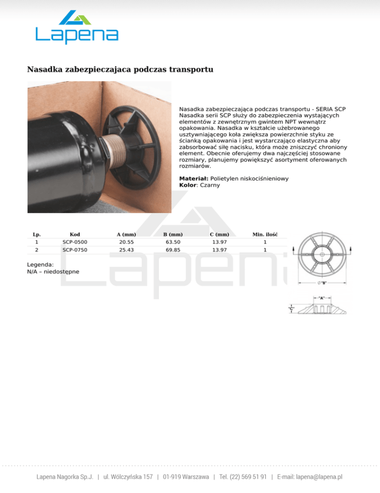 Nasadka zabezpieczajaca podczas transportu Nasadka zabezpieczająca podczas transportu - SERIA SCP Nasadka serii SCP służy do zabezpieczenia wystających elementów z zewnętrznym gwintem NPT wewnątrz opakowania. Nasadka w kształcie użebrowanego usztywniającego koła zwiększa powierzchnie styku ze ścianką opakowania i jest wystarczająco elastyczna aby zabsorbować siłę nacisku, która może zniszczyć chroniony element. Obecnie oferujemy dwa najczęściej stosowane rozmiary, planujemy powiększyć asortyment oferowanych rozmiarów. Materiał: Polietylen niskociśnieniowy Kolor: Czarny Lp. Kod A (mm) B (mm) C (mm) Min. ilość 1 SCP-0500 20.55 63.50 13.97 1 2 SCP-0750 25.43 69.85 13.97 1 Legenda: N/A – niedostępne