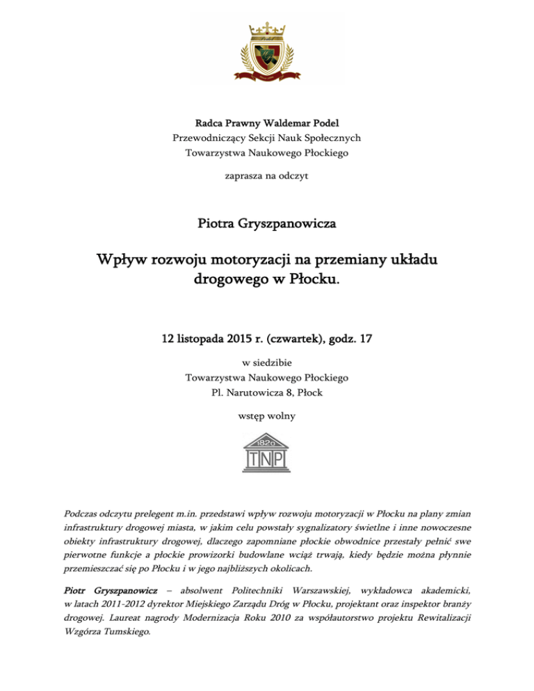 Radca Prawny Waldemar Podel Przewodniczący Sekcji Nauk Społecznych Towarzystwa Naukowego Płockiego zaprasza na odczyt Piotra Gryszpanowicza Wpływ rozwoju motoryzacji na przemiany układu drogowego w Płocku. 12 listopada 2015 r. (czwartek), godz. 17 w siedzibie Towarzystwa Naukowego Płockiego Pl. Narutowicza 8, Płock wstęp wolny Podczas odczytu prelegent m.in. przedstawi wpływ rozwoju motoryzacji w Płocku na plany zmian infrastruktury drogowej miasta, w jakim celu powstały sygnalizatory świetlne i inne nowoczesne obiekty infrastruktury drogowej, dlaczego zapomniane płockie obwodnice przestały pełnić swe pierwotne funkcje a płockie prowizorki budowlane wciąż trwają, kiedy będzie można płynnie przemieszczać się po Płocku i w jego najbliższych okolicach. Piotr Gryszpanowicz – absolwent Politechniki Warszawskiej, wykładowca akademicki, w latach 2011-2012 dyrektor Miejskiego Zarządu Dróg w Płocku, projektant oraz inspektor branży drogowej. Laureat nagrody Modernizacja Roku 2010 za współautorstwo projektu Rewitalizacji Wzgórza Tumskiego.