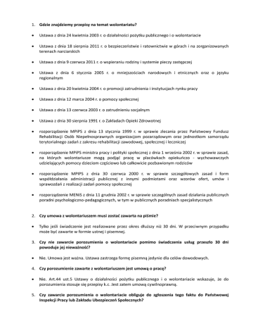1. Gdzie znajdziemy przepisy na temat wolontariatu? Ustawa z dnia 24 kwietnia 2003 r. o działalności pożytku publicznego i o wolontariacie Ustawa z dnia 18 sierpnia 2011 r. o bezpieczeństwie i ratownictwie w górach i na zorganizowanych terenach narciarskich Ustawa z dnia 9 czerwca 2011 r. o wspieraniu rodziny i systemie pieczy zastępczej Ustawa z dnia 6 stycznia 2005 r. o mniejszościach narodowych i etnicznych oraz o języku regionalnym Ustawa z dnia 20 kwietnia 2004 r. o promocji zatrudnienia i instytucjach rynku pracy Ustawa z dnia 12 marca 2004 r. o pomocy społecznej Ustawa z dnia 13 czerwca 2003 r. o zatrudnieniu socjalnym Ustawa z dnia 30 sierpnia 1991 r. o Zakładach Opieki Zdrowotnej rozporządzenie MPiPS z dnia 13 stycznia 1999 r. w sprawie zlecania przez Państwowy Fundusz Rehabilitacji Osób Niepełnosprawnych organizacjom pozarządowym oraz jednostkom samorządu terytorialnego zadań z zakresu rehabilitacji zawodowej, społecznej i leczniczej rozporządzenie MPiPS ministra pracy i polityki społecznej z dnia 1 września 2002 r. w sprawie zasad, na których wolontariusze mogą podjąć pracę w placówkach opiekuńczo - wychowawczych udzielających pomocy dzieciom częściowo lub całkowicie pozbawionym rodziców rozporządzenie MPIPS z dnia 30 czerwca 2000 r. w sprawie szczegółowych zasad i form współdziałania administracji publicznej z innymi podmiotami oraz wzorów ofert, umów i sprawozdań z realizacji zadań pomocy społecznej rozporządzenie MENiS z dnia 11 grudnia 2002 r. w sprawie szczególnych zasad działania publicznych poradni psychologiczno-pedagogicznych, w tym w publicznych poradniach specjalistycznych 2. Czy umowa z wolontariuszem musi zostać zawarta na piśmie? Tylko jeśli świadczenie jest realizowane przez okres dłuższy niż 30 dni. W przeciwnym przypadku może być zawarte w formie ustnej i pisemnej. 3. Czy nie zawarcie porozumienia o wolontariacie pomimo świadczenia usług przeszło 30 dni powoduje jej nieważność? Nie. Umowa jest ważna. Ustawa zastrzega formę pisemną jedynie dla celów dowodowych. 4. Czy porozumienie zawarte z wolontariuszem jest umową o pracę? Nie. Art.44 ust.5 Ustawy o działalności pożytku publicznego i o wolontariacie wskazuje, że do porozumienia stosuje się przepisy k.c. Jest zatem umową cywilnoprawną. 5. Czy zawarcie porozumienia o wolontariacie obliguje do zgłoszenia tego faktu do Państwowej Inspekcji Pracy lub Zakładu Ubezpieczeń Społecznych? Nie ma takiego obowiązku. 6. Jak rozwiązać porozumienie? Jak wskazano wyżej porozumienie może być zawarte ustnie, jak i pisemnie. Niekiedy należy sporządzić je w formie pisemnej. Przepisy nie wskazują natomiast jak rozwiązywać porozumienie. Należy przyjąć zachowanie analogiczne. Ustne porozumienie możemy rozwiązać pisemnie i ustnie, zaś porozumienie zawarte w formie pisemnej możemy dla celów dowodowych rozwiązać również pisemnie (zwłaszcza w przypadkach świadczenia przez okres przeszło 30 dni). 7. Kto może zostać wolontariuszem? Każdy, kto ochotniczo i bez wynagrodzenia wykonuje świadczenia, na zasadach określonych w ustawie W tym : osoby bezrobotne, zarówno zarejestrowane w Urzędzie Pracy, jak i nie, tak samo bezrobotni z prawem do zasiłku dla osób bezrobotnych i bez takiego prawa. Wykonywanie przez nie świadczenia nie powoduje utraty statusu bezrobotnego i prawa do zasiłku dla osób bezrobotnych cudzoziemiec legalnie przebywający w Polsce. Nie musi uzyskiwać pozwolenia na pracę, gdyż usługa woluntarystyczna nie jest pracą członek stowarzyszenia małoletni, którzy ukończyli przynajmniej 13 lat za zgodą przedstawiciela ustawowego osoba niepełnosprawna osoba ubezwłasnowolniona częściowo za zgodą kuratora ustanowionego przez sąd 8. Czy wolontariusz może wykonywać każdą usługę? Wolontariusz powinien posiadać kwalifikacje odpowiadające rodzajowi wykonywanego świadczenia. W praktyce oznacza to, że nie może wykonywać każdej pracy. Posługując się przykładem, jeśli usługa dotyczy świadczenia nie wymagającego wiedzy, umiejętności specjalistycznych to każdy może wykonywać pracę woluntarystyczną, natomiast jeśli przepisy prawa wymagają szczególnych kwalifikacji, np. lekarz weterynarii to wolontariuszem leczącym zwierzęta może być tylko osoba mająca wymagane kwalifikacje – lekarz weterynarii. 9. Czy wolontariusz jest pracownikiem? Nie. Świadczenie usług przez wolontariusza nie powoduje nabycia jakichkolwiek uprawnień pracowniczych, czy z zakresu zabezpieczenia społecznego (poza przypadkami wyraźnie wskazanymi w przepisach prawa). Tym samym nie ma żądnego wpływu na, np. staż pracy, prawo do urlopu wypoczynkowego, prawo do renty, emerytury, czy ich wysokość. 10. W jakich instytucjach można świadczyć usługi woluntarystyczne? organizacje pozarządowe stowarzyszenia jednostek samorządu terytorialnego, np. związki gmin lub powiatów spółdzielnie socjalne osoby prawne i jednostki organizacyjne kościoła katolickiego i innych kościołów lub związków wyznaniowych spółki akcyjne i spółki z o.o. kluby sportowe, będące spółkami organy administracji publicznej – centralnej i samorządowej jednostki organizacyjne podległe organom administracji publicznej lub nadzorowane przez te organy m.in.: szkoły i inne placówki oświatowe, instytucje kultury: teatry, biblioteki, muzea, galerie, OPS, domy opieki społecznej, PCPR, ośrodki interwencji kryzysowej, placówki opiekuńczo-wychowawcze zakłady opieki zdrowotnej Niedopuszczalne jest jednak wykonywania świadczenia w ramach działalności gospodarczej jednego z w/w podmiotów. 11. Jakie są podstawowe uprawnienia wolontariusza? zaopatrzenie z tytułu wypadku przy wykonywaniu świadczeń (jeżeli były wykonywane przez co najmniej 30 dni) prawo uzyskania potwierdzenia treść porozumienia na piśmie prawo żądania wydania na piśmie zaświadczenia i opinii o wykonywaniu świadczeń prawo do poznania swoich pr