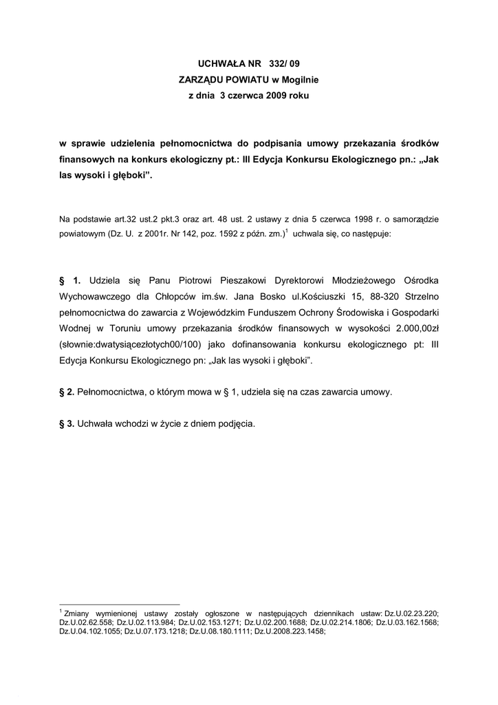 UCHWAŁA NR 332/ 09 ZARZĄDU POWIATU w Mogilnie z dnia 3 czerwca 2009 roku w sprawie udzielenia pełnomocnictwa do podpisania umowy przekazania środków finansowych na konkurs ekologiczny pt.: III Edycja Konkursu Ekologicznego pn.: „Jak las wysoki i głęboki”. Na podstawie art.32 ust.2 pkt.3 oraz art. 48 ust. 2 ustawy z dnia 5 czerwca 1998 r. o samorządzie powiatowym (Dz. U. z 2001r. Nr 142, poz. 1592 z późn. zm.)1 uchwala się, co następuje: § 1. Udziela się Panu Piotrowi Pieszakowi Dyrektorowi Młodzieżowego Ośrodka Wychowawczego dla Chłopców im.św. Jana Bosko ul.Kościuszki 15, 88-320 Strzelno pełnomocnictwa do zawarcia z Wojewódzkim Funduszem Ochrony Środowiska i Gospodarki Wodnej w Toruniu umowy przekazania środków finansowych w wysokości 2.000,00zł (słownie:dwatysiącezłotych00/100) jako dofinansowania konkursu ekologicznego pt: III Edycja Konkursu Ekologicznego pn: „Jak las wysoki i głęboki”. § 2. Pełnomocnictwa, o którym mowa w § 1, udziela się na czas zawarcia umowy. § 3. Uchwała wchodzi w życie z dniem podjęcia. 1 Zmiany wymienionej ustawy zostały ogłoszone w następujących dziennikach ustaw: Dz.U.02.23.220; Dz.U.02.62.558; Dz.U.02.113.984; Dz.U.02.153.1271; Dz.U.02.200.1688; Dz.U.02.214.1806; Dz.U.03.162.1568; Dz.U.04.102.1055; Dz.U.07.173.1218; Dz.U.08.180.1111; Dz.U.2008.223.1458; UZASADNIENIE do uchwały nr 332 / 09 Zarządu Powiatu w Mogilnie z dnia 3 czerwca 2009 roku w sprawie udzielenia pełnomocnictwa do podpisania umowy przekazania środków finansowych na konkurs ekologiczny pt.: III Edycja Konkursu Ekologicznego pn.: „Jak las wysoki i głęboki”. Dyrektor MOW w Strzelnie pismem z dnia 22 maja 2009r. zwrócił się do Zarządu Powiatu w Mogilnie o udzielenie pełnomocnictwa do podpisania umowy dofinansowania z Wojewódzkim Funduszem Ochrony Środowiska i Gospodarki Wodnej w Toruniu konkursu ekologicznego pt.: III Edycja Konkursu Ekologicznego pn.: „Jak las wysoki i głęboki”. Podjęciu uchwały jest uzasadnione.