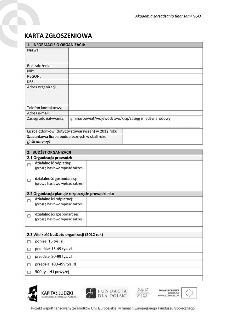 Akademia zarządzania finansami NGO KARTA ZGŁOSZENIOWA 1. INFORMACJE O ORGANIZACJI: Nazwa: Rok założenia: NIP: REGON: KRS: Adres organizacji: Telefon kontaktowy: Adres e-mail: Zasięg oddziaływania: gmina/powiat/województwo/kraj/zasięg międzynarodowy ………………………………………………………………………….……………….……………………………………………………………….…………………………………………………………………………………………………..…. Liczba członków (dotyczy stowarzyszeń) w 2012 roku: Szacunkowa liczba podopiecznych w skali roku: (jeśli dotyczy) 2. BUDŻET ORGANIZACJI 2.1 Organizacja prowadzi: □ działalność odpłatną: (proszę hasłowo wpisać zakres) □ działalność gospodarczą: (proszę hasłowo wpisać zakres) 2.2 Organizacja planuje rozpoczęcie prowadzenia: □ działalności odpłatnej: (proszę hasłowo wpisać zakres) □ działalności gospodarczej: (proszę hasłowo wpisać zakres) 2.3 Wielkość budżetu organizacji (2012 rok) □ □ □ □ □ poniżej 15 tys. zł przedział 15-49 tys. zł przedział 50-99 tys. zł przedział 100-499 tys. zł 500 tys. zł i powyżej Akademia zarządzania finansami NGO 2.3 Główne źródła przychodów za 2012 rok (proszę zaznaczyć i posegregować od 1 - największy udział w budżecie do 9 - najniższy udział) □ □ □ □ □ □ □ □ □ składki członkowskie ……………………… wpłaty 1% ……………………… projekty UE ……………………… działalność gospodarcza ……………………… działalność odpłatna ……………………… darowizny ……………………… sponsoring ……………………… dotacje samorządowe i rządowe ……………………… Inne, jakie: …………………………………………………………………………………..……………………………………………………………………………………………..…………………………. ……………………… 3. KADRY ORGANIZACJI: Liczba pracowników w 2012 roku: a) zatrudnionych w ramach umów o pracę b) zatrudnionych w ramach umów cywilnoprawnych c) samozatrudnionych zaangażowanych w działalność organizacji d) wolontariuszy Kto prowadzi księgowość w podmiocie: □ pracownik; □ wolontariusz; □ biuro rachunkowe; □ …………………………….…………………………….…………………………….……………………………. 4. OCZEKIWANIA WOBEC TEMATYKI SZKOLEŃ (proszę zaznaczyć najbardziej oczekiwane) Monitoring płynności finansowej Działalność odpłatna i gospodarcza w NGO □ organizacja jako jeden organizm □ cechy dobrego budżetu organizacji □ cele finansowe organizacji □ kategorie kosztów □ przychody - dywersyfikacja źródeł finansowania □ metodologia dzielenia kosztów stałych □ budżety projektów a wartość dodana organizacji □ monitoring budżetu (menadżerski i księgowy) □ obieg dokumentów w organizacji □ przepływy finansowe projektów i w organizacji □ kontrola finansów (jak czytać zapisy na koncie) □ analiza sprawozdania finansowego □ inne: ………………………………………………………………………………………………………………………………….… ………………………………………………………………………………………………………………………………….… □ formy prawne ekonomii społecznej □ prawne ograniczenia działalności odpłatnej □ działalność odpłatna a gospodarcza □ planowanie działalności ekonomicznej w organizacji □ biznesplan w organizacji pozarządowej □ źródła finansowania działalności ekonomicznej □ strategia wdrażania przedsięwzięć ekonomicznych □ inne: ………………………………………………………………………………………………………………………………….… ………………………………………………………………………………………………………………………………….… Akademia zarządzania finansami NGO 5. ZAPOTRZEBOWANIE NA DORADZTWO (które z elementów szkoleń wymagają indywidualnych konsultacji w organizacji) 6. UZASADNIENIE POTRZEBY UCZESTNICTWA W PROJEKCIE: Pieczęć i podpis przedstawiciela Organizacji (zgodnie z KRS) Akademia zarządzania finansami NGO 7. DANE PRZEDSTAWICIELI ORGANIZACJI ZGŁASZANYCH DO UDZIAŁU W PROJEKCIE osoby zarządzającej organizacją osoby odpowiedzialnej za księgowość [szefowie jednostek, podmiotu koordynatorzy] Imię i nazwisko: Funkcja w podmiocie lub stanowisko pracy: Forma zaangażowania: □ umowa o pracę □ umowa cywilno-prawna □ samozatrudnienie □ wolontariat □ członkostwo □ umowa o pracę □ umowa cywilno-prawna □ samozatrudnienie □ wolontariat □ członkostwo Rok rozpoczęcia współpracy z organizacją: Doświadczenia w NGO (proszę podać liczbę lat): Telefon kontaktowy: Adres e-mail: Podpisy: Wypełnione zgłoszenie należy przesłać w terminie do 11 marca 2013 roku do Pomorskiej Fundacji Rozwoju, Kultury i Sztuki w Toruniu faksem na numer 56 652 23 56 lub e-mailem na adres [email protected] Po otrzymaniu karty zgłoszeniowej będziemy się kontaktować telefonicznie w sprawie potwierdzenia zakwalifikowania udziału w projekcie oraz szczegółowych warunków uczestnictwa. Pomorska Fundacja Rozwoju, Kultury i Sztuki Regionalne Centrum Ekonomii Społecznej ul. Szewska 17, 87-100 Toruń tel. 56 651 82 78; fax 56 652 23 56 www.rces.torun.pl; e-mail: [email protected]