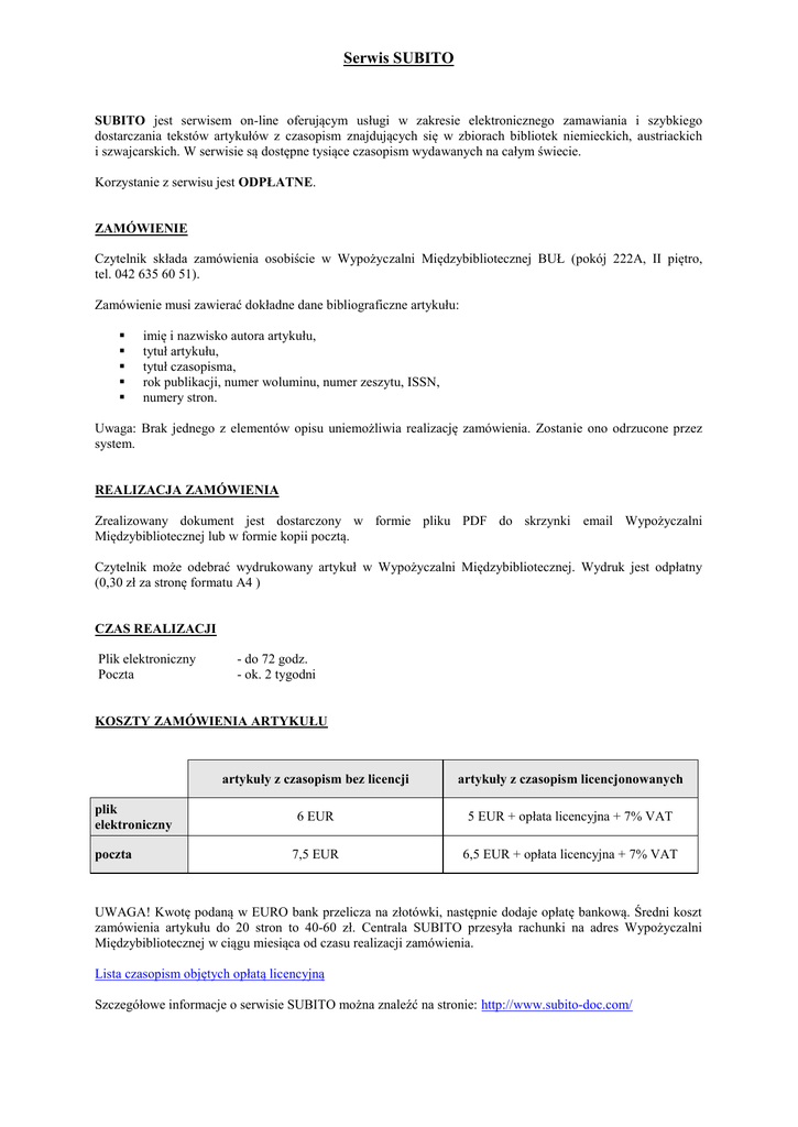 Serwis SUBITO SUBITO jest serwisem on-line oferującym usługi w zakresie elektronicznego zamawiania i szybkiego dostarczania tekstów artykułów z czasopism znajdujących się w zbiorach bibliotek niemieckich, austriackich i szwajcarskich. W serwisie są dostępne tysiące czasopism wydawanych na całym świecie. Korzystanie z serwisu jest ODPŁATNE. ZAMÓWIENIE Czytelnik składa zamówienia osobiście w Wypożyczalni Międzybibliotecznej BUŁ (pokój 222A, II piętro, tel. 042 635 60 51). Zamówienie musi zawierać dokładne dane bibliograficzne artykułu: imię i nazwisko autora artykułu, tytuł artykułu, tytuł czasopisma, rok publikacji, numer woluminu, numer zeszytu, ISSN, numery stron. Uwaga: Brak jednego z elementów opisu uniemożliwia realizację zamówienia. Zostanie ono odrzucone przez system. REALIZACJA ZAMÓWIENIA Zrealizowany dokument jest dostarczony w formie pliku PDF do skrzynki email Wypożyczalni Międzybibliotecznej lub w formie kopii pocztą. Czytelnik może odebrać wydrukowany artykuł w Wypożyczalni Międzybibliotecznej. Wydruk jest odpłatny (0,30 zł za stronę formatu A4 ) CZAS REALIZACJI Plik elektroniczny Poczta - do 72 godz. - ok. 2 tygodni KOSZTY ZAMÓWIENIA ARTYKUŁU plik elektroniczny poczta artykuły z czasopism bez licencji artykuły z czasopism licencjonowanych 6 EUR 5 EUR + opłata licencyjna + 7% VAT 7,5 EUR 6,5 EUR + opłata licencyjna + 7% VAT UWAGA! Kwotę podaną w EURO bank przelicza na złotówki, następnie dodaje opłatę bankową. Średni koszt zamówienia artykułu do 20 stron to 40-60 zł. Centrala SUBITO przesyła rachunki na adres Wypożyczalni Międzybibliotecznej w ciągu miesiąca od czasu realizacji zamówienia. Lista czasopism objętych opłatą licencyjną Szczegółowe informacje o serwisie SUBITO można znaleźć na stronie: http://www.subito-doc.com/