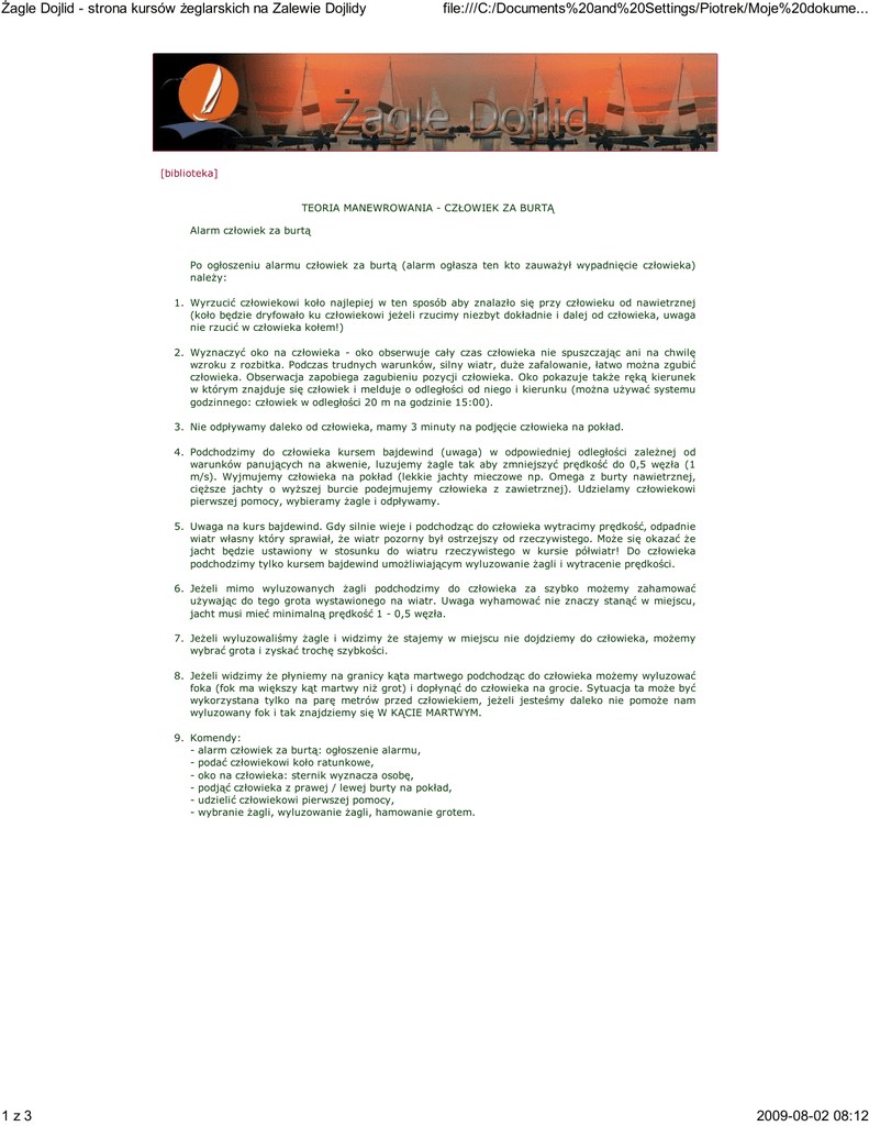 śagle Dojlid - strona kursów Ŝeglarskich na Zalewie Dojlidy file:///C:/Documents%20and%20Settings/Piotrek/Moje%20dokume... [biblioteka] TEORIA MANEWROWANIA - CZŁOWIEK ZA BURTĄ Alarm człowiek za burtą Po ogłoszeniu alarmu człowiek za burtą (alarm ogłasza ten kto zauwaŜył wypadnięcie człowieka) naleŜy: 1. Wyrzucić człowiekowi koło najlepiej w ten sposób aby znalazło się przy człowieku od nawietrznej (koło będzie dryfowało ku człowiekowi jeŜeli rzucimy niezbyt dokładnie i dalej od człowieka, uwaga nie rzucić w człowieka kołem!) 2. Wyznaczyć oko na człowieka - oko obserwuje cały czas człowieka nie spuszczając ani na chwilę wzroku z rozbitka. Podczas trudnych warunków, silny wiatr, duŜe zafalowanie, łatwo moŜna zgubić człowieka. Obserwacja zapobiega zagubieniu pozycji człowieka. Oko pokazuje takŜe ręką kierunek w którym znajduje się człowiek i melduje o odległości od niego i kierunku (moŜna uŜywać systemu godzinnego: człowiek w odległości 20 m na godzinie 15:00). 3. Nie odpływamy daleko od człowieka, mamy 3 minuty na podjęcie człowieka na pokład. 4. Podchodzimy do człowieka kursem bajdewind (uwaga) w odpowiedniej odległości zaleŜnej od warunków panujących na akwenie, luzujemy Ŝagle tak aby zmniejszyć prędkość do 0,5 węzła (1 m/s). Wyjmujemy człowieka na pokład (lekkie jachty mieczowe np. Omega z burty nawietrznej, cięŜsze jachty o wyŜszej burcie podejmujemy człowieka z zawietrznej). Udzielamy człowiekowi pierwszej pomocy, wybieramy Ŝagle i odpływamy. 5. Uwaga na kurs bajdewind. Gdy silnie wieje i podchodząc do człowieka wytracimy prędkość, odpadnie wiatr własny który sprawiał, Ŝe wiatr pozorny był ostrzejszy od rzeczywistego. MoŜe się okazać Ŝe jacht będzie ustawiony w stosunku do wiatru rzeczywistego w kursie półwiatr! Do człowieka podchodzimy tylko kursem bajdewind umoŜliwiającym wyluzowanie Ŝagli i wytracenie prędkości. 6. JeŜeli mimo wyluzowanych Ŝagli podchodzimy do człowieka za szybko moŜemy zahamować uŜywając do tego grota wystawionego na wiatr. Uwaga wyhamować nie znaczy stanąć w miejscu, jacht musi mieć minimalną prędkość 1 - 0,5 węzła. 7. JeŜeli wyluzowaliśmy Ŝagle i widzimy Ŝe stajemy w miejscu nie dojdziemy do człowieka, moŜemy wybrać grota i zyskać trochę szybkości. 8. JeŜeli widzimy Ŝe płyniemy na granicy kąta martwego podchodząc do człowieka moŜemy wyluzować foka (fok ma większy kąt martwy niŜ grot) i dopłynąć do człowieka na grocie. Sytuacja ta moŜe być wykorzystana tylko na parę metrów przed człowiekiem, jeŜeli jesteśmy daleko nie pomoŜe nam wyluzowany fok i tak znajdziemy się W KĄCIE MARTWYM. 9. Komendy: - alarm człowiek za burtą: ogłoszenie alarmu, - podać człowiekowi koło ratunkowe, - oko na człowieka: sternik wyznacza osobę, - podjąć człowieka z prawej / lewej burty na pokład, - udzielić człowiekowi pierwszej pomocy, - wybranie Ŝagli, wyluzowanie Ŝagli, hamowanie grotem. 1z3 2009-08-02 08:12 śagle Dojlid - strona kursów Ŝeglarskich na Zalewie Dojlidy file:///C:/Documents%20and%20Settings/Piotrek/Moje%20dokume... Metoda półwiatrowa, niezaleŜnie od kursu w jakim wypadnie nam człowiek, natychmiast kierujemy jacht do półwiatru. Metoda pętli rufowej, człowiek wypada gdy jacht płynie bajdewindem. Metoda półwiatrowa, człowiek wypada gdy jacht płynie półwiatrem. 2z3 2009-08-02 08:12 śagle Dojlid - strona kursów Ŝeglarskich na Zalewie Dojlidy file:///C:/Documents%20and%20Settings/Piotrek/Moje%20dokume... LITERATURA 1. "śeglarz i Sternik Jachtowy" - A. Kolaszewski, P. Świdwiński Opracowała: Beata Bogdanowicz http://www.bear.w.pl/ [email protected] ^ Kontakt: [email protected] 3z3 2009-08-02 08:12