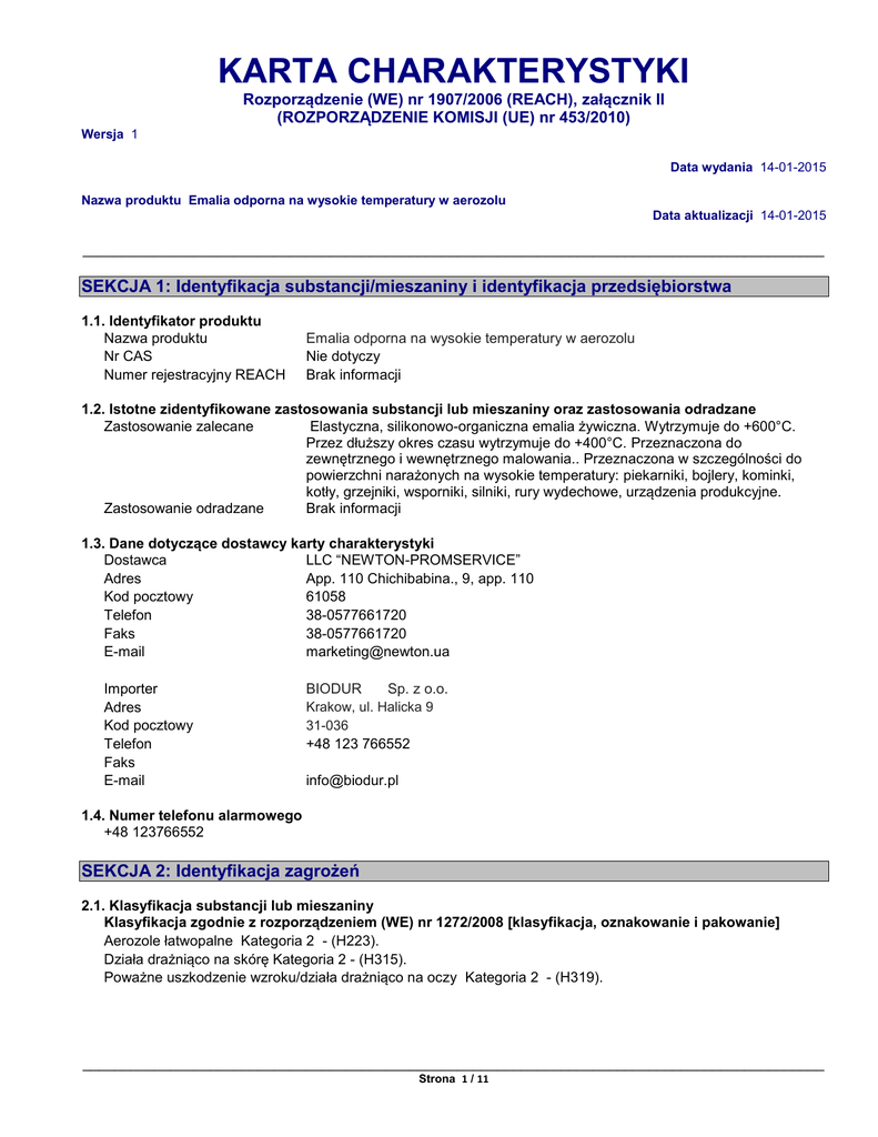 KARTA CHARAKTERYSTYKI Rozporządzenie (WE) nr 1907/2006 (REACH), załącznik II (ROZPORZĄDZENIE KOMISJI (UE) nr 453/2010) Wersja 1 Data wydania 14-01-2015 Nazwa produktu Emalia odporna na wysokie temperatury w aerozolu Data aktualizacji 14-01-2015 _____________________________________________________________________________________________ SEKCJA 1: Identyfikacja substancji/mieszaniny i identyfikacja przedsiębiorstwa 1.1. Identyfikator produktu Nazwa produktu Nr CAS Numer rejestracyjny REACH Emalia odporna na wysokie temperatury w aerozolu Nie dotyczy Brak informacji 1.2. Istotne zidentyfikowane zastosowania substancji lub mieszaniny oraz zastosowania odradzane Zastosowanie zalecane Elastyczna, silikonowo-organiczna emalia żywiczna. Wytrzymuje do +600°C. Przez dłuższy okres czasu wytrzymuje do +400°C. Przeznaczona do zewnętrznego i wewnętrznego malowania.. Przeznaczona w szczególności do powierzchni narażonych na wysokie temperatury: piekarniki, bojlery, kominki, kotły, grzejniki, wsporniki, silniki, rury wydechowe, urządzenia produkcyjne. Zastosowanie odradzane Brak informacji 1.3. Dane dotyczące dostawcy karty charakterystyki Dostawca LLC “NEWTON-PROMSERVICE” Adres App. 110 Chichibabina., 9, app. 110 Kod pocztowy 61058 Telefon 38-0577661720 Faks 38-0577661720 E-mail [email protected] Importer Adres Kod pocztowy Telefon Faks E-mail BIODUR Sp. z o.o. Krakow, ul. Halicka 9 31-036 +48 123 766552 [email protected] 1.4. Numer telefonu alarmowego +48 123766552 SEKCJA 2: Identyfikacja zagrożeń 2.1. Klasyfikacja substancji lub mieszaniny Klasyfikacja zgodnie z rozporządzeniem (WE) nr 1272/2008 [klasyfikacja, oznakowanie i pakowanie] Aerozole łatwopalne Kategoria 2 - (H223). Działa drażniąco na skórę Kategoria 2 - (H315). Poważne uszkodzenie wzroku/działa drażniąco na oczy Kategoria 2 - (H319). _____________________________________________________________________________________________ Strona 1 / 11 Nazwa produktu Emalia odporna na wysokie temperatury w aerozolu Data aktualizacji 14-01-2015 Toksyczność szczególna na organ docelowy (pojedyncze narażenie Kategoria 3 - (H336). Klasyfikacja zgodnie z Dyrektywą 67/548/EEC lub 1999/45/EC Xi; R36 R67 Xi; R38 2.2. Elementy oznakowania Symbole/piktogramy Słowo sygnalizujące Zwroty H Ostrzeżenie H223 - Aerozol łatwopalny. H315 - Działa drażniąco na skórę. H319 - Działa silnie drażniąco na oczy. H336 - Może wywoływać uczucie senności lub zawroty głowy. P261 - Unikać wdychania pyłu/dymu/gazu/mgły/par/rozpylonej cieczy. P271 - Stosować wyłącznie na zewnątrz lub w dobrze wentylowanym pomieszczeniu. P280 - Stosować rękawice ochronne/odzież ochronną/ochronę oczu/ochronę twarzy. P210 - Przechowywać z dala od źródeł ciepła/iskrzenia/otwartego ognia/gorących powierzchni. - Palenie wzbronione. P211 - Nie rozpylać nad otwartym ogniem lub innym źródłem zapłonu. P251 - Pojemnik pod ciśnieniem. Nie przekłuwać ani nie spalać, nawet po zużyciu. P305 + P351 + P338 - W PRZYPADKU DOSTANIA SIĘ DO OCZU: Ostrożnie płukać wodą przez kilka minut. Wyjąć soczewki kontaktowe, jeżeli są i można je łatwo usunąć. Kontynuować płukanie. P405 - Przechowywać pod zamknięciem. P410 + P412 - Chronić przed światłem słonecznym. Nie wystawiać na działanie temperatury przekraczającej 50 °C/ 122°F. P501 - Zawartość/ pojemnik usuwać do autoryzowanego zakładu utylizacji odpadów. Zwroty P 2.3. Inne zagrożenia Brak informacji SEKCJA 3: Skład/informacja o składnikach 3.1 Mieszanina Nazwa chemiczna Nr EC Nr CAS Masa-% Klasyfikacja zgodnie z Dyrektywą 67/548/EEC lub 1999/45/EC Butan 203-448-7 106-97-8 16-40 F+; R12 Propan 200-827-9 74-98-6 4-10 F+; R12 Emalia alkidowa - - 20-35 R10 Xi; R38 Klasyfikacja zgodnie z rozporządzeniem (WE) nr 1272/2008 [klasyfikacja, oznakowanie i pakowanie] Gaz łatwopalny 1 (H220) Gaz pod ciśnieniem Gaz łatwopalny 1 (H220) Gaz pod ciśnieniem Ciecz łatwopalna 3 (H226) Drażniąca dla skóry 2 (H315) _____________________________________________________________________________________________ Strona 2 / 11 Nazwa produktu Emalia odporna na wysokie temperatury w aerozolu Octan metylu 201-185-2 79-20-9 16.5-24.75 Octan etylu 205-500-4 141-78-6 9-13.5 Octan butylu 204-658-1 123-86-4 4.5-6.75 Data aktualizacji 14-01-2015 F; R11 Xi; R36 R66 R67 F; R11 Xi; R36 R66 R67 R10 R66 R67 Drażniący dla oczu 2 (H319) (EUH066) STOT SE 3 (H336) Ciecz łatwopalna 2 (H225) Drażniący dla oczu 2 (H319) (EUH066) STOT SE 3 (H336) Ciecz łatwopalna 2 (H225) (EUH066) STOT SE 3 (H336) Ciecz łatwopalna 3 (H226) SEKCJA 4: Środki pierwszej pomocy 4.1. Opis środków pierwszej pomocy Zalecenia ogólne Zdjąć zanieczyszczoną odzież i obuwie. Jeśli symptomy nie ustępują to wezwać lekarza. Wdychanie JEŚLI ZOSTANIE WCHŁONIĘTY PRZEZ WDYCHANIE: Przenieść ofiarę na świeże powietrze i pozwolić odpoczywać w pozycji wygodnej do oddychania. W przypadku złego samopoczucia zasięgnąć porady lekarskiej. Kontakt ze skórą Natychmiast umyć mydłem i dużą ilością wody oraz zdjąć zanieczyszczoną odzież i obuwie. Przed ponownym użyciem zanieczyszczonej odzieży należy ją wyprać. Jeśli podrażnienie skóry nie ustępuje to wezwać lekarza. Kontakt z oczami W PRZYPADKU DOSTANIA SIĘ DO OCZU: Przez kilka minut ostrożnie płukać wodą. Zdjąć soczewki kontaktowe, jeśli są i łatwo to zrobić. Kontynuować płukanie. Jeśli podrażnienie oczu nie ustępuje: Zasięgnąć porady lekarskiej. Spożycie Przepłukać usta. Zasięgnąć porady lekarskiej. Nigdy nie podawać nic doustnie osobie nieprzytomnej. 4.2. Najważniejsze ostre i opóźnione objawy oraz skutki narażenia Brak informacji 4.3. Wskazania dotyczące wszelkiej natychmiastowej pomocy lekarskiej i szczególnego postępowania z poszkodowanym Leczyć objawowo. SEKCJA 5: Postępowanie w przypadku pożaru 5.1. Środki gaśnicze Odpowiednie środki gaśnicze Nieodpowiednie środki gaśnicze CO2 lub suche środk