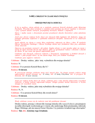 1 S-002. CHRZEST W CZASIE MSZY ŚWIĘTEJ OBRZĘD PRZYJĘCIA DZIECKA O ile to możliwe, chrztu udziela się w niedzielę, ponieważ Kościół obchodzi wtedy Misterium Paschalne. Wszystkie dzieci urodzone w ostatnim czasie powinno się chrzcić wspólnie, w obecności i przy czynnym udziale wiernych, przynajmniej krewnych, bliskich i znajomych. Ojciec i matka razem z chrzestnymi powinni przedstawić dziecko Kościołowi celem udzielenia chrztu. Jeżeli przy chrzcie większej liczby dzieci jest obecnych kilku kapłanów lub diakonów, mogą oni pomagać głównemu szafarzowi w spełnianiu niektórych obrzędów. Zaznaczono to we właściwym miejscu. Jeżeli udziela się chrztu w czasie Mszy niedzielnej, odprawia się Mszę z dnia. W niedziele Okresu Narodzenia Pańskiego i Okresu Zwykłego można użyć formularza Mszy przy udzielaniu chrztu dzieciom. Opuszcza się powitanie wiernych i akt pokuty. Kapłan ubrany w szaty mszalne udaje się razem z asystą do drzwi kościoła lub do tego miejsca, gdzie są zgromadzeni rodzice i chrzestni z dziećmi do chrztu. W tym czasie lud śpiewa odpowiednia pieśń. Celebrans wita obecnych, zwłaszcza rodziców i chrzestnych, wspominając w krótkich słowach o radości, z jaka przyjęli dzieci: są one darem Boga, który jest źródłem wszelkiego Celebrans pyta najpierw rodziców: Celebrans: Drodzy rodzice, jakie imię wybraliście dla swojego dziecka? Rodzice: N. Celebrans: O co prosicie Kościół Boży dla N.? Rodzice: O chrzest. W powyższym dialogu celebrans może użyć innych słów. Na drugie pytanie rodzice mogą odpowiedzieć innymi słowami, np.: O wiarę, lub: O łaskę Chrystusa, lub: O przyjęcie do Kościoła, lub: O życie wieczne. Jeżeli jest większa liczba dzieci do chrztu, celebrans pyta o imię dziecka jednocześnie wszystkich rodziców, a każda rodzina odpowiada kolejno. Drugie pytanie można skierować w liczbie mnogiej do wszystkich razem. Celebrans: Drodzy rodzice, jakie imię wybraliście dla swojego dziecka? Rodzice: N., N. Celebrans: O co prosicie Kościół Boży dla swoich dzieci? Rodzice: O chrzest. Wtedy celebrans zwraca się do rodziców tymi lub podobnymi słowami: Drodzy rodzice, prosząc o chrzest dla waszego dziecka (dla waszych dzieci), przyjmujecie na siebie obowiązek wychowania go w wierze, aby zachowując Boże przykazania, miłowało Boga i bliźniego, jak nas nauczył Jezus Chrystus. Czy jesteście świadomi tego obowiązku? Rodzice: Tak albo: Jesteśmy tego świadomi. 2 Odpowiedź tę dają poszczególne rodziny; jeżeli jest większa liczba dzieci do chrztu, wszystkie rodziny mogą odpowiedzieć równocześnie. Następnie zwracając się do chrzestnych, celebrans pyta ich w ten lub podobny sposób A wy, drodzy chrzestni, czy jesteście gotowi (czy jesteś gotowy, gotowa) pomagać rodzicom tego dziecka w wypełnianiu ich obowiązku? Chrzestni odpowiadają: Jesteśmy gotowi (jestem gotowy, gotowa). Celebrans mówi dalej: N. (albo: Drogie dzieci), wspólnota chrześcijańska przyjmuje cię z wielką radością. W imieniu tej wspólnoty znaczę cię znakiem krzyża. Po mnie wy, rodzice i chrzestni, naznaczcie wasze dziecko znakiem Jezusa Chrystusa, naszego Zbawiciela. I w milczeniu kreśli znak krzyża na czole dziecka. Potem czynią to rodzice i chrzestni. Celebrans zaprasza rodziców i chrzestnych, aby udali się na miejsca przewidziane dla nich przed ołtarzem. WSTĘPNE OBRZĘDY MSZY Gdy celebrans dojdzie do miejsca przewodniczenia, śpiewa się hymn: Chwała na wysokości Bogu, zgodnie z przepisami mszału. Następnie celebrans śpiewa kolektę. Na czas liturgii słowa Bożego dzieci można przenieść do oddzielnego pomieszczenia. LITURGIA SŁOWA BOŻEGO CZYTANIA BIBLIJNE Czytania bierze się ze Mszy niedzielnej. W Okresie Narodzenia Pańskiego i w Okresie Zwykłym czytania można wziąć ze Mszy obrzędowej (VII tom Lekcjonarza mszalnego) albo z tekstów podanych na str. 8-15. W dni powszednie czytania bierze się ze Mszy obrzędowej. Gdy Msza obrzędowa jest zakazana, można wybrać jedno czytanie z tekstów przewidzianych na chrzest dzieci. Należy wziąć pod uwagę dobro duchowe wiernych oraz charakter dnia liturgicznego. HOMILIA Następnie celebrans wygłasza krótką homilię, wyjaśniając przeczytany tekst i wprowadzając obecnych w głębsze zrozumienie tajemnicy chrztu; zachęca przede wszystkim rodziców i chrzestnych, by ochotnie podjęli obowiązek wynikający z tego sakramentu. Rozważanie w ciszy Po homilii zaleca się chwilę ciszy na rozważanie słowa Bożego. Opuszcza się Wierzę, ponieważ będzie wyznanie wiary przed chrztem. MODLITWA POWSZECHNA Następuje modlitwa powszechna. Można swobodnie wybrać elementy z różnych formuł modlitwy powszechnej albo dołączyć nowe, bardziej dostosowane do szczególnych potrzeb rodziny, należy jednak zachować jedność stylu w całej formule. Na końcu, przed wezwaniem Świętych, dodaje się prośby za Kościół powszechny i za potrzeby całego świata. Zawsze należy zakończyć wezwaniami do Świętych. 3 Wezwani przez Pana jako królewskie kapłaństwo, naród święty i lud nabyty przez Niego na własność, prośmy wszechmogącego Boga o miłosierdzie dla tego dziecka, które ma otrzymać łaskę chrztu świętego, dla jego rodziców, chrzestnych i wszystkich ochrzczonych. Wołajmy do Niego: Wysłuchaj nas, Panie. 1. Prosimy Cię, abyś przez chrzest święty włączył to dziecko do wspólnoty swojego Kościoła. Wszyscy: Wysłuchaj nas, Panie. 2. Prosimy Cię, aby naznaczone krzyżem świętym, przez całe swoje życie odważnie wyznawało Chrystusa, Syna Bożego. 3. Prosimy Cię, aby przez chrzest stało się uczestnikiem Śmierci i Zmartwychwstania Chrystusa. 4. Prosimy Cię, aby to dziecko, pociągnięte słowem i przykładem rodziców i chrzestnych, wzrastało w łasce jako żywy członek Kościoła. 5. Prosimy Cię, abyś we wszystkich tutaj obecnych odnowił łaskę chrztu świętego. 6. Prosimy Cię, aby wszyscy uczniowie 