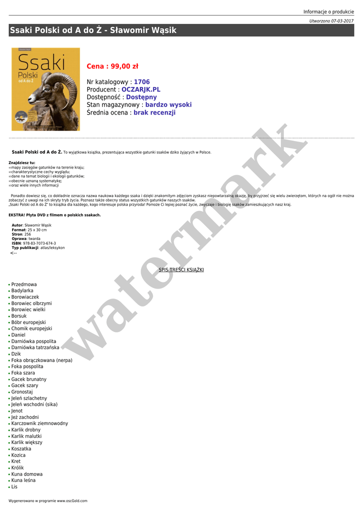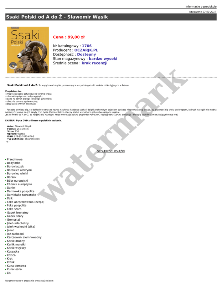 Informacje o produkcie Utworzono 07-03-2017 Ssaki Polski od A do Ż - Sławomir Wąsik Cena : 99,00 zł er m ar k Nr katalogowy : 1706 Producent : OCZARJK.PL Dostępność : Dostępny Stan magazynowy : bardzo wysoki Średnia ocena : brak recenzji Ssaki Polski od A do Ż. To wyjątkowa książka, prezentująca wszystkie gatunki ssaków dziko żyjących w Polsce. Znajdziesz tu: • mapy zasięgów gatunków na terenie kraju; • charakterystyczne cechy wyglądu; • dane na temat biologii i ekologii gatunków; • obecnie uznaną systematykę; • oraz wiele innych informacji Ponadto dowiesz się, co dokładnie oznacza nazwa naukowa każdego ssaka i dzięki znakomitym zdjęciom zyskasz niepowtarzalną okazję, by przyjrzeć się wielu zwierzętom, których na ogół nie można zobaczyć z uwagi na ich skryty tryb życia. Poznasz także obecny status wszystkich gatunków naszych ssaków. „Ssaki Polski od A do Ż” to książka dla każdego, kogo interesuje polska przyroda! Pomoże Ci lepiej poznać życie, zwyczaje i biologię ssaków zamieszkujących nasz kraj. EKSTRA! Płyta DVD z filmem o polskich ssakach. Autor: Sławomir Wąsik Format: 25 x 30 cm Stron: 256 Oprawa: twarda ISBN: 978-83-7073-674-3 Typ publikacji: atlas/leksykon <-- SPIS TREŚCI KSIĄŻKI ● ● ● ● ● ● ● ● ● ● ● ● ● ● ● ● ● ● ● ● ● ● ● ● ● ● ● ● ● ● ● Przedmowa Badylarka Borowiaczek Borowiec olbrzymi Borowiec wielki Borsuk Bóbr europejski Chomik europejski Daniel Darniówka pospolita Darniówka tatrzańska Dzik Foka obrączkowana (nerpa) Foka pospolita Foka szara Gacek brunatny Gacek szary Gronostaj Jeleń szlachetny Jeleń wschodni (sika) Jenot Jeż zachodni Karczownik ziemnowodny Karlik drobny Karlik malutki Karlik większy Koszatka Kozica Kret Królik Kuna domowa Kuna leśna Lis at ● w ● Wygenerowano w programie www.oscGold.com ● ● ● ● ● ● ● ● ● ● ● ● ● ● ● ● ● ● ● ● ● ● ● ● ● ● ● ● ● ● ● ● ● ● ● ● ● ● ● ● ● ● ● ● ● ● ● ● ● ● ● ● ● ● ● ● ● ● ● ● ● ● ● ● er m ar k ● Łasica Łoś Mopek Morświn Mroczek Mroczek pozłocisty Mroczek późny Muflon Mysz domowa Mysz leśna Mysz polna Mysz zaroślowa Mysz zielna Niedźwiedź brunatny Nocek Bechsteina Nocek Brandta Nocek duży Nocek łydkowłosy Nocek Natterera Nocek orzęsiony Nocek rudy Nocek wąsatek Norka amerykańska Norka europejska Nornica ruda Nornik bury Nornik północny Nornik śnieżny Nornik zwyczajny (polnik) Orzesznica Piżmak Podkowiec duży Podkowiec mały Popielica Ryjówka aksamitna Ryjówka górska Ryjówka malutka Ryjówka średnia (białowieska) Ryś Rzęsorek mniejszy Rzęsorek rzeczek Sarna Smużka Smużka stepowa Suseł moręgowany Suseł perełkowany Szczur śniady Szczur wędrowny Szop pracz Świstak Tarpan Tchórz stepowy Tchórz zwyczajny Tur Wiewiórka pospolita Wilk Wydra Zając bielak Zając szarak Zębiełek białawy Zębiełek karliczek Żbik Żołędnica Żubr Systematyka Bibliografia Skorowidz at ● w ● --> OKŁADKA Ssaki Polski do A do Ż Sławomir Wąsik Informacje o produkcie DLACZEGO WARTO KUPIĆ KSIĄŻKI U NAS ● ● ● Uprawa roślin ozdobnych oraz owocowych wymaga niemałej wiedzy praktycznej i teoretycznej, którą to wiedzę nabywamy w trakcie prac pielęgnacyjnych ucząc się samemu na swoich doświadczeniach oraz korzystając z fachowych porad zamieszczanych na stronach internetowych (np. u nas w dziale Porady ogrodnicze) oraz z literatury fachowej. Prawidłowe i nie narażone na straty prowadzenie przydomowego ogrodu oraz działki nie może zaistnieć bez ciągłego poszerzania wiedzy teoretycznej, którą zastosujemy w sezonie wiosenno-letnio-jesiennym. Udostępniamy Państwu tę wiedzę w fachowych tematycznych opracowaniach dostępnych na naszych stronach. Książki oraz czasopisma są pięknie ilustrowane i opisane z naprawdę praktycznym podejściem do tematu, poparte wieloletnim doświadczeniem autora. Proponujemy książki w zakresie szerokiej tematyki ogrodniczej poruszającej tematy uprawy, pielęgnacji, przycinania, sposobu sadzenia, opisów gatunków jak i sporządzania smacznych potraw z dostępnych owoców krzewów i drzew oraz warzyw. U nas książki ogrodnicze tylko w najlepszym wydaniu! w at er m ar k KONIECZNIE ZOBACZ Wygenerowano w programie www.oscGold.com