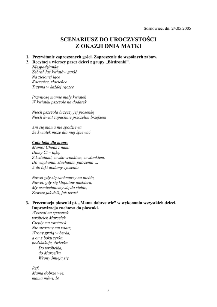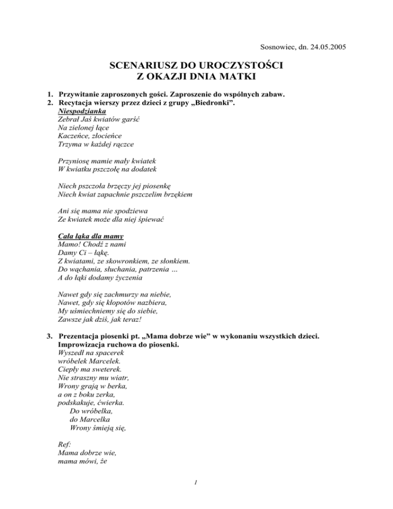 Sosnowiec, dn. 24.05.2005 SCENARIUSZ DO UROCZYSTOŚCI Z OKAZJI DNIA MATKI 1. Przywitanie zaproszonych gości. Zaproszenie do wspólnych zabaw. 2. Recytacja wierszy przez dzieci z grupy „Biedronki”. Niespodzianka Zebrał Jaś kwiatów garść Na zielonej łące Kaczeńce, złocieńce Trzyma w kaŜdej rączce Przyniosę mamie mały kwiatek W kwiatku pszczołę na dodatek Niech pszczoła brzęczy jej piosenkę Niech kwiat zapachnie pszczelim brzękiem Ani się mama nie spodziewa Ze kwiatek moŜe dla niej śpiewać Cała łąka dla mamy Mamo! Chodź z nami Damy Ci – łąkę. Z kwiatami, ze skowronkiem, ze słonkiem. Do wąchania, słuchania, patrzenia … A do łąki dodamy Ŝyczenia Nawet gdy się zachmurzy na niebie, Nawet, gdy się kłopotów nazbiera, My uśmiechniemy się do siebie, Zawsze jak dziś, jak teraz! 3. Prezentacja piosenki pt. „Mama dobrze wie” w wykonaniu wszystkich dzieci. Improwizacja ruchowa do piosenki. Wyszedł na spacerek wróbelek Marcelek. Ciepły ma sweterek. Nie straszny mu wiatr, Wrony grają w berka, a on z boku zerka, podskakuje, ćwierka. Do wróbelka, do Marcelka Wrony śmieją się, Ref: Mama dobrze wie, mama mówi, Ŝe 1 cały wielki świat jest wróbelka wart, I ja cieszę się, Ŝe on ćwierkać chce. Do wróbelka do Marcelka wszyscy śmieją się. Z norki myszka mała ostroŜnie wyjrzała, Bardzo długo spała więc pora juŜ wstać Kot na piecu ziewa, myszka tańczy, śpiewa. I jak tu się gniewać skoro myszka z norki wyszła Ŝeby bawić się. Ref: Mama dobrze wie, mama mówi, Ŝe cały wielki świat jest tej myszki wart. I ja cieszę się, z myszką tańczyć chcę. Bo ta myszka tak wesoło umie bawić się. W trawie biedroneczki znalazły kropeczki. Zaraz sukieneczki w kropeczki chcą mieć, Bardzo się starają, kleją, przyszywają, JuŜ kropeczki mają, Biedroneczki są w kropeczki kaŜdy o tym wie. Ref: Mama rację ma. Przekonałam się. Mama dobrze wie Kiedy mówi, Ŝe cały wielki świat jest na pewno wart małej myszki i biedronki i wróbelka wart. 2 4. Nawiązanie do wykonania makiety „Majowa łąka dla mamy”. Wyjaśnienie mamom oraz dzieciom zadania, które mają wykonać wspólnie przy stolikach. 5. Praca przy stolikach. Wykonanie elementów z kolorowego papieru (motyle, kwiaty, chmury, słońce, biedronki, Ŝaby, trawa), które stanowią wypełnienie makiety. 6. Wspólne umieszczenie wykonanych elementów na przygotowanej przez nauczycielkę makiecie. Dzieci wraz z mamami przypinają swoje prace w odpowiednim miejscu na makiecie. 7. Zabawy integracyjne przy muzyce z płyty CD. a) zabawa w parach (mama i dziecko) pt. „Ja Cię pocałuję” b) zabawa rytmiczno-ruchowa w kole „Taniec wiosny” 8. Zaproszenie do konkursu „Rozpoznam swoją mamę” i „Rozpoznam swoje dziecko”. Wybranie czterech par (mama i dziecko). Dziecko z zawiązanymi oczami rozpoznaję swoją mamę poprzez dotyk. Po zamianie ról dzieci są rozpoznawane przez mamy. 9. Zabawy integracyjne: „Koniki”, „Balowanie na polanie”. Mamy powtarzają za dziećmi ruchy zgodnie z treścią piosenek (nagranie na kasecie magnetofonowej). 10. „OŜywienie” łąki odgłosami przyrody (nagranie z płyty CD). Wielkie Koncerty Polskiej Przyrody 11. Recytacja wiersza Pt. „Dziękuję Ci mamo” (na tle odgłosów przyrody). Dziękuję Ci mamo, Za wszystkie pogodne dni mojego Ŝycia. Dziękuję Ci, mamo Za wybawienie z wszystkich nocnych trwóg. Dziękuję Ci mamo za światło łagodności nad przystanią naszego domu. Dziękuję Ci mamo! 12. Zabawa naśladowcza „Zbieranie kwiatów na łące” 13. Improwizacja rytmiczno ruchowa ze śpiewem do piosenki „Wianek”. 14. Wręczenie kwiatów swoim mamom przez dzieci. 15. Podziękowanie za liczne przybycie i aktywny udział w zabawach. Opracowanie, przygotowanie i przeprowadzenie uroczystości Danuta Janikowska mgr Olga Nietupska 3