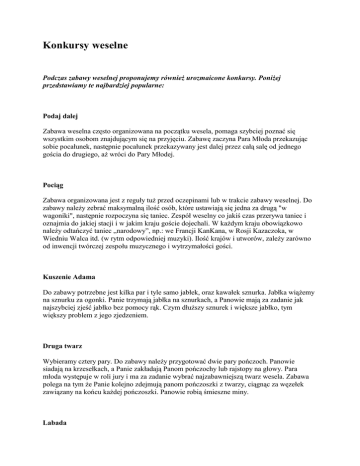 Konkursy weselne Podczas zabawy weselnej proponujemy również urozmaicone konkursy. Poniżej przedstawiamy te najbardziej popularne: Podaj dalej Zabawa weselna często organizowana na początku wesela, pomaga szybciej poznać się wszystkim osobom znajdującym się na przyjęciu. Zabawę zaczyna Para Młoda przekazując sobie pocałunek, następnie pocałunek przekazywany jest dalej przez całą salę od jednego gościa do drugiego, aż wróci do Pary Młodej. Pociąg Zabawa organizowana jest z reguły tuż przed oczepinami lub w trakcie zabawy weselnej. Do zabawy należy zebrać maksymalną ilość osób, które ustawiają się jedna za drugą "w wagoniki", następnie rozpoczyna się taniec. Zespół weselny co jakiś czas przerywa taniec i oznajmia do jakiej stacji i w jakim kraju goście dojechali. W każdym kraju obowiązkowo należy odtańczyć taniec „narodowy”, np.: we Francji KanKana, w Rosji Kazaczoka, w Wiedniu Walca itd. (w rytm odpowiedniej muzyki). Ilość krajów i utworów, zależy zarówno od inwencji twórczej zespołu muzycznego i wytrzymałości gości. Kuszenie Adama Do zabawy potrzebne jest kilka par i tyle samo jabłek, oraz kawałek sznurka. Jabłka wiążemy na sznurku za ogonki. Panie trzymają jabłka na sznurkach, a Panowie mają za zadanie jak najszybciej zjeść jabłko bez pomocy rąk. Czym dłuższy sznurek i większe jabłko, tym większy problem z jego zjedzeniem. Druga twarz Wybieramy cztery pary. Do zabawy należy przygotować dwie pary pończoch. Panowie siadają na krzesełkach, a Panie zakładają Panom pończochy lub rajstopy na głowy. Para młoda występuje w roli jury i ma za zadanie wybrać najzabawniejszą twarz wesela. Zabawa polega na tym że Panie kolejno zdejmują panom pończoszki z twarzy, ciągnąc za węzełek zawiązany na końcu każdej pończoszki. Panowie robią śmieszne miny. Labada Do zabawy dobiera się dowolnie dużą grupę osób i ustawia się je na przemian Pan, Pani... w kółku. Następnie pląsając rozpoczyna się taniec w kółko trzymając się za rączki. Zespół weselny w trakcie zabawy przerywa co chwilę taniec i pyta o poszczególne części ciała np. rączki, kolana, uda... na co biorący udział w zabawie odpowiadają stosownie do sytuacji. Po każdym pytaniu następuje zmiana części ciała, za którą biorący udział w zabawie się trzymają. Uwaga!!! Zabawa raczej dla osób pełnoletnich :) Kareta Zabawa w karetę - organizowana jest zazwyczaj w trakcie oczepin - do zabawy weselne potrzeba 9 osób, które reprezentują: 4 koła karety, 2 konie, 1 woźnice, no i oczywiście Króla (Pan Młody) i Królową (Pani Młoda). Ta zabawa weselna polega na szybkim reagowaniu na słowa opisujące poszczególne części lub osoby z karety (należy wstać i obiec rząd krzeseł). Za niezareagowanie na słowo np. Król, Pan Młody reprezentujący Króla musi wypić kieliszek wódki bez popitki. Przy odpowiednio dobranym opowiadaniu zabawa potrafi rozweselić do łez zebranych gości. Wycieczka do ZOO Zabawa bardzo podobna do zabawy w Karetę. Zmianie ulegają nazwy osób, sposób ich usadzenia oraz treść opowiadania. W tej wersji opowiadanie dotyczy wycieczki do ZOO, a udział w niej bierze rodzinka: Tata, Mama, Kazio, Zosia, Pies Burek, Słoń. Dla uatrakcyjnienia zabawy wybiera się dwie takie same grupy. Jedną wybiera Panna Młoda ze swojej rodziny, drugą Pan Młody ze swojej rodziny. Następnie czytane jest opowiadanie a wyczytane osoby lub grupy osób mają za zadanie szybko obiec swoją rodzinkę i usiąść na swoim krześle. Państwo Młodzi oceniają która rodzina wygrywa w konkurencji. Wałek W zabawie biorą udział wszyscy chętni goście, stając w kółku na przemian pan, pani, pan, pani... Zabawę rozpoczyna Para Młoda. Celem zabawy jest podawanie sobie wałka od osoby do osoby tak aby nie upadł na podłogę. Wałek trzymany jest w zależności od wersji: pod brodą, pod pachą, lub miedzy kolanami. Do przekazywania wałka nie wolno używać rąk. Osoba która zgubi wałek odpada z zabawy weselne. Konkurs tańca Do konkursu staje kilka par. Zespół weselny, prowadzący zabawę często dobiera sobie sędziów w postaci Pary Młodej lub Świadków. W zabawie wygrywa para, która najdłużej wytrwa na parkiecie. W zależności od wersji tej zabawy weselne może ona przybrać formę siłową, lub zręcznościową: - w wersji siłowej zespół zmusza partnerów do coraz trudniejszych figur, np.: z partnerką na rękach, w przysiadzie, itp. - w wersji zręcznościowej tańczącym daje się np. balon, który umieszczany jest między różnymi częściami ciał tańczących. Para, która zgubi balon odpada. - inna odmiana wersji zręcznościowej to taniec z marynarką, w którym partnerzy Pani i Pan na wybrany znak zamieniają się marynarką. Ostatnia para odpada. Balony Zabawa weselna z balonikami przybiera różne formy i postacie. Wybieranych jest kilka par, którym wręcza się niezbędne instrumenty: balon, pompka do pompowania materacy. Zasada jest prosta; Panowie trzymają wężyki od pompek, w które wetknięte są baloniki, pompki leżą na kolanach panów. Panie mają za zadanie jak najszybciej napompować balony przez siadanie na pompce do momentu jego pęknięcia. Zakręcony Do tej zabawy niezbędny jest kijek np. od szczotki no i kilku odważnych. Zasady zabawy są bardzo proste: należy wypić setkę wódki, przykładając czoło do kijka obiec go 10 razy dookoła, a następnie szybciutko dobiec do oddalonej na drugim końcu sali Pary Młodej, która trzyma nagrodę. Ogon Wybieramy kilka par. panie stają na jednym końcu sali, panowie w drugim końcu. Do spodni panów przyczepiamy sznureczek z przywiązanym na końcu cięższym woreczkiem. Panowie mają za zadanie popychać "ogonem" mały kartonik z papieru w stronę swoich Pań. Panie robią bramki z gór a Panowie powinni strzelić gola do tej bramki - oczywiście kartonikiem Szczotka Wybieramy kilka par tanecznych plus jedna osoba