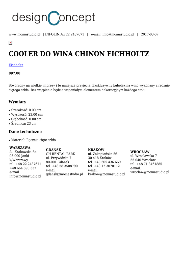 www.momastudio.pl | INFOLINIA.: 22 2437671 | e-mail: [email protected] | 2017-03-07 COOLER DO WINA CHINON EICHHOLTZ Eichholtz 897.00 Stworzony na wielkie imprezy i te mniejsze przyjęcia. Ekskluzywny kubełek na wino wykonany z ręcznie ciętego szkła. Bez wątpienia będzie wspaniałym elementem dekoracyjnym każdego stołu. Wymiary ● ● ● ● Szerokość: 0.00 cm Wysokość: 23.00 cm Głębokość: 0.00 cm Średnica: 23 cm Dane techniczne ● Materiał: Ręcznie cięte szkło WARSZAWA Al. Krakowska 6a 05-090 Janki k/Warszawy tel: +48 22 2437671 +48 664 890 337 e-mail: [email protected] GDAŃSK CH RENTAL PARK ul. Przywidzka 7 80-001 Gdańsk tel: +48 58 3508790 e-mail: [email protected] KRAKÓW ul. Zakopiańska 56 30-418 Kraków tel: +48 505 436 669 tel: +48 12 3070112 e-mail: [email protected] WROCŁAW ul. Wrocławska 7 55-040 Wrocław tel: +48 71 3461885 e-mail: [email protected]