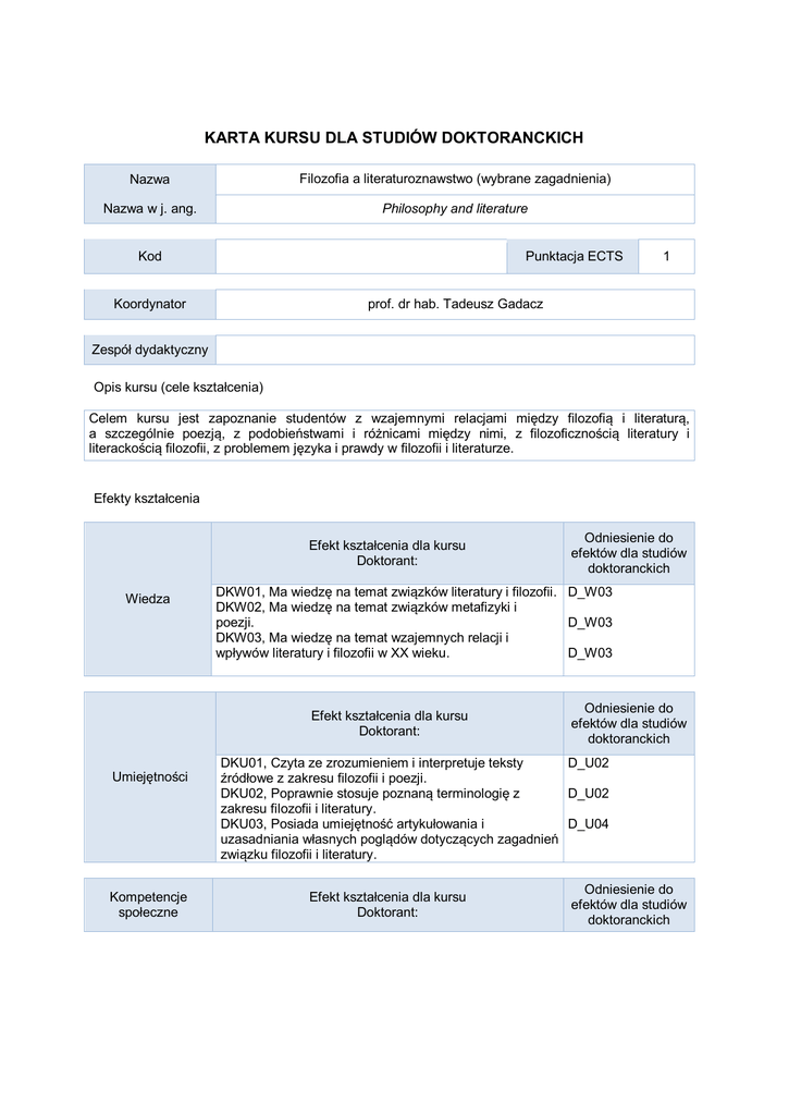 KARTA KURSU DLA STUDIÓW DOKTORANCKICH Nazwa Filozofia a literaturoznawstwo (wybrane zagadnienia) Nazwa w j. ang. Philosophy and literature Kod Punktacja ECTS Koordynator 1 prof. dr hab. Tadeusz Gadacz Zespół dydaktyczny Opis kursu (cele kształcenia) Celem kursu jest zapoznanie studentów z wzajemnymi relacjami między filozofią i literaturą, a szczególnie poezją, z podobieństwami i różnicami między nimi, z filozoficznością literatury i literackością filozofii, z problemem języka i prawdy w filozofii i literaturze. Efekty kształcenia Efekt kształcenia dla kursu Doktorant: Wiedza DKW01, Ma wiedzę na temat związków literatury i filozofii. D_W03 DKW02, Ma wiedzę na temat związków metafizyki i poezji. D_W03 DKW03, Ma wiedzę na temat wzajemnych relacji i wpływów literatury i filozofii w XX wieku. D_W03 Efekt kształcenia dla kursu Doktorant: Umiejętności Kompetencje społeczne Odniesienie do efektów dla studiów doktoranckich Odniesienie do efektów dla studiów doktoranckich DKU01, Czyta ze zrozumieniem i interpretuje teksty D_U02 źródłowe z zakresu filozofii i poezji. DKU02, Poprawnie stosuje poznaną terminologię z D_U02 zakresu filozofii i literatury. DKU03, Posiada umiejętność artykułowania i D_U04 uzasadniania własnych poglądów dotyczących zagadnień związku filozofii i literatury. Efekt kształcenia dla kursu Doktorant: Odniesienie do efektów dla studiów doktoranckich DKSK01, Na podstawie analizy problemów filozofii D_K01 literatury samodzielnie formułuje propozycje ich krytycznego ujęcia. DKSK02, Szanuje i pielęgnuje dziedzictwo kultury D_K04 europejskiej wyrosłej z filozofii literatury. DKSK03, Ma przekonanie o sensie, wartości i potrzebie D_K03 podejmowania działań pedagogicznych przybliżających i rozpowszechniających dziedzictwo relacji między filozofią i literaturą. Organizacja zajęcia w grupach Forma zajęć Wykład (W) A Liczba godzin K L S P Z 12 Opis metod prowadzenia zajęć Zajęcia będą prowadzone na przemian w formie wykładu i konwersatorium opartego na tekstach źródłowych. Forma zaliczenia kursu Kryteria oceny Egzamin Zaliczenie z oceną Zaliczenie - - TAK Zaliczenie. Uwagi - Treści merytoryczne (wykaz tematów) 1. W. Tatarkiewicz, Dwa pojęcia poezji, w: tenże, Parerga, Warszawa 1978 (2 godziny) 2. Poezja i metafizyka (Platon, Arystoteles, J. G. Hamann, J.G. Herder i W. von Humboldt, G.W.F. Hegel) (2 godziny) 3. Poezja i metafizyka (W. Dilthey, M. Heidegger). W. Dilthey, Fantazja poetycka, Przeżycie i twórczość poetycka, w: Z. Kuderowicz, Dilthey, Warszawa 1987 M. Heidegger, Höldrelin i istota poezji, przeł. K. Michalski, „Twórczość”, Warszawa 1976, s. 37. (2 godziny) 4. O.F. Bollnow, O dziele nie ukończonym. O dziele nie do ukończenia, w: „Logos i Ethos” nr 2 1992 (2 godziny) 5. Poezja i metafizyka (F. Rosenzweig, E. Levinas, H.-G. Gadamer, J. Derrida). H.-G. Gadamer, O wkładzie poezji w poszukiwanie prawdy, przeł. J. Migasiński, w: „Studia Filozoficzne” nr. 5-6, 1982; H.G. Gadamer, Czy poeci umilkną, przeł. M. Łukasiewicz, Bydgoszcz 1998; J. Derrida, Che cos’é la poesia?, tłum. P. Markowski, w: „Literatura na świecie” nr 11-12 1988 (2 godziny). Wykaz literatury podstawowej Teksty źródłowe: Th.W. Adorno, O literaturze. Wybór esejów, tłum. A. Wołkowicz, Warszawa 2005 Th.W. Adorno, Sztuka i sztuki. Wybór esejów, tłum. K. Krzemień-Ojak, Warszawa 1990 Th.W. Adorno, Teoria estetyczna, tłum. K. Krzemieniowa, Warszawa 1994 Arystoteles, Retoryka – poetyka, tłum. H. Podbielski, Warszawa 1988 W. Benjamin, O języku w ogóle i o języku człowieka, tłum. A. Lipszyc, w: Literatura na świecie” nr 5-6 2011 W. Benjamin, Twórca jako wytwórca, tłum. H. Orłowski, J. Sikorski, Poznań 1975 O.F. Bollnow, O pewnej regule hermeneutycznej, w: „Logos i Ethos” nr 2 1992 .F. Bollnow, O dziele nie ukończonym. O dziele nie do ukończenia, w: „Logos i Ethos” nr 2 1992 J. Derrida, Che cos’é la poesia?, tłum. P. Markowski, w: „Literatura na świecie” nr 11-12 1988 J. Derrida, Pismo filozofii, tłum. B. Banasiak, Kraków 1993 J. Derrida, Implikacje. Rozmowa z Henri Ronsem, w: Pozycje. Rozmowy z Henri Ronsem, Julią Kristevą, Jean-Luis Houdebinem i Guy Scarpettą, tłum. A. Dziadek, Bytom 1997 J. Derrida, O gramatologii, tłum. B. Banasiak, Warszawa 1999 J. Derrida, Szibbolet dla Paula Celana, tłum. A. Dziadek, Bytom 2000 J. Derrida, Pismo i różnica, tłum. K. Kłosiński, Warszawa 2004 J. Derrida, Geoffrey Bennington, Jacquesa Derrida, przeł. V. Szydłowska-Hmissi, Warszawa 2009 W. Dilthey, O istocie filozofii i inne pisma, przeł. E. Paczkowska-Łagowska, Warszawa 1987 W. Dilthey, Pisma estetyczne, przeł. K. Krzemieniowa, Warszawa 1982 Filozofia niemieckiego Oświecenia, red. T. Namowicz, K. Sauerland, M. J. Siemek, Warszawa 1973 H.-G. Gadamer, Czy poeci umilkną, przeł. M. Łukasiewicz, Bydgoszcz 1998 H.G. Gadamer, Heidegger i Grecy, w: „Aletheia” 1(4) 1990: Heidegger dzisiaj H.-G. Gadamer, O wkładzie poezji w poszukiwanie prawdy, przeł. J. Migasiński, w: „Studia Filozoficzne” nr. 5-6, 1982 H.-G. Gadamer, Platon jako portrecista [w:] Platon, Uczta, przeł. A. Serafin, Warszawa 2012 H.-G. Gadamer, Prawda i metoda, przeł. B. Baran, Warszawa 2004 H.-G. Gadamer, Rozum, słowo, dzieje, przeł. M. Łukasiewicz, K. Michalski, Warszawa 1979 H.-G. Gadamer, Wiek filozofii. Rozmowy z Riccardem Dottorim, przeł. J. Wilk, Wrocław 2009 G.W.F. Hegel, Wykłady o estetyce, tłum. J. Grabowski, A. Landman, t. 1-3, Warszawa 1964-1967 M. Heidegger, Bycie i czas, przeł. B. Baran, Warszawa 1994 M. Heidegger, Drogi lasu, przeł. K . Wolicki, Warszawa 1997 M. Heidegger, Höldrelin i istota poezji, przeł. K. Michalski, „Twórczość”, Warszawa 1976, s. 37. M. Heidegger, List o humanizmie, przeł. J. Tischner [w:] M. Heidegger, Znaki drogi, Warszawa 1995 M. Heidegger, Przygotowanie do słuchania słowa poezji, tłum. J. Mizera, w: „Principia”, t. XX, 1