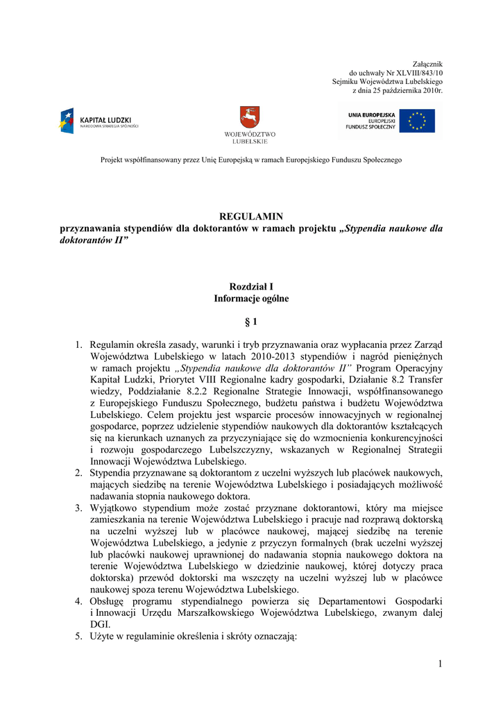 Załącznik do uchwały Nr XLVIII/843/10 Sejmiku Województwa Lubelskiego z dnia 25 października 2010r. Projekt współfinansowany przez Unię Europejską w ramach Europejskiego Funduszu Społecznego REGULAMIN przyznawania stypendiów dla doktorantów w ramach projektu „Stypendia naukowe dla doktorantów II” Rozdział I Informacje ogólne §1 1. Regulamin określa zasady, warunki i tryb przyznawania oraz wypłacania przez Zarząd Województwa Lubelskiego w latach 2010-2013 stypendiów i nagród pieniężnych w ramach projektu „Stypendia naukowe dla doktorantów II” Program Operacyjny Kapitał Ludzki, Priorytet VIII Regionalne kadry gospodarki, Działanie 8.2 Transfer wiedzy, Poddziałanie 8.2.2 Regionalne Strategie Innowacji, współfinansowanego z Europejskiego Funduszu Społecznego, budżetu państwa i budżetu Województwa Lubelskiego. Celem projektu jest wsparcie procesów innowacyjnych w regionalnej gospodarce, poprzez udzielenie stypendiów naukowych dla doktorantów kształcących się na kierunkach uznanych za przyczyniające się do wzmocnienia konkurencyjności i rozwoju gospodarczego Lubelszczyzny, wskazanych w Regionalnej Strategii Innowacji Województwa Lubelskiego. 2. Stypendia przyznawane są doktorantom z uczelni wyższych lub placówek naukowych, mających siedzibę na terenie Województwa Lubelskiego i posiadających możliwość nadawania stopnia naukowego doktora. 3. Wyjątkowo stypendium może zostać przyznane doktorantowi, który ma miejsce zamieszkania na terenie Województwa Lubelskiego i pracuje nad rozprawą doktorską na uczelni wyższej lub w placówce naukowej, mającej siedzibę na terenie Województwa Lubelskiego, a jedynie z przyczyn formalnych (brak uczelni wyższej lub placówki naukowej uprawnionej do nadawania stopnia naukowego doktora na terenie Województwa Lubelskiego w dziedzinie naukowej, której dotyczy praca doktorska) przewód doktorski ma wszczęty na uczelni wyższej lub w placówce naukowej spoza terenu Województwa Lubelskiego. 4. Obsługę programu stypendialnego powierza się Departamentowi Gospodarki i Innowacji Urzędu Marszałkowskiego Województwa Lubelskiego, zwanym dalej DGI. 5. Użyte w regulaminie określenia i skróty oznaczają: 1 1) doktorant – osoba w rozumieniu art. 2 ust.1 pkt 21 ustawy z dnia 27 lipca 2005 r. – Prawo o szkolnictwie wyższym (Dz. U. z 2005 r. Nr 164, poz. 1365 ze zm.), a także osoba ubiegającą się o nadanie stopnia naukowego doktora, niebędącą uczestnikiem studiów doktoranckich, mająca wszczęty przewód doktorski – do dnia podjęcia uchwały o nadaniu stopnia naukowego doktora, 2) jednostka z sektora B+R – jednostka naukowa, konsorcjum naukowe, centrum naukowe Polskiej Akademii Nauk w rozumieniu ustawy z dnia 30 kwietnia 2010 r. o zasadach finansowania nauki (Dz. U. z 2010 Nr 96, poz. 615) oraz centrum naukowoprzemysłowe w rozumieniu ustawy z dnia 30 kwietnia 2010 r. o instytutach badawczych (Dz. U. z 2010 r. Nr 96, poz. 618) - prowadząca/ce działalność badawczo-rozwojową w rozumieniu w/w ustawy o zasadach finansowania nauki 3) kadra zarządzająca projektem – koordynator projektu i asystent koordynatora projektu, 4) Komisja Stypendialna – Komisja powołana przez Zarząd Województwa Lubelskiego, której zadaniem jest dokonanie oceny merytorycznej wniosków o przyznanie stypendium, 5) lista rankingowa doktorantów – lista doktorantów uprawnionych do otrzymania stypendium, w kolejności od najwyższej uzyskanej liczby punktów, 6) lista rezerwowa doktorantów – lista doktorantów, którzy zdobyli liczbę punktów kolejno poniżej ostatniego miejsca na liście rankingowej, 7) projekt – projekt systemowy „Stypendia naukowe dla doktorantów II” Program Operacyjny Kapitał Ludzki, Priorytet VIII Regionalne kadry gospodarki, Działanie 8.2 Transfer wiedzy, Poddziałanie 8.2.2 Regionalne Strategie Innowacji, współfinansowany z Europejskiego Funduszu Społecznego, budżetu państwa i budżetu Województwa Lubelskiego, 8) przedsiębiorca – podmiot w rozumieniu art. 2 ust. 1 pkt 10 ustawy z dnia 2 lipca 2004 r. o swobodzie działalności gospodarczej (t.j.: Dz. U. z 2007 r. nr 155, poz.1095 ze zm.), 9) regulamin – Regulamin przyznawania stypendiów dla doktorantów w ramach projektu „Stypendia naukowe dla doktorantów II”, 10) studia doktoranckie – studia trzeciego stopnia w rozumieniu ustawy – Prawo o szkolnictwie wyższym z dnia 27 lipca 2005 r. (Dz. U. nr 164, poz. 1365 ze zm.) 12) stypendium – stypendium naukowe przyznane w ramach projektu, o którym mowa w pkt 7, 13) UMWL – Urząd Marszałkowski Województwa Lubelskiego w Lublinie, 14) wniosek – wniosek doktoranta o przyznanie stypendium. §2 1. Stypendium przyznaje się na okres 18 miesięcy w wysokości 3 656 zł/m-c brutto. W ramach projektu zostaną ogłoszone 3 konkursy: jeden w 2011 r. i dwa w 2012 r. Wsparciem zostanie objętych łącznie 185 doktorantów: w 2011 r. – 60 doktorantów i w 2012 r. kolejno – 60 i 65 doktorantów. Stypendium wypłacane będzie co trzy miesiące przelewem na konto bankowe doktoranta. 2. Stypendium przyznawane jest jako wsparcie finansowe mające przyczynić się do ukończenia pracy doktorskiej, którego sposób wydatkowania nie będzie podlegał kontroli. Postępy w realizacji prac doktorskich będą monitorowane przez kadrę zarządzającą projektem na podstawie sprawozdań z przebiegu prac nad rozprawą doktorską, zawierających opinie promotorów/opiekunów naukowych prac 2 doktorskich, informacje o udziale w grantach, projektach lub przedsięwzięciach naukowych wykraczających poza ramy macierzystej uczelni oraz informacje o udziale w konferencjach naukowych. Wzór sprawozdania z przebiegu prac nad rozprawą doktorską stanowi Załącznik nr 2 do regulaminu. §3 1. W ciągu trwania projektu doktorant możne pobierać stypendium tylko w ramach jednego naboru wniosków, przez okres do 18 miesięcy. 2. Doktorant, który otrzymał wsparcie w ramach pop