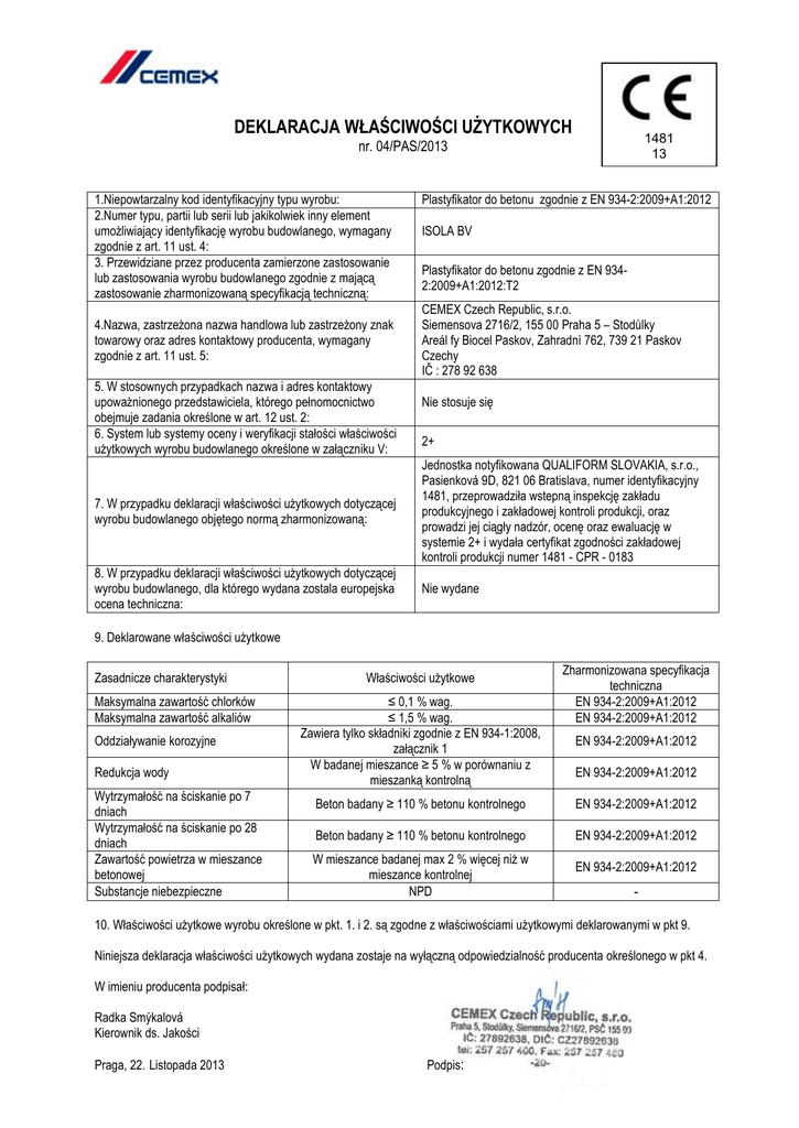 DEKLARACJA WŁAŚCIWOŚCI UŻYTKOWYCH 1481 13 nr. 04/PAS/2013 1.Niepowtarzalny kod identyfikacyjny typu wyrobu: 2.Numer typu, partii lub serii lub jakikolwiek inny element umożliwiający identyfikację wyrobu budowlanego, wymagany zgodnie z art. 11 ust. 4: 3. Przewidziane przez producenta zamierzone zastosowanie lub zastosowania wyrobu budowlanego zgodnie z mającą zastosowanie zharmonizowaną specyfikacją techniczną: 4.Nazwa, zastrzeżona nazwa handlowa lub zastrzeżony znak towarowy oraz adres kontaktowy producenta, wymagany zgodnie z art. 11 ust. 5: 5. W stosownych przypadkach nazwa i adres kontaktowy upoważnionego przedstawiciela, którego pełnomocnictwo obejmuje zadania określone w art. 12 ust. 2: 6. System lub systemy oceny i weryfikacji stałości właściwości użytkowych wyrobu budowlanego określone w załączniku V: Plastyfikator do betonu zgodnie z EN 934-2:2009+A1:2012 ISOLA BV Plastyfikator do betonu zgodnie z EN 9342:2009+A1:2012:T2 CEMEX Czech Republic, s.r.o. Siemensova 2716/2, 155 00 Praha 5 – Stodůlky Areál fy Biocel Paskov, Zahradní 762, 739 21 Paskov Czechy IČ : 278 92 638 Nie stosuje się 2+ 7. W przypadku deklaracji właściwości użytkowych dotyczącej wyrobu budowlanego objętego normą zharmonizowaną: Jednostka notyfikowana QUALIFORM SLOVAKIA, s.r.o., Pasienková 9D, 821 06 Bratislava, numer identyfikacyjny 1481, przeprowadziła wstepną inspekcję zakładu produkcyjnego i zakładowej kontroli produkcji, oraz prowadzi jej ciągły nadzór, ocenę oraz ewaluację w systemie 2+ i wydała certyfikat zgodności zakładowej kontroli produkcji numer 1481 - CPR - 0183 8. W przypadku deklaracji właściwości użytkowych dotyczącej wyrobu budowlanego, dla którego wydana zostala europejska ocena techniczna: Nie wydane 9. Deklarowane właściwości użytkowe Zasadnicze charakterystyki Maksymalna zawartość chlorków Maksymalna zawartość alkaliów Oddziaływanie korozyjne Redukcja wody Wytrzymałość na ściskanie po 7 dniach Wytrzymałość na ściskanie po 28 dniach Zawartość powietrza w mieszance betonowej Substancje niebezpieczne Właściwości użytkowe ≤ 0,1 % wag. ≤ 1,5 % wag. Zawiera tylko składniki zgodnie z EN 934-1:2008, załącznik 1 W badanej mieszance ≥ 5 % w porównaniu z mieszanką kontrolną Zharmonizowana specyfikacja techniczna EN 934-2:2009+A1:2012 EN 934-2:2009+A1:2012 EN 934-2:2009+A1:2012 EN 934-2:2009+A1:2012 Beton badany ≥ 110 % betonu kontrolnego EN 934-2:2009+A1:2012 Beton badany ≥ 110 % betonu kontrolnego EN 934-2:2009+A1:2012 W mieszance badanej max 2 % więcej niż w mieszance kontrolnej NPD EN 934-2:2009+A1:2012 - 10. Właściwości użytkowe wyrobu określone w pkt. 1. i 2. są zgodne z właściwościami użytkowymi deklarowanymi w pkt 9. Niniejsza deklaracja właściwości użytkowych wydana zostaje na wyłączną odpowiedzialność producenta określonego w pkt 4. W imieniu producenta podpisał: Radka Smýkalová Kierownik ds. Jakości Praga, 22. Listopada 2013 Podpis: