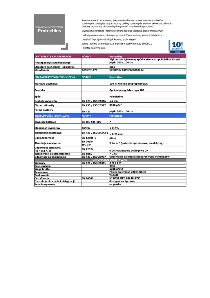 WYKŁADZINY ZABEZPIECZAJĄCE Protectiles Przeznaczona do stosowania, jako nawierzchnia ochronna wewnątrz obiektów sportowych, zabezpieczająca systemy podłóg sportowych, stanowi skuteczną ochronę podczas organizacji okazjonalnych wydarzeń w obiektach sportowych. Wykładzina ochronna Protectiles chroni podłogę sportową przed intensywnym oddziaływaniem ruchu pieszego, przedmiotów o niedużej wadze i działaniem urządzeń i sprzętów takich jak krzesła, stoły, regały. Łatwa i szybka w montażu (1,5 h przez 4 osoby montuje 1000m2), montaż na pływająco. CERTYFIKATY I KLASYFIKACJE NORMY Rodzaj pokrycia podłogowego Protectiles Wykładzina igłowana/ spód wykonany z poliolefiny, format płytki 200 x 100 cm Struktura powierzchni lub zadruk Klasyfikacja DIN EN 1470 Brak Do użytku komercyjnego: 33 CHARAKTERYSTYKA TECHNICZNA NORMY Protectiles Warstwa użytkowa 100 % włókna polipropylenowe Powłoka Ognioodporny latex typu SBR Spód Polyolefine Grubość całkowita EN 428 / ISO 24346 5,2 mm Ciężar całkowity EN 430 / ISO 23997 3100 g/m2 Forma dostawy EN 427 płytki 200 x 100 cm WŁAŚCIWOŚCI TECHNICZNE NORMY Protectiles Trwałość kolorów EN ISO 105-B02 7 Stabilność wymiarów EN986 < 0,2% Wgniecenie resztkowe EN 433 / ISO 24343-1 Ognioodporność EN 13501-1 Bfl-s1 Absorbcja akustyczna EN 20354 ISO 354 D Lw = * (pokrycie tyczmasowe, nie dotyczy) Odpormość termiczna Ru = m2 K/W Właściwości elektrostatyczne Odporność na zaplamienia Wymiary Powierzchnia Waga brutto Pakowanie Znakowanie Certyfikacja Instrukcje układania i pielęgnacji Przechowywanie EN 12524 < 0.20 mm 0,08: ogrzewanie podłogowe OK < 2 kV EN 1815 Odporna na działanie standardowych chemikaliów EN 423 / ISO 26987 INFORMACJE LOGISTYCZNE 2mx1m EN 426 / ISO 24341 2m2 6200 g/m2 Paleta drewniana 200X100 cm Tarkett N° 0334-DPC 202 No PCP EN 14041 dostępne na życzenie na płasko