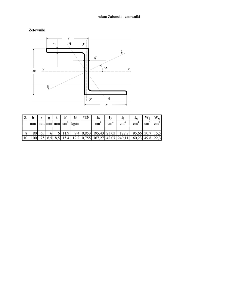 Adam Zaborski - zetowniki Zetowniki Z h s g t F G 2 mm mm mm mm cm kg/m tgφ φ Ix 4 cm Iy 4 cm Iξ Iη 4 cm 4 cm Wξ Wη 3 cm3 cm 8 80 65 6 6 11,9 9,4 0,853 195,43 23,03 122,8 95,66 30,7 15,5 10 100 75 6,5 8,5 15,4 12,2 0,755 367,27 42,07 249,11 160,23 49,8 22,3