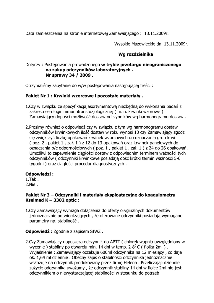 Data zamieszczenia na stronie internetowej Zamawiającego : 13.11.2009r. Wysokie Mazowieckie dn. 13.11.2009r. Wg rozdzielnika Dotyczy : Postępowania prowadzonego w trybie przetargu nieograniczonego na zakup odczynników laboratoryjnych . Nr sprawy 34 / 2009 . Otrzymaliśmy zapytanie do w/w postępowania następującej treści : Pakiet Nr 1 : Krwinki wzorcowe i pozostałe materiały . 1.Czy w związku ze specyfikacją asortymentową niezbędną do wykonania badań z zakresu serologii immunotransfuzjologicznej ( m.in. krwinki wzorowe ) Zamawiający dopuści moŜliwość dostaw odczynników wg harmonogramu dostaw . 2.Prosimy równieŜ o odpowiedź czy w związku z tym wg harmonogramu dostaw odczynników krwinkowych ilość dostaw w roku wynosi 13 czy Zamawiający zgodzi się zwiększyć liczbę opakowań krwinek wzorcowych do oznaczania grup krwi ( poz. 2 , pakiet 1 , zał. 1 ) z 12 do 13 opakowań oraz krwinek panelowych do oznaczania p/c odpornościowych ( poz. 1 , pakiet 1 , zał. 1 ) z 24 do 26 opakowań. UmoŜliwi to zapewnienie ciągłości dostaw z odpowiednim terminem waŜności tych odczynników ( odczynniki krwinkowe posiadają dość krótki termin waŜności 5-6 tygodni ) oraz ciągłości procedur diagnostycznych . Odpowiedzi : 1.Tak . 2.Nie . Pakiet Nr 3 – Odczynniki i materiały eksploatacyjne do koagulometru Kselmed K – 3302 optic : 1.Czy Zamawiający wymaga dołączenia do oferty oryginalnych dokumentów jednoznacznie potwierdzających , Ŝe oferowane odczynniki posiadają wymagane parametry np. stabilność . Odpowiedź : Zgodnie z zapisem SIWZ . 2.Czy Zamawiający dopuszcza odczynnik do APTT ( chlorek wapnia uwzględniony w wycenie ) stabilny po otwarciu min. 14 dni w temp. 2-80 C ( fiolka 2ml ) . Wyjaśnienie : Zamawiający oczekuje 600ml odczynnika na 12 miesięcy , co daje ok. 1,64 ml dziennie . Obecny zapis o stabilności odczynnika jednoznacznie wskazuje na odczynnik produkowany przez firmę Helena . Przeliczając dziennie zuŜycie odczynnika uwaŜamy , Ŝe odczynnik stabilny 14 dni w fiolce 2ml nie jest odczynnikiem o niewystarczającej stabilności w stosunku do potrzeb Zamawiającego . Odpowiedź : Tak. – dopuszczamy . 3.Czy Zamawiający dopuszcza tromboplastynę z mózgu królika ( odczynnik gotowy do uŜycia bez konieczności przygotowania odczynnika roboczego ) w postaci ciekłej w konfekcjonowaniu 2-4ml , stabilną po otwarciu min. 7 dni w temp. 2-8 0 C . Wyjaśnienie : Zamawiający oczekuje 1800ml odczynnika na 12 miesięcy co daje 4,93ml dziennie . Obecny zapis o stabilności jak i składzie zestawu jednoznacznie wskazuje na odczynnik produkowany przez firmę Helena . Przeliczając dzienne zuŜycie odczynnika uwaŜamy , Ŝe odczynnik stabilny 7 dni w fiolce 2-4ml nie jest odczynnikiem o niewystarczającej stabilności w stosunku do potrzeb Zamawiającego . Odpowiedź : Tak – dopuszczamy tromboplastynę z mózgu królika w postaci ciekłej w konfekcjonowaniu 2 ml stabilną po otwarciu min. 7 dni w temp. 2-8 0 C . 4.Czy Zamawiający dopuszcza tromboplastynę z mózgu królika ( rozpuszczalnik w zestawie ) w postaci liofilizatu w konfekcjonowaniu 5-10ml stabilną po otwarciu min. 12 dni w temp. 2-8 0 C . Odpowiedź : Nie wymagany jest odczynnik w postaci ciekłej . 5.W przypadku gdy odczynniki mają wyznaczone ISI przez producenta odczynników są w pełni kompatybilne z aparatem uŜytkowanym przez laboratorium , czy Zamawiający wyrazi zgodę na pominięcie w wycenie zestawu referencyjnego do INR ( odczynnik zalecany przez producenta aparatu ) . Wyjaśnienie : Do wykonania oznaczenia czasu protrombinowego w najwyŜszej jakości zestaw referencyjny nie jest wymagany . Włączenie do pakietu zestawu wraz z innymi zapisami w szczególności dotyczącego stabilności odczynnika powoduje , Ŝe jedyną waŜną ofertę moŜe złoŜyć tylko dystrybutor odczynników Helena . Zamawiający poprzez obecne zapisy wyklucza równieŜ dostawę odczynników , których stosowanie jest zalecane przez producenta aparatu . Odpowiedź : Nie Zamawiający nie wyraŜa zgody . To , Ŝe odczynniki mają wyznaczone ISI przez producenta odczynników na dany typ aparatów nie oznacza , Ŝe nie jest potrzebne kontrolowanie tego parametru . Na wartość ISI ma wpływ szereg czynników zewnętrznych np. temperatura przeprowadzone naprawy aparatu etc. Zamawiający ma prawo Ŝądać materiałów do kontroli INR , a zgodnie z Dobrą Praktyką Laboratoryjną obowiązek przeprowadzania kontroli wyników , które są podawane w postaci INR . Z powaŜaniem