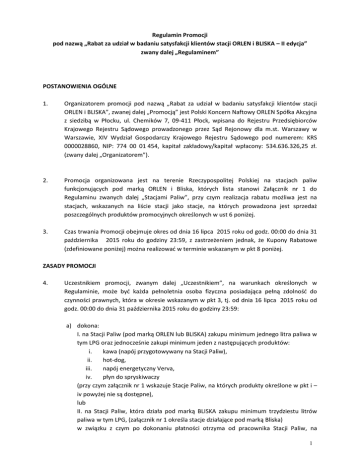 Regulamin Promocji pod nazwą „Rabat za udział w badaniu satysfakcji klientów stacji ORLEN i BLISKA – II edycja” zwany dalej „Regulaminem” POSTANOWIENIA OGÓLNE 1. Organizatorem promocji pod nazwą „Rabat za udział w badaniu satysfakcji klientów stacji ORLEN i BLISKA”, zwanej dalej „Promocją” jest Polski Koncern Naftowy ORLEN Spółka Akcyjna z siedzibą w Płocku, ul. Chemików 7, 09-411 Płock, wpisana do Rejestru Przedsiębiorców Krajowego Rejestru Sądowego prowadzonego przez Sąd Rejonowy dla m.st. Warszawy w Warszawie, XIV Wydział Gospodarczy Krajowego Rejestru Sądowego pod numerem: KRS 0000028860, NIP: 774 00 01 454, kapitał zakładowy/kapitał wpłacony: 534.636.326,25 zł. (zwany dalej „Organizatorem”). 2. Promocja organizowana jest na terenie Rzeczypospolitej Polskiej na stacjach paliw funkcjonujących pod marką ORLEN i Bliska, których lista stanowi Załącznik nr 1 do Regulaminu zwanych dalej „Stacjami Paliw”, przy czym realizacja rabatu możliwa jest na stacjach, wskazanych na liście stacji jako stacje, na których prowadzona jest sprzedaż poszczególnych produktów promocyjnych określonych w ust 6 poniżej. 3. Czas trwania Promocji obejmuje okres od dnia 16 lipca 2015 roku od godz. 00:00 do dnia 31 października 2015 roku do godziny 23:59, z zastrzeżeniem jednak, że Kupony Rabatowe (zdefiniowane poniżej) można realizować w terminie wskazanym w pkt 8 poniżej. ZASADY PROMOCJI 4. Uczestnikiem promocji, zwanym dalej „Uczestnikiem”, na warunkach określonych w Regulaminie, może być każda pełnoletnia osoba fizyczna posiadająca pełną zdolność do czynności prawnych, która w okresie wskazanym w pkt 3, tj. od dnia 16 lipca 2015 roku od godz. 00:00 do dnia 31 października 2015 roku do godziny 23:59: a) dokona: I. na Stacji Paliw (pod marką ORLEN lub BLISKA) zakupu minimum jednego litra paliwa w tym LPG oraz jednocześnie zakupi minimum jeden z następujących produktów: i. kawa (napój przygotowywany na Stacji Paliw), ii. hot-dog, iii. napój energetyczny Verva, iv. płyn do spryskiwaczy (przy czym załącznik nr 1 wskazuje Stacje Paliw, na których produkty określone w pkt i – iv powyżej nie są dostępne), lub II. na Stacji Paliw, która działa pod marką BLISKA zakupu minimum trzydziestu litrów paliwa w tym LPG, (załącznik nr 1 określa stacje działające pod marką Bliska) w związku z czym po dokonaniu płatności otrzyma od pracownika Stacji Paliw, na 1 b) c) niefiskalnym wydruku połączonym z dowodem zakupu (paragon, faktura potwierdzenie transakcji flotowej), zaproszenie do uczestnictwa w elektronicznym badaniu satysfakcji klienta, której celem jest ocena satysfakcji Uczestnika z wizyty na Stacji Paliw funkcjonującej odpowiednio pod marką ORLEN lub Bliska (dalej „Ankieta”), z informacją o Ankiecie i adresem strony internetowej Ankiety (zwany dalej Kuponem Rabatowym), przy czym łączne spełnienie przez klienta warunków określonych w pkt I oraz w pkt II w ramach jednej transakcji uprawnia do otrzymania tylko jednego zaproszenia do wypełnienia Ankiety, w terminie 3 dni kalendarzowych od daty zakupu podanej na dowodzie zakupu, weźmie udział w Ankiecie na portalu internetowym www.wizytaorlen.eu dla stacji prowadzonej pod marką ORLEN lub www.wizytabliska.eu dla stacji prowadzonej pod marką BLISKA, wypełniając w tym terminie Ankietę w sposób kompletny; uruchomienie Ankiety wymaga wprowadzenia na stronie internetowej informacji o dacie, godzinie i kwocie zakupu oraz nr Stacji Paliw, na której zakup był dokonany, dane te znajdują się na dowodzie zakupu (paragon, faktura potwierdzenie transakcji flotowej), otrzyma po zakończeniu wypełnienia Ankiety informację o unikalnym kodzie promocyjnym (dalej „Kod Promocyjny”) do samodzielnego przepisania na Kupon Rabatowy. 5. Ankieta ma charakter anonimowy i służy wyłącznie do oceny satysfakcji klientów Stacji Paliw funkcjonujących pod marką Orlen i Bliska. W ramach Ankiety nie są zbierane dane osobowe Uczestników Promocji. Informacje przekazane przez Uczestników w ramach Ankiety nie są traktowane jako złożenie skargi lub reklamacji do Organizatora. Informacje o sposobie złożenia skarg i reklamacji są dostępne w szczególności na stronie www.orlen.pl oraz www.bliska.pl. 6. Uczestnik, który spełnił łącznie wszystkie warunki w terminie i zakresie określonym w ust. 4 Regulaminu oraz przed zakończeniem transakcji (tj. przed dokonaniem zapłaty) dokonywanej w terminie wskazanym w ust. 8 poniżej, przekaże pracownikowi Stacji Paliw, wskazanej w Załączniku nr 1 jako posiadająca w sprzedaży dany rodzaj produktu promocyjnego, Kupon Rabatowy z uzupełnionym Kodem Promocyjnym, uprawniony jest do uzyskania jednorazowego rabatu w wysokości 50% na zakup jednego produktów znajdujących się w ofercie ORLEN (dalej „Produkty Promocyjne”) wymienionych w Załączniku nr 2 do Regulaminu, z zastrzeżeniem jednak, że na Stacjach Paliw należących do sieci franczyzowych stacji paliw działających pod marką ORLEN lub Bliska, określony niniejszym Regulaminem rabat cenowy na Produkty Promocyjne jest rabatem minimalnym. 7. Jeden Kod Promocyjny może być przepisany tylko na jeden Kupon Rabatowy. Jeden Kupon Rabatowy z uzupełnionym Kodem Promocyjnym uprawnia do jednorazowego otrzymania rabatu cenowego na zakup jednego z Produktów Promocyjnych, na Stacjach Paliw wskazanych w Załączniku nr 1 jako posiadające w sprzedaży dany rodzaj Produktu Promocyjnego. 8. Realizacja Kuponu Rabatowego z uzupełnionym Kodem Promocyjnym może nastąpić wyłącznie w ciągu 30 dni od daty wydruku Kuponu Rabatowego z zaproszeniem do udziału w Ankiecie (tj. w ciągu 30 dni od daty wskazanej na Kuponie Rabatowym). 2 9. Kupony Rabatowe z uzupełnionym Kodem Promocyjnym tracą ważność (tj. nie mogą zostać zrealizowane) po upływie terminu wskazanego w ust. 8 powyżej. 10. Każdy Uczestnik może wziąć udział w Promocji wielokrotnie na zasadach