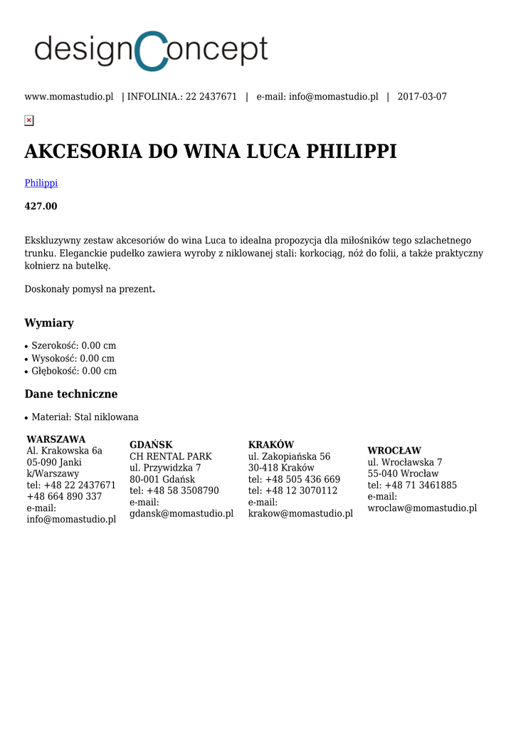 www.momastudio.pl | INFOLINIA.: 22 2437671 | e-mail: [email protected] | 2017-03-07 AKCESORIA DO WINA LUCA PHILIPPI Philippi 427.00 Ekskluzywny zestaw akcesoriów do wina Luca to idealna propozycja dla miłośników tego szlachetnego trunku. Eleganckie pudełko zawiera wyroby z niklowanej stali: korkociąg, nóż do folii, a także praktyczny kołnierz na butelkę. Doskonały pomysł na prezent. Wymiary ● ● ● Szerokość: 0.00 cm Wysokość: 0.00 cm Głębokość: 0.00 cm Dane techniczne ● Materiał: Stal niklowana WARSZAWA Al. Krakowska 6a 05-090 Janki k/Warszawy tel: +48 22 2437671 +48 664 890 337 e-mail: [email protected] GDAŃSK CH RENTAL PARK ul. Przywidzka 7 80-001 Gdańsk tel: +48 58 3508790 e-mail: [email protected] KRAKÓW ul. Zakopiańska 56 30-418 Kraków tel: +48 505 436 669 tel: +48 12 3070112 e-mail: [email protected] WROCŁAW ul. Wrocławska 7 55-040 Wrocław tel: +48 71 3461885 e-mail: [email protected]