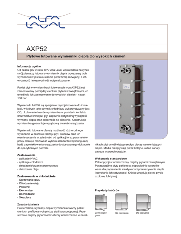 AXP52 Płytowe lutowane wymienniki ciepła do wysokich ciśnień Informacje ogólne Od czasu gdy w roku 1977 Alfa Laval wprowadziła na rynek swój pierwszy lutowany wymiennik ciepła typoszereg tych wymienników jest nieustannie przez firmę rozwijany, a ich wydajność i niezawodność optymalizowane. Pakiet płyt w wymiennikach lutowanych typu AXP52 jest zamontowany pomiędzy cienkimi płytami zewnętrznymi, co umożliwia ich zastosowanie do wysokich ciśnień - nawet 130 bar. Wymienniki AXP52 są specjalnie zaprojektowane do instalacji, w których jako czynnik chłodniczy wykorzystywany jest CO2.. Lutowanie twarde wymiennika w punktach kontaktu oraz wzdłuż krawędzi płyt zapewnia optymalną wydajność wymiany ciepła oraz odporność na ciśnienie. Konstrukcja wymiennika gwarantuje wyjątkową trwałość urządzenia. Wymienniki lutowane oferują możliwość różnorodnego wykonania w zakresie rodzaju płyt, króćców oraz ich rozmieszczenia w zależności od aplikacji oraz parametrów pracy. Istnieje możliwość wyboru standardowej konfiguracji bądź zaprojektowania urządzenia dostosowanego dokładnie do specyficznych potrzeb. Zastosowanie - aplikacje HVAC - aplikacje chłodnicze - chłodzenie/grzanie przemysłowe - chłodzenie oleju Zastosowania w chłodnictwie - Ogrzewanie gazu - Chłodzenie oleju - Parownik - Ekonomizer - Dochładzacz - Skraplacz Zasada działania Powierzchnię wymiany ciepła wymiennika tworzy pakiet cienkich profilowanych płyt ze stali kwasoodpornej. Przestrzenie między płytami oraz otwory umieszczone w naroż- nikach płyt umożliwiają przepływ cieczy wymieniających ciepło. Media przepływają przez kolejne, różne kanały, zawsze w przeciwprądzie. Wykonanie standardowe Pakiet płyt jest umieszczony między płytami zewnętrznymi. Poszczególne płyty pakietu są odpowiednio wyprofilowane dla poprawienia efektywności przekazywania ciepła i uzyskania ich sztywności. Króćce znajdują się na płycie czołowej lub tylnej. Przykłady króćców Zewnętrzny gwint Do lutowania Do spawania AXP52 - Wykres ciśnienia/temperatury* zgodnie z PED** Standardowe wymiary i waga* = 14 + (n x 2.4) + –3 Wymiar A mm PS bar / (PSI) S3 - S4 Waga** kg < 50 płyt Waga** kg 51-100 płyt Waga** kg 101-150 płyt S1 - S2 = 32,7 + (n x 0.22) = 35.4 + (n x 0.22) = 38.4 + (n x 0.22) ** bez króćców (n = liczba płyt) 130 (1885) 160 (6.3) -10 (14) 150 (302) 50 (1.97) TS ºC (ºF) * W celu uzyskania dokładnych danych należy skontaktować się z przedstawicielem Alfa Laval. patrz wykres patrz wykres próżnia patrz wykres 0.095 1.2 14.5 6 150 466 (183) Min. temperatura robocza Maks. temperatura robocza Min. ciśnienie robocze Maks. ciśnienie robocze Objętość na kanał, litry Maks. wielkość cząstek, mm Maks. przepływ, m3/h* Min. liczba płyt Maks. liczba płyt 582 (22.9) Dane techniczne *Prędkość wody 5 m/s (prędkość w króćcach). 50 (1.97) Materiały standardowe Płyty zewnętrzne Stal kwasoodporna Króćce Stal kwasoodporna Płyty Stal kwasoodporna Materiał lutu 20 (0.79) A Miedź Alfa Laval Polska Sp. z o.o. Dział Chłodnictwa ul. J.Dąbrowskiego 113, 93-208 Łódź tel. 42 642-66-00, fax: 42 641-71-78 Alfa Laval zastrzega sobie prawo do wprowadzenia zmian bez wcześniejszego powiadamiania. 40 (1.6) PCT00133PL 1201 50 (1.97) 135 (5.3) 40 (1.6) Podstawowe dane do obliczeń W celu umożliwienia przedstawicielom Alfa Laval wykonania właściwych obliczeń wymagane są następujące dane: - moc lub natężenia przepływu mediów wymieniających ciepło - program temperaturowy - właściwości fizyczne cieczy - wymagane ciśnienie robocze - maksymalny dopuszczalny spadek ciśnienia - ciśnienie.