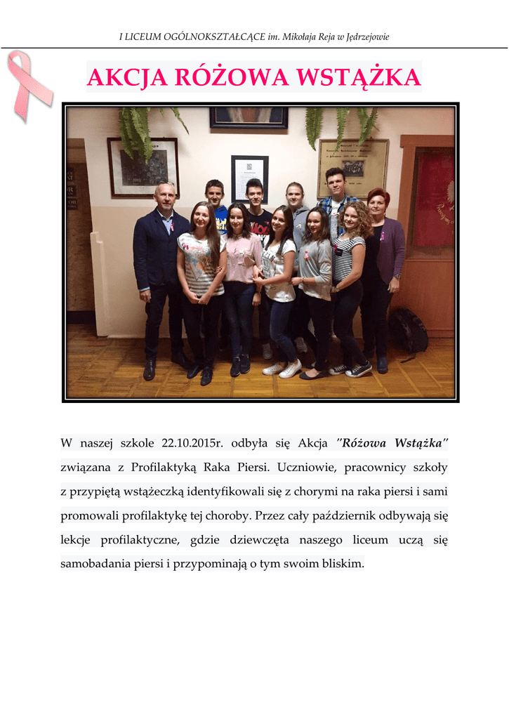 I LICEUM OGÓLNOKSZTAŁCĄCE im. Mikołaja Reja w Jędrzejowie AKCJA RÓŻOWA WSTĄŻKA W naszej szkole 22.10.2015r. odbyła się Akcja "Różowa Wstążka" związana z Profilaktyką Raka Piersi. Uczniowie, pracownicy szkoły z przypiętą wstążeczką identyfikowali się z chorymi na raka piersi i sami promowali profilaktykę tej choroby. Przez cały październik odbywają się lekcje profilaktyczne, gdzie dziewczęta naszego liceum uczą się samobadania piersi i przypominają o tym swoim bliskim.