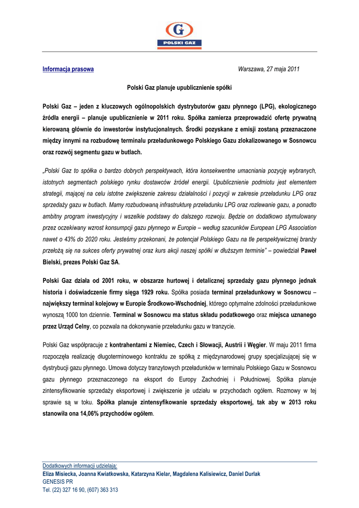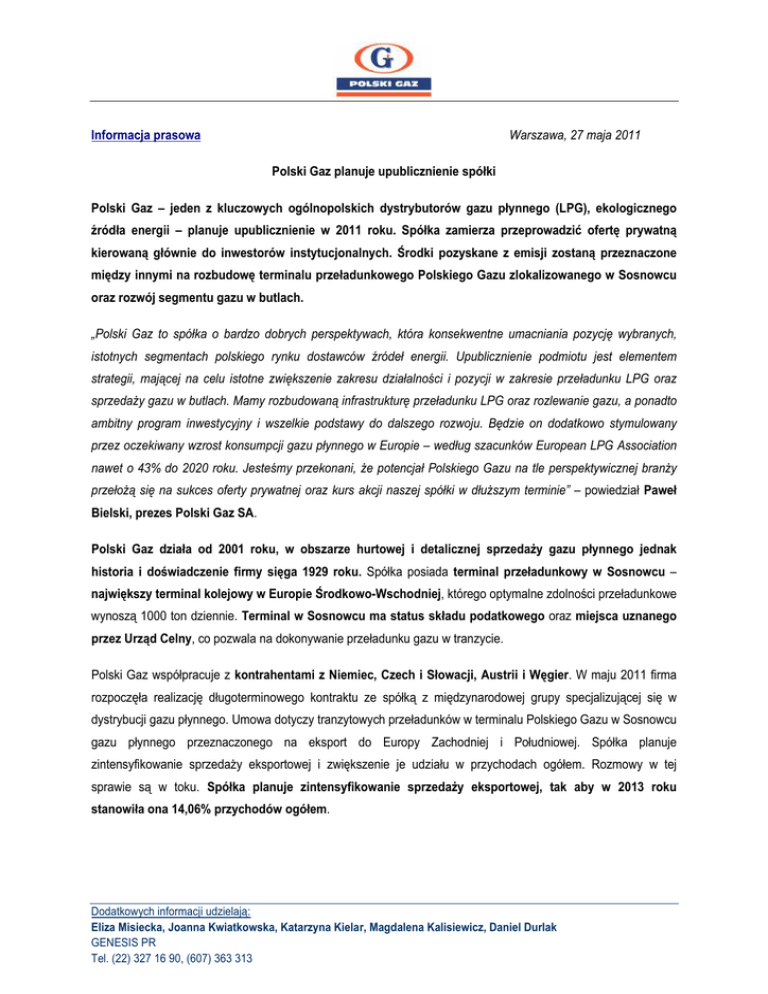 Informacja prasowa Warszawa, 27 maja 2011 Polski Gaz planuje upublicznienie spółki Polski Gaz – jeden z kluczowych ogólnopolskich dystrybutorów gazu płynnego (LPG), ekologicznego źródła energii – planuje upublicznienie w 2011 roku. Spółka zamierza przeprowadzić ofertę prywatną kierowaną głównie do inwestorów instytucjonalnych. Środki pozyskane z emisji zostaną przeznaczone między innymi na rozbudowę terminalu przeładunkowego Polskiego Gazu zlokalizowanego w Sosnowcu oraz rozwój segmentu gazu w butlach. „Polski Gaz to spółka o bardzo dobrych perspektywach, która konsekwentne umacniania pozycję wybranych, istotnych segmentach polskiego rynku dostawców źródeł energii. Upublicznienie podmiotu jest elementem strategii, mającej na celu istotne zwiększenie zakresu działalności i pozycji w zakresie przeładunku LPG oraz sprzedaży gazu w butlach. Mamy rozbudowaną infrastrukturę przeładunku LPG oraz rozlewanie gazu, a ponadto ambitny program inwestycyjny i wszelkie podstawy do dalszego rozwoju. Będzie on dodatkowo stymulowany przez oczekiwany wzrost konsumpcji gazu płynnego w Europie – według szacunków European LPG Association nawet o 43% do 2020 roku. Jesteśmy przekonani, że potencjał Polskiego Gazu na tle perspektywicznej branży przełożą się na sukces oferty prywatnej oraz kurs akcji naszej spółki w dłuższym terminie” – powiedział Paweł Bielski, prezes Polski Gaz SA. Polski Gaz działa od 2001 roku, w obszarze hurtowej i detalicznej sprzedaży gazu płynnego jednak historia i doświadczenie firmy sięga 1929 roku. Spółka posiada terminal przeładunkowy w Sosnowcu – największy terminal kolejowy w Europie Środkowo-Wschodniej, którego optymalne zdolności przeładunkowe wynoszą 1000 ton dziennie. Terminal w Sosnowcu ma status składu podatkowego oraz miejsca uznanego przez Urząd Celny, co pozwala na dokonywanie przeładunku gazu w tranzycie. Polski Gaz współpracuje z kontrahentami z Niemiec, Czech i Słowacji, Austrii i Węgier. W maju 2011 firma rozpoczęła realizację długoterminowego kontraktu ze spółką z międzynarodowej grupy specjalizującej się w dystrybucji gazu płynnego. Umowa dotyczy tranzytowych przeładunków w terminalu Polskiego Gazu w Sosnowcu gazu płynnego przeznaczonego na eksport do Europy Zachodniej i Południowej. Spółka planuje zintensyfikowanie sprzedaży eksportowej i zwiększenie je udziału w przychodach ogółem. Rozmowy w tej sprawie są w toku. Spółka planuje zintensyfikowanie sprzedaży eksportowej, tak aby w 2013 roku stanowiła ona 14,06% przychodów ogółem. Dodatkowych informacji udzielają: Eliza Misiecka, Joanna Kwiatkowska, Katarzyna Kielar, Magdalena Kalisiewicz, Daniel Durlak GENESIS PR Tel. (22) 327 16 90, (607) 363 313 Działalność Polskiego Gazu w istotnych dla spółki segmentach: W 2010 roku przychody ze sprzedaży Polskiego Gazu wyniosły 334,26 mln zł i wzrosły o 34% w porównaniu z rokiem 2009. Spółka planuje dalszy, dynamiczny wzrost obrotów. Wskaźnik EBIDTA w 2010 roku osiągnął 9,67 mln zł, a zysk netto wyniósł 3,3 mln zł. Informacje o Polskim Gazie: Polski Gaz jest jednym z kluczowych ogólnopolskich dystrybutorów gazu płynnego LPG – ekologicznego źródła energii. Spółka koncentruje się na trzech segmentach rynku: • przeładunek – bazując przede wszystkim na możliwościach terminalu w Sosnowcu, spółka prowadzi usługi przeładunkowe na rzecz wiodących operatorów polskiego rynku LPG: Amerigas, Barter, Gaspol, Novatek, Orlen Gaz i Unimot Express (ze względu na świadczone usługi Polski Gaz działa również na rzecz spółek petrochemicznych w segmencie przeładunku autogazu). Przychody z segmentu przeładunku stanowią ok. 72% obrotów spółki. • butle gazowe – spółka posiada 250 tys. własnych butli, które dostarcza przede wszystkim do klientów detalicznych. Polski Gaz działa także w segmencie butli syfonowych do wózków widłowych. Segment butli z gazem generuje ok. 22% przychodów spółki. • zbiorniki z gazem – sprzedaż gazu do zbiorników w segmencie B2B oraz B2C (dla przedsiębiorstw oraz klientów indywidualnych). Ten segment stanowi 3% przychodów spółki. Polski Gaz działa od 2001 roku, w obszarze hurtowej i detalicznej sprzedaży gazu płynnego jednak historia i doświadczenie firmy sięga 1929 roku. Spółka posiada terminal przeładunkowy w Sosnowcu – największy terminal kolejowy w Europie Środkowo-Wschodniej, którego optymalne zdolności przeładunkowe wynoszą 1000 ton dziennie. Terminal w Sosnowcu ma status składu podatkowego oraz miejsca uznanego przez Urząd Celny, co pozwala na dokonywanie przeładunku gazu w tranzycie. Dodatkowych informacji udzielają: Eliza Misiecka, Joanna Kwiatkowska, Katarzyna Kielar, Magdalena Kalisiewicz, Daniel Durlak GENESIS PR Tel. (22) 327 16 90, (607) 363 313 Oddziały Polskiego Gazu (pomorski, centralny i południowy) – wraz z magazynami na terenie niemal całego kraju – umożliwiają dostawy paliwa do klientów w całej Polsce. Ponadto, oddziały w Sosnowcu i Górze Kalwarii mają status składów podatkowych. Polski Gaz posiada dwie rozlewnie gazu płynnego zlokalizowane w Sosnowcu oraz Górze Kalwarii. Polski Gaz aktywnie prowadzi działalność handlową w kluczowych elementach łańcucha wartości rynku LPG: Akcjonariuszami Polskiego Gazu są Petrochemical Holding GmbH (97%) oraz BNC Holland B.V. (3%). Więcej informacji: www.polskigaz.pl LPG (Liquified Petroleum Gas) jest gazem płynnym stanowiącym skroploną mieszankę propanu i butanu. Wykorzystywany jest powszechnie jako paliwo do środków transportu, a także przyjazne środowisku źródło energii. Szerokie możliwości zastosowania gazu płynnego obejmują: • • • • napędzanie silników w środkach transportu (tzw. autogaz), ogrzewanie i gotowanie w gospodarstwach domowych, źródło energii w procesach technologicznych w bardzo licznych gałęziach przemysłu i branżach, tak