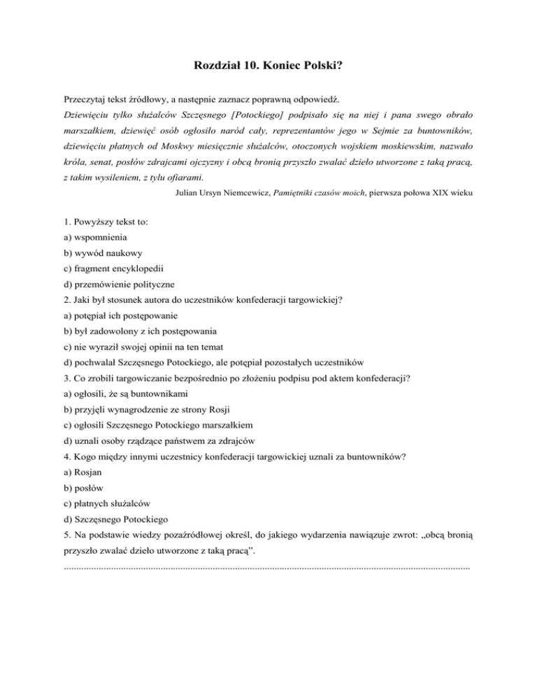 Rozdział 10. Koniec Polski? Przeczytaj tekst źródłowy, a następnie zaznacz poprawną odpowiedź. Dziewięciu tylko służalców Szczęsnego [Potockiego] podpisało się na niej i pana swego obrało marszałkiem, dziewięć osób ogłosiło naród cały, reprezentantów jego w Sejmie za buntowników, dziewięciu płatnych od Moskwy miesięcznie służalców, otoczonych wojskiem moskiewskim, nazwało króla, senat, posłów zdrajcami ojczyzny i obcą bronią przyszło zwalać dzieło utworzone z taką pracą, z takim wysileniem, z tylu ofiarami. Julian Ursyn Niemcewicz, Pamiętniki czasów moich, pierwsza połowa XIX wieku 1. Powyższy tekst to: a) wspomnienia b) wywód naukowy c) fragment encyklopedii d) przemówienie polityczne 2. Jaki był stosunek autora do uczestników konfederacji targowickiej? a) potępiał ich postępowanie b) był zadowolony z ich postępowania c) nie wyraził swojej opinii na ten temat d) pochwalał Szczęsnego Potockiego, ale potępiał pozostałych uczestników 3. Co zrobili targowiczanie bezpośrednio po złożeniu podpisu pod aktem konfederacji? a) ogłosili, że są buntownikami b) przyjęli wynagrodzenie ze strony Rosji c) ogłosili Szczęsnego Potockiego marszałkiem d) uznali osoby rządzące państwem za zdrajców 4. Kogo między innymi uczestnicy konfederacji targowickiej uznali za buntowników? a) Rosjan b) posłów c) płatnych służalców d) Szczęsnego Potockiego 5. Na podstawie wiedzy pozaźródłowej określ, do jakiego wydarzenia nawiązuje zwrot: „obcą bronią przyszło zwalać dzieło utworzone z taką pracą”. ....................................................................................................................................................................