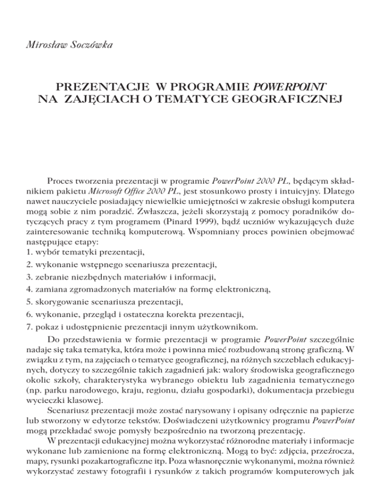 Mirosław Soczówka Prezentacje w programie Powerpoint na zajęciach o tematyce geograficznej Proces tworzenia prezentacji w programie PowerPoint 2000 PL, będącym składnikiem pakietu Microsoft Office 2000 PL, jest stosunkowo prosty i intuicyjny. Dlatego nawet nauczyciele posiadający niewielkie umiejętności w zakresie obsługi komputera mogą sobie z nim poradzić. Zwłaszcza, jeżeli skorzystają z pomocy poradników dotyczących pracy z tym programem (Pinard 1999), bądź uczniów wykazujących duże zainteresowanie techniką komputerową. Wspomniany proces powinien obejmować następujące etapy: 1. wybór tematyki prezentacji, 2. wykonanie wstępnego scenariusza prezentacji, 3. zebranie niezbędnych materiałów i informacji, 4. zamiana zgromadzonych materiałów na formę elektroniczną, 5. skorygowanie scenariusza prezentacji, 6. wykonanie, przegląd i ostateczna korekta prezentacji, 7. pokaz i udostępnienie prezentacji innym użytkownikom. Do przedstawienia w formie prezentacji w programie PowerPoint szczególnie nadaje się taka tematyka, która może i powinna mieć rozbudowaną stronę graficzną. W związku z tym, na zajęciach o tematyce geograficznej, na różnych szczeblach edukacyjnych, dotyczy to szczególnie takich zagadnień jak: walory środowiska geograficznego okolic szkoły, charakterystyka wybranego obiektu lub zagadnienia tematycznego (np. parku narodowego, kraju, regionu, działu gospodarki), dokumentacja przebiegu wycieczki klasowej. Scenariusz prezentacji może zostać narysowany i opisany odręcznie na papierze lub stworzony w edytorze tekstów. Doświadczeni użytkownicy programu PowerPoint mogą przekładać swoje pomysły bezpośrednio na tworzoną prezentację. W prezentacji edukacyjnej można wykorzystać różnorodne materiały i informacje wykonane lub zamienione na formę elektroniczną. Mogą to być: zdjęcia, przeźrocza, mapy, rysunki pozakartograficzne itp. Poza własnoręcznie wykonanymi, można również wykorzystać zestawy fotografii i rysunków z takich programów komputerowych jak 576 Mirosław Soczówka Corel Art Gallery, czy też zasoby galerii ClipArt, w postaci rysunków i animacji, znajdujących się w pakiecie MS Office oraz w witrynie internetowej firmy Microsoft [1]. Zamiana zgromadzonych materiałów na formę elektroniczną może zostać przeprowadzona za pomocą skanera, zaś ich obróbka np. przy pomocy innych programów z pakietu MS Office, w które m.in. wyposażone są szkolne pracownie komputerowe. Można również – o ile osoby zaangażowane w wykonanie prezentacji posiadają dostęp do odpowiedniego programu – wykorzystać mapy wykonane w oprogramowaniu typu GIS. Przykład tego rodzaju opracował M. Szubert (2000). Jednak proste plany, czy też profile hipsometryczne można wykonać nawet przy pomocy najprostszych programów graficznych i użytkowych, takich jak MS Paint i Excel. Bardzo ułatwia pracę podczas wykonywania prezentacji fakt, iż można korzystać z gotowych szablonów projektu programu PowerPoint lub na ich podstawie utworzyć własne. W wykonywanej prezentacji wskazane jest podawanie źródeł wykorzystywanych materiałów oraz unikanie nadmiaru formy nad treścią, wynikającej m.in. z użycia efektów animacji. Gotowa prezentacja może być wyświetlona na ekranie monitora, za pomocą projektora sprzężonego z komputerem lub w sieci www (po zapisaniu w formacie htm z wykorzystaniem funkcji Opublikuj). To ostatnie rozwiązanie jest szczególnie wskazane w szkolnych pracowniach komputerowych. Ze względu na dużą pracochłonność wykonywanie prezentacji powinno się odbywać na zajęciach pozalekcyjnych (np. SKKT), w ramach ścieżek edukacyjnych (szczególnie edukacji regionalnej oraz ekologicznej), lub w domu. Ich przeglądanie może być zwieńczeniem wspomnianych zajęć, elementem zwykłej lekcji lub uroczystości szkolnej. Ze wzglądu na konstrukcję i sposób udostępniania prezentacja edukacyjna w programie PowerPoint przypomina film dydaktyczny, powinna więc być w podobny sposób, pod względem metodycznym, wykorzystywana na zajęciach. Źródłem różnorodnych wzorów prezentacji o tematyce geograficznej może m.in. być Internetowy Biuletyn Edukacyjny [2], redagowany przez pracowników Katedry Metod Komputerowych Akademii Pedagogicznej w Krakowie, do którego materiały tworzą głównie studenci tej uczelni. Literatura i źródła Pinard N. J., 1999, Microsoft PowerPoint 2000 z marszu, Wyd. Prószyński i S−ka, Warszawa. Szubert M., 2000, Zastosowanie programu komputerowego „Surfer” do wizualizacji rzeźby terenu na lekcjach przyrody i geografii, Geografia w Szkole, 4, 197−203. [1] http://dgl.microsoft.com/ – galeria ClipArt w witrynie firmy Microsoft, (marzec 2002 r.). [2] http://www.ap.krakow.pl/ibe/ – Internetowy Biuletyn Edukacyjny, (marzec 2002 r.). mgr Mirosław Soczówka Instytut Geografii Akademia Pedagogiczna Kraków