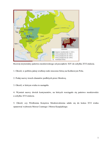 Rozwój terytorialny państwa moskiewskiego od początków XIV do schyłku XVI stulecia. 1. Określ, w pobliżu jakiej wielkiej rzeki stoczono bitwę na Kulikowym Polu. 2. Podaj nazwy trzech chanatów podbitych przez Moskwę. 3. Określ, w którym wieku to nastąpiło. 4. Wymień nazwy dwóch kontynentów, na których rozciągało się państwo moskiewskie u schyłku XVI stulecia. 5. Określ, czy Wielkiemu Księstwu Moskiewskiemu udało się do końca XVI wieku opanować wybrzeża Morza Czarnego i Morza Kaspijskiego. 1
