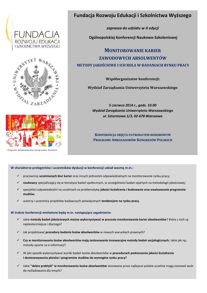 Fundacja Rozwoju Edukacji i Szkolnictwa Wyższego zaprasza do udziału w II edycji Ogólnopolskiej Konferencji Naukowo-Szkoleniowej MONITOROWANIE KARIER ZAWODOWYCH ABSOLWENTÓW METODY JAKOŚCIOWE I ICH ROLA W BADANIACH RYNKU PRACY Współorganizator konferencji: Wydział Zarządzania Uniwersytetu Warszawskiego 5 czerwca 2014 r., godz. 10.00 Wydział Zarządzania Uniwersytetu Warszawskiego ul. Szturmowa 1/3, 02-678 Warszawa KONFERENCJA OBJĘTA PATRONATEM HONOROWYM PROGRAMU AMBASADORÓW KONGRESÓW POLSKICH Progra m Amba sadorów Kongr es ów Pols kich W charakterze prelegentów i uczestników dyskusji w konferencji udział wezmą m.in.: pracownicy uczelnianych biur karier oraz innych jednostek odpowiedzialnych na monitorowanie rynku pracy; naukowcy specjalizujący się w tematyce badań społecznych, w szczególności badań opartych na metodologii jakościowej; specjaliści odpowiedzialni na uczelniach za problematykę jakości kształcenia i budowanie oraz ewaluowanie programów studiów; autorzy i uczestnicy projektów badawczych poświęconych tendencjom na rynku pracy. W trakcie konferencji omówione będą m.in. następujące zagadnienia: Jakie metody badań jakościowych można wykorzystywać w procesie monitorowania karier absolwentów? Które z nich są najskuteczniejsze i dlaczego? Jak projektować procedury badania losów absolwentów w nowych warunkach prawnych? Czy w monitorowaniu losów absolwentów mają zastosowanie innowacyjne metody badań socjologicznych, takie jak np. metody oparte na e-informacji? W jaki sposób wykorzystywać wyniki badań losów absolwentów w procedurach podnoszenia jakości kształcenia i dostosowywania planów i programów studiów do wymogów rynku pracy? Jakie "dobre praktyki" w monitorowaniu losów absolwentów stosowane przez najlepsze polskie uczelnie mogą stanowić wzór do naśladowania dla innych? MONITOROWANIE KARIER ZAWODOWYCH ABSOLWENTÓW METODY JAKOŚCIOWE I ICH ROLA W BADANIACH RYNKU PRACY Cele i tematyka Konferencji: www.fundacja-edukacja.org.pl Konferencja poświęcona będzie omówieniu wyzwań, przed jakimi stoją uczelnie w świetle kolejnej nowelizacji ustawy Prawo o szkolnictwie wyższym i wprowadzenia systemu monitorowania karier absolwentów opartego o analizę danych Zakładu Ubezpieczeń Społecznych. W obecnym stanie prawnym obowiązek badania losów absolwentów w celu dostosowywania programów kształcenia do potrzeb rynku pracy spoczywa na szkołach wyższych. Po wprowadzeniu nowelizacji ustawy zadanie to będzie realizowało Ministerstwo Nauki i Szkolnictwa Wyższego, wraz z ZUS. Rolą uczelni będzie natomiast interpretowanie uzyskanych wyników i wprowadzanie działań projakościowych, w tym doskonalenie programów kształcenia, na podstawie wniosków z analizy „zewnętrznej” rynku pracy. Ponadto uczelnie będą mogły nadal prowadzić własne, autorskie badania losów absolwentów, gdyż sprzyja to wysokiej kulturze jakości i jest oczekiwane przez instytucje akredytujące. Badania losów absolwentów na poziomie uczelni powinny jednak opierać się na METODACH JAKOŚCIOWYCH, albowiem dane ilościowe nt. rynku pracy i sytuacji absolwentów szkoły wyższe otrzymywać będą z Ministerstwa Nauki i Szkolnictwa Wyższego. Uczelnie powinny więc wypracować skuteczne sposoby budowania relacji z absolwentami oraz znaleźć instrumenty pozwalające śledzić ich losy na rynku pracy w oparciu o narzędzia jakościowe, a nie ilościowe, dominujące dotychczas w praktyce monitorowania karier. Zaprezentujemy praktyczne rozwiązania stosowane w procesie monitorowania karier absolwentów, z wykorzystaniem narzędzi jakościowych. Przedstawimy także wnioski i zalecenia wynikające z prac Polskiej Komisji Akredytacyjnej dotyczące sposobów wykorzystania informacji zwrotnej z badań losów absolwentów w procedurach zapewniania jakości kształcenia oraz najczęściej popełniane błędy w tym zakresie. Do udziału w obradach zaprosiliśmy prelegentów ekspertów zajmujących się problematyką: jakości kształcenia, zarządzania biurami karier, metodologii badań społecznych, rynku pracy. Konferencja adresowana jest do przedstawicieli szkół wyższych: rektorów, dziekanów, pełnomocników ds. jakości kształcenia, pracowników biur karier, specjalistów odpowiedzialnych za zarządzanie procesem dydaktycznym, przedstawicieli biur i organizacji odpowiedzialnych za budowanie relacji z absolwentami, naukowców zainteresowanych problematyką rynku pracy, naukowców zainteresowanych tematyką metod jakościowych w badaniach społecznych. Konferencja będzie miała charakter praktyczny. Organizatorzy pragną zapewnić jej uczestnikom możliwość merytorycznego kontaktu i dyskusji na temat aktualnych problemów dotyczących metodologii monitorowania karier absolwentów. Celem konferencji jest przekazanie uczestnikom praktycznej, aplikacyjnej wiedzy oraz zaprezentowanie „dobrych praktyk” i pożądanych rozwiązań w zakresie monitorowania rynku pracy. Serdecznie zapraszamy do udziału! MONITOROWANIE KARIER ZAWODOWYCH ABSOLWENTÓW METODY JAKOŚCIOWE I ICH ROLA W BADANIACH RYNKU PRACY INFORMACJE ORGANIZACYJNE: Termin i miejsce konferencji: 5 czerwca 2014 r., Wydział Zarządzania Uniwersytetu Warszawskiego, ul. Szturmowa 1/3, 02-678 Warszawa, godz. 10.00 Termin nadsyłania zgłoszeń udziału w konferencji – 9 maja 2014 r. Decyduje kolejność zgłoszeń. Liczba miejsc ograniczona! Termin wnoszenia opłaty konferencyjnej – 14 maja 2014 r. Deklaracje udziału w konferencji prosimy przesyłać na Formularzu zgłoszeniowym drogą e-mailową na adres: [email protected]. Formularz dostępny jest na stronie internetowej Fundacji Rozwoju Edukacji i Szkolnictwa Wyższego: www.fundacja-edukacja.org.pl. Opłata konferencyjna dla 1 uczestnika wynosi: 450 zł brutto Organizatorzy zapewniają zniżkę dla uczestników reprezentujących uczelnie posiadające aktualny certyfikat „Uczelnia Liderów”, przyznawany przez Fundację R