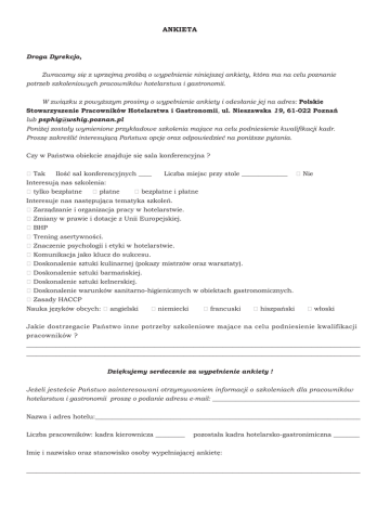 ANKIETA Droga Dyrekcjo, Zwracamy się z uprzejmą prośbą o wypełnienie niniejszej ankiety, która ma na celu poznanie potrzeb szkoleniowych pracowników hotelarstwa i gastronomii. W związku z powyższym prosimy o wypełnienie ankiety i odesłanie jej na adres: Polskie Stowarzyszenie Pracowników Hotelarstwa i Gastronomii, ul. Nieszawska 19, 61-022 Poznań lub [email protected] Poniżej zostały wymienione przykładowe szkolenia mające na celu podniesienie kwalifikacji kadr. Proszę zakreślić interesującą Państwa opcję oraz odpowiedzieć na poniższe pytania. Czy w Państwa obiekcie znajduje się sala konferencyjna ? � Tak Ilość sal konferencyjnych ____ Liczba miejsc przy stole ______________ Interesują nas szkolenia: � tylko bezpłatne � płatne � bezpłatne i płatne Interesuje nas następująca tematyka szkoleń. � Zarządzanie i organizacja pracy w hotelarstwie. � Zmiany w prawie i dotacje z Unii Europejskiej. � BHP � Trening asertywności. � Znaczenie psychologii i etyki w hotelarstwie. � Komunikacja jako klucz do sukcesu. � Doskonalenie sztuki kulinarnej (pokazy mistrzów oraz warsztaty). � Doskonalenie sztuki barmańskiej. � Doskonalenie sztuki kelnerskiej. � Doskonalenie warunków sanitarno-higienicznych w obiektach gastronomicznych. � Zasady HACCP Nauka języków obcych: � angielski � niemiecki � francuski � hiszpański � Nie � włoski Jakie dostrzegacie Państwo inne potrzeby szkoleniowe mające na celu podniesienie kwalifikacji pracowników ? ______________________________________________________________________________________________________ ______________________________________________________________________________________________________ Dziękujemy serdecznie za wypełnienie ankiety ! Jeżeli jesteście Państwo zainteresowani otrzymywaniem informacji o szkoleniach dla pracowników hotelarstwa i gastronomii proszę o podanie adresu e-mail: _____________________________________________ Nazwa i adres hotelu:_________________________________________________________________________________ Liczba pracowników: kadra kierownicza _________ pozostała kadra hotelarsko-gastronimiczna ________ Imię i nazwisko oraz stanowisko osoby wypełniającej ankietę: ______________________________________________________________________________________________________