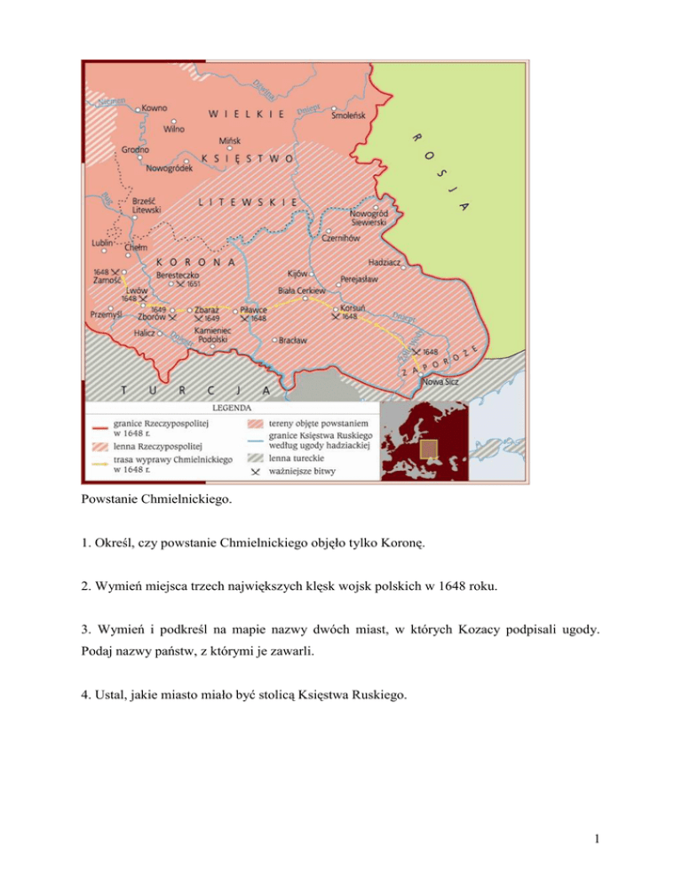Powstanie Chmielnickiego. 1. Określ, czy powstanie Chmielnickiego objęło tylko Koronę. 2. Wymień miejsca trzech największych klęsk wojsk polskich w 1648 roku. 3. Wymień i podkreśl na mapie nazwy dwóch miast, w których Kozacy podpisali ugody. Podaj nazwy państw, z którymi je zawarli. 4. Ustal, jakie miasto miało być stolicą Księstwa Ruskiego. 1