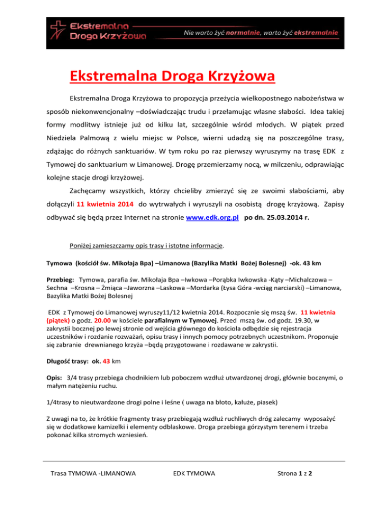 Ekstremalna Droga Krzyżowa Ekstremalna Droga Krzyżowa to propozycja przeżycia wielkopostnego nabożeństwa w sposób niekonwencjonalny –doświadczając trudu i przełamując własne słabości. Idea takiej formy modlitwy istnieje już od kilku lat, szczególnie wśród młodych. W piątek przed Niedziela Palmową z wielu miejsc w Polsce, wierni udadzą się na poszczególne trasy, zdążając do różnych sanktuariów. W tym roku po raz pierwszy wyruszymy na trasę EDK z Tymowej do sanktuarium w Limanowej. Drogę przemierzamy nocą, w milczeniu, odprawiając kolejne stacje drogi krzyżowej. Zachęcamy wszystkich, którzy chcieliby zmierzyć się ze swoimi słabościami, aby dołączyli 11 kwietnia 2014 do wytrwałych i wyruszyli na osobistą drogę krzyżową. Zapisy odbywać się będą przez Internet na stronie www.edk.org.pl po dn. 25.03.2014 r. Poniżej zamieszczamy opis trasy i istotne informacje. Tymowa (kościół św. Mikołaja Bpa) –Limanowa (Bazylika Matki Bożej Bolesnej) -ok. 43 km Przebieg: Tymowa, parafia św. Mikołaja Bpa –Iwkowa –Porąbka Iwkowska -Kąty –Michalczowa – Sechna –Krosna – Żmiąca –Jaworzna –Laskowa –Mordarka (Łysa Góra -wciąg narciarski) –Limanowa, Bazylika Matki Bożej Bolesnej EDK z Tymowej do Limanowej wyruszy11/12 kwietnia 2014. Rozpocznie się mszą św. 11 kwietnia (piątek) o godz. 20.00 w kościele parafialnym w Tymowej. Przed mszą św. od godz. 19.30, w zakrystii bocznej po lewej stronie od wejścia głównego do kościoła odbędzie się rejestracja uczestników i rozdanie rozważań, opisu trasy i innych pomocy potrzebnych uczestnikom. Proponuje się zabranie drewnianego krzyża –będą przygotowane i rozdawane w zakrystii. Długość trasy: ok. 43 km Opis: 3/4 trasy przebiega chodnikiem lub poboczem wzdłuż utwardzonej drogi, głównie bocznymi, o małym natężeniu ruchu. 1/4trasy to nieutwardzone drogi polne i leśne ( uwaga na błoto, kałuże, piasek) Z uwagi na to, że krótkie fragmenty trasy przebiegają wzdłuż ruchliwych dróg zalecamy wyposażyć się w dodatkowe kamizelki i elementy odblaskowe. Droga przebiega górzystym terenem i trzeba pokonać kilka stromych wzniesień. Trasa TYMOWA -LIMANOWA EDK TYMOWA Strona 1 z 2 Zalecamy zabrać dobre, wysokie, nieprzemakalne buty, nieprzemakalne okrycie, latarkę (najlepiej czołówkę), ewentualnie kijki do nornic walking oraz termos z ciepłym napojem i energetyczny posiłek. Rekomendacja: Trasa przeznaczona jest dla wytrawnych piechurów, osób aktywnych fizycznie, zdrowych, przyzwyczajonych do wysiłku fizycznego, mających doświadczenie w pieszych wędrówkach. Osoby niepełnoletnie mogą wziąć udział w EDK jedynie pozostając pod opieką osoby pełnoletniej, za zgoda rodziców. Informacje dodatkowe: powrót z Limanowej we własnym zakresie. Przy zapisach pobrana będzie opłata 10 –koszty organizacyjne EDK. Bliższych informacji udzielają: Stefan Sowa (tel. 797 188 652) i Tomasz Leszczyński (tel. 503 906 678) Trasa TYMOWA -LIMANOWA EDK TYMOWA Strona 2 z 2
