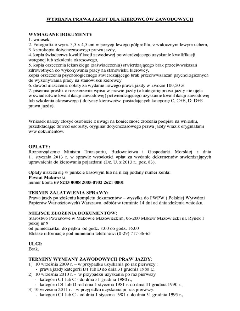 WYMIANA PRAWA JAZDY DLA KIEROWCÓW ZAWODOWYCH WYMAGANE DOKUMENTY 1. wniosek, 2. Fotografia o wym. 3,5 x 4,5 cm w pozycji lewego półprofilu, z widocznym lewym uchem, 3. kserokopia dotychczasowego prawa jazdy, 4. kopia świadectwa kwalifikacji zawodowej potwierdzającego uzyskanie kwalifikacji wstępnej lub szkolenia okresowego, 5. kopia orzeczenia lekarskiego (zaświadczenia) stwierdzającego brak przeciwwskazań zdrowotnych do wykonywania pracy na stanowisku kierowcy, kopia orzeczenia psychologicznego stwierdzającego brak przeciwwskazań psychologicznych do wykonywania pracy na stanowisku kierowcy, 6. dowód uiszczenia opłaty za wydanie nowego prawa jazdy w kwocie 100,50 zł 7. pisemna prośba o rozszerzenie wpisu w prawie jazdy (o kategorię prawa jazdy nie ujętą w świadectwie kwalifikacji zawodowej) potwierdzającego uzyskanie kwalifikacji zawodowej lub szkolenia okresowego ( dotyczy kierowców posiadających kategorię C, C+E, D, D+E prawa jazdy). Wniosek należy złożyć osobiście z uwagi na konieczność złożenia podpisu na wniosku, przedkładając dowód osobisty, oryginał dotychczasowego prawa jazdy wraz z oryginałami w/w dokumentów. OPŁATY: Rozporządzenie Ministra Transportu, Budownictwa i Gospodarki Morskiej z dnia 11 stycznia 2013 r. w sprawie wysokości opłat za wydanie dokumentów stwierdzających uprawnienia do kierowania pojazdami (Dz. U. z 2013 r., poz. 83). Opłaty uiszcza się w punkcie kasowym lub na niżej podany numer konta: Powiat Makowski numer konta 69 8213 0008 2005 0702 2621 0001 TERMIN ZAŁATWIENIA SPRAWY: Prawa jazdy po złożeniu kompletu dokumentów – wysyłka do PWPW ( Polskiej Wytwórni Papierów Wartościowych) Warszawa, odbiór w terminie 14 dni od dnia złożenia wniosku. MIEJSCE ZŁOŻENIA DOKUMENTÓW: Starostwo Powiatowe w Makowie Mazowieckim, 06-200 Maków Mazowiecki ul. Rynek 1 pokój nr 9 od poniedziałku do piątku od godz. 8:00 do godz. 16.00 Bliższe informacje pod numerami telefonów: (0-29) 717-36-65 ULGI: Brak. TERMINY WYMIANY ZAWODOWYCH PRAW JAZDY: 1) 10 września 2009 r. – w przypadku uzyskania po raz pierwszy : - prawa jazdy kategorii D1 lub D do dnia 31 grudnia 1980 r.; 2) 10 września 2010 r. - w przypadku uzyskania po raz pierwszy - kategorii C1 lub C - do dnia 31 grudnia 1980 r., - kategorii D1 lub D -od dnia 1 stycznia 1981 r. do dnia 31 grudnia 1990 r.; 3) 10 września 2011 r. - w przypadku uzyskania po raz pierwszy: - kategorii C1 lub C - od dnia 1 stycznia 1981 r. do dnia 31 grudnia 1995 r., - kategorii D1 lub D - od dnia 1 stycznia 1991 r. do dnia 31 grudnia 2000 r.; 4) 10 września 2012 r. - w przypadku uzyskania po raz pierwszy prawa jazdy: - kategorii C1 lub C - od dnia 1 stycznia 1996 r. do dnia 31 grudnia 2000 r., - kategorii D1 lub D - od dnia 1 stycznia 2001 r. do dnia 31 grudnia 2005 r.; 5) 10 września 2013 r. - w przypadku uzyskania po raz pierwszy: - kategorii C1 lub C - od dnia 1 stycznia 2001 r. do dnia 31 grudnia 2005 r., - kategorii D1 lub D - od dnia 1 stycznia 2006 r. do dnia 10 września 2008 r.; 6) 10 września 2014 r. - w przypadku uzyskania po raz pierwszy : - prawa jazdy kategorii C1 lub C -od dnia 1 stycznia 2006 r. do dnia 10 września 2009 r. DODATKOWE INFORMACJE Kierowcy wykonujący przewóz drogowy posiadający prawa jazdy kategorii D1, D1+E, D lub D+E wydane do dnia 10.09.2008r. oraz kategorii C1, C1+E, C lub C+E wydane do dnia 10.09.2009r. zobowiązani są wykonać badania lekarskie i psychologiczne po ukończeniu pierwszego szkolenia okresowego przed dniem uzyskania wpisu do prawa jazdy. Pozostali kierowy mają obowiązek wykonać pierwsze badanie lekarskie i psychologiczne przed dniem wydania świadectwa kwalifikacji zawodowej potwierdzającego ukończenie kwalifikacji wstępnej a każde następne badania w wieku do 60 lat w terminie właściwym do ukończenia szkolenia okresowego jednak nie później niż do dnia wydania świadectwa kwalifikacji zawodowej potwierdzającej ukończenie szkolenia okresowego. Podstawa prawna 1. Ustawa z dnia 5 stycznia 2011 r. o kierujących pojazdami (Dz. U. z 2011 r. Nr 30, poz. 151 ze zm.), 2. Ustawa z dnia 6 września 2001 r. o transporcie drogowym (Dz. U. z 2013 r., poz. 1414), 3. Rozporządzenie Ministra Transportu, Budownictwa i Gospodarki Morskiej z dnia 31 lipca 2012 r. w sprawie wydawania dokumentów stwierdzających uprawnienia do kierowania pojazdami (Dz. U. z 2012 r., poz. 1005 ze zm.), 4. Rozporządzenie Ministra Transportu, Budownictwa i Gospodarki Morskiej z dnia 11 stycznia 2013 r. w sprawie wysokości opłat za wydanie dokumentów stwierdzających uprawnienia do kierowania pojazdami (Dz. U. z 2013 r., poz. 83). TRYB ODWOŁAWCZY: Odwołanie wnosi się do Samorządowego Kolegium Odwoławczego w terminie 14 dni od dnia doręczenia rozstrzygnięcia, za pośrednictwem organu, który to rozstrzygnięcie wydał. O zachowaniu terminu decyduje data złożenia odwołania w Urzędzie lub data jego nadania w polskiej placówce pocztowej operatora publicznego. Wniesienie odwołania jest wolne od opłat. SKARGI I WNIOSKI: Przedmiotem skargi może być zaniedbanie lub nienależyte wykonywanie zadań przez właściwe organy albo przez ich pracowników, naruszenie praworządności lub interesów skarżących a także przewlekłe lub biurokratyczne załatwianie spraw. Przedmiotem wniosku mogą być między innymi sprawy ulepszenia organizacji, wzmacnianie praworządności, usprawnienie pracy i zapobieganie nadużyciom, ochrony własności społecznej, lepszego zaspokajania potrzeb ludności. Organ właściwy dla załatwienia skargi powinien załatwić skargę bez zbędnej zwłoki, nie później jednak niż w ciągu miesiąca.