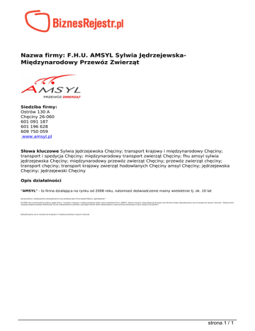 Nazwa firmy: F.H.U. AMSYL Sylwia JędrzejewskaMiędzynarodowy Przewóz Zwierząt Siedziba firmy: Ostrów 130 A Chęciny 26-060 601 091 187 601 196 628 609 750 059 www.amsyl.pl Słowa kluczowe Sylwia Jędrzejewska Chęciny; transport krajowy i międzynarodowy Chęciny; transport i spedycja Chęciny; międzynarodowy transport zwierząt Chęciny; fhu amsyl sylwia jędrzejewska Chęciny; międzynarodowy przewóz zwierząt Chęciny; przewóz zwierząt chęciny; transport chęciny; transport krajowy zwierząt hodowlanych Chęciny amsyl Chęciny; jędrzejewska Chęciny; jędrzejewski Chęciny Opis działalności "AMSYL" - to firma działająca na rynku od 2008 roku, natomiast doświadczenie mamy wieloletnie tj. ok. 10 lat Zaczynaliśmy i zdobywaliśmy doświadczenie oraz praktykę jako firma Zakład Mięsny „Jędrzejewski " W 2008 roku rozszerzyliśmy jedną z gałęzi firmy - transport krajowy i międzynarodowy dzięki czemu powstała firma „AMSYL" Zakres naszych usług obejmuje Europę oraz Ukrainę, Rosję, Specjalizujemy się w transporcie żywych zwierząt . Elastyczność naszego zespołu pozwala dostosować się do indywidualnych potrzeb i wymagań klienta stale udoskonalamy nasze procesy biznesowe co jest naszym priorytetem Specjalizujemy się w transporcie krajowym I międzynarodowym żywych zwierząt strona 1 / 1 Powered by TCPDF (www.tcpdf.org)