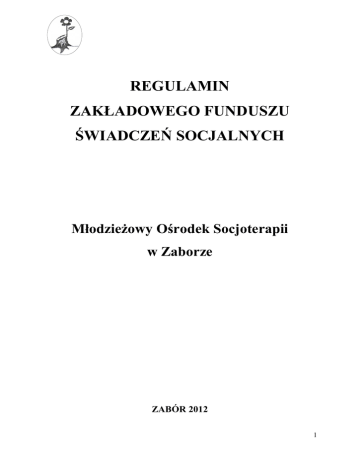 REGULAMIN ZAKŁADOWEGO FUNDUSZU ŚWIADCZEŃ SOCJALNYCH Młodzieżowy Ośrodek Socjoterapii w Zaborze ZABÓR 2012 1 REGULAMIN ZAKŁADOWEGO FUNDUSZU ŚWIADCZEŃ SOCJALNYCH W MŁODZIEŻOWYM OŚRODKU SOCJOTERAPII W ZABORZE I. Podstawa prawna §1 1. Zakładowy Fundusz Świadczeń socjalnych tworzy się na podstawie przepisów: 1) ustawy z dnia 4 marca 1994 r. o zakładowym funduszu świadczeń socjalnych (tekst jednolity Dz. U. z 1996 r. Nr 70, poz. 335 z późn. zm.), 2) ustawa z dnia 23 maja 1991 r. o związkach zawodowych (tekst jednolity Dz. U. z 2001 r. nr 79, poz. 854 z późn. zm.), 3) ustawa z dnia 26 stycznia 1982 r. Karta Nauczyciela (Dz. U. z 2006 r. Nr 97, poz. 674, z późn. zm.), 4) rozporządzenia Ministra Pracy i Polityki Socjalnej z dnia 09 marca 2009 r. w sprawie sposobu ustalania przeciętnej liczby zatrudnionych w celu naliczenia odpisu na zakładowy fundusz świadczeń socjalnych (Dz. U. Nr 43, poz. 349). II. Postanowienia ogólne §2 1. Regulamin Zakładowego Funduszu Świadczeń Socjalnych, zwany dalej Regulaminem, określa zasady przeznaczania środków Funduszu na poszczególne cele i rodzaje działalności socjalnej, zasady i warunki korzystania z usług i świadczeń finansowanych z Funduszu. 2. Regulamin określa szczegółowe zasady gospodarowania środkami zakładowego funduszu świadczeń socjalnych i przeznaczenie tych środków na cele socjalne i pomoc mieszkaniową dla osób uprawnionych. 3. Za administrowanie funduszem i realizację regulaminu odpowiedzialny jest Dyrektor Młodzieżowego Ośrodka Socjoterapii w Zaborze zwany dalej Dyrektorem. 4. Świadczenia mają charakter uznaniowy i przyznawane są na wniosek uprawnionego. 2 III. Tworzenie funduszu §3 1. Odpis podstawowy na fundusz nalicza się corocznie według zasad określonych w ustawie o zakładowym funduszu świadczeń socjalnych. 2. Środki funduszu zwiększa się o: 1) odpis na fundusz w wysokości 6,25% przeciętnego wynagrodzenia w gospodarce narodowej, o którym mowa w ustawie o zakładowym funduszu - na każdą zatrudnioną osobę, w stosunku do której orzeczono znaczny lub umiarkowany stopień niepełnosprawności, oraz na każdego emeryta i rencistę, byłego pracownika zakładu, 2) odsetki od środków funduszu (gromadzonych na rachunku bankowym) a także ewentualnych lokat terminowych prowadzonych w ramach tego rachunku, 3) wpływy z oprocentowania pożyczek udzielanych na cele mieszkaniowe, 4) wpływy z darowizn i zapisów od osób fizycznych i prawnych. 3. Środki Funduszu niewykorzystane w danym roku kalendarzowym przechodzą na rok następny. 4. Środki Funduszu są gromadzone na odrębnym rachunku bankowym. 5. Środki Funduszu nie podlegają egzekucji, z wyjątkiem przypadków, gdy egzekucja jest prowadzona w związku z zobowiązaniami Funduszu. §4 1. Działalność socjalna prowadzona jest w oparciu o roczny plan dochodów i wydatków działalności socjalnej, sporządzony przez pracodawcę w terminie do dnia 30 marca każdego roku. 2. Plan dochodów i wydatków powinien określa załącznik nr 1 do Regulaminu. IV. Przeznaczenie Funduszu §5 1. Ze środków Funduszu wypłaca się nauczycielom świadczenie urlopowe przysługujące im w trybie atr.53, ust.1a Karty Nauczyciela. 2. Pozostałe na koncie środki pieniężne stanowią Fundusz, z którego mogą korzystać wszystkie osoby uprawnione określone w Regulaminie. 3. Środki Funduszu przeznacza się na następujące rodzaje działalności socjalnej: 1) dofinansowanie wypoczynku osób uprawnionych, 2) dofinansowanie wypoczynku dzieci i młodzieży do ukończenia 18 lat, a jeżeli się kształcą – do ukończenia 25 roku życia, 3 3) wypoczynku w dni wolne od pracy organizowanego w formie turystyki grupowej (wycieczki, rajdy), 4) pomocy lub zapomóg pieniężnych (bezzwrotnych) udzielanych w przypadkach losowych, 5) pomoc rzeczową, 6) działalność kulturalno-oświatową, 7) działalność sportowo- rekreacyjną, 8) pożyczki na cele mieszkaniowe, 9) i inne. V. Osoby uprawnione do korzystania z Funduszu §6 Ze świadczeń z Funduszu mają prawo korzystać: 1) pracownicy zatrudnieni na podstawie umowy o pracę w zakładzie pracy, bez względu na formę zawarcia umowy, czas i wymiar pracy, 2) pracownicy przebywający na urlopach wychowawczych, zdrowotnych, 3) emeryci i renciści, którzy rozwiązali umowę z zakładem pracy w związku z przejściem na emeryturę lub rentę, 4) członkowie rodzin pracowników zmarłych w czasie trwania stosunku pracy, a także członkowie rodzin po zmarłym byłym pracowniku, emerycie lub renciście będący dotychczas na jego utrzymaniu i jednocześnie otrzymujący rentę rodzinną po zmarłym, 5) członkowie rodzin osób wymienionych w pkt. 1-3, 6) nauczyciele i pracownicy niepedagogiczni Ośrodka, którzy odeszli na świadczenia przedemerytalne, 2. Członkami rodzin, o których mowa w ust. 1 pkt. 5 są: 1) współmałżonkowie prowadzący wspólnie gospodarstwo domowe z pracownikiem, 2) pozostające na utrzymaniu pracownika, emeryta lub rencisty dzieci własne lub dzieci przysposobione oraz przyjęte na wychowanie dzieci w ramach rodziny zastępczej, dzieci współmałżonków – do ukończenia 18 lat, a jeżeli dalej się kształcą – nie dłużej niż do ukończenia 25 lat, 3) dzieci wymienione w ust. 2 pkt. 2, w stosunku do których orzeczono znaczy lub umiarkowany stopień niepełnosprawności – bez względu na wiek. 1. VI. Zasady i warunki przyznawania świadczeń socjalnych §7 1. Przyznawanie świadczeń oraz wysokość dopłat z Funduszu uzależnia się od sytuacji życiowej, rodzinnej i materialnej osoby uprawnionej do korzystania z Funduszu, 4 2. 3. 4. 5. 6. 7. a w przypadku udzielania pomocy na cele mieszkaniowe równie od sytuacji mieszkaniowej tej osoby. Podstawę do obliczania świadczeń stanowi dochód brutto przypadający na osobę w rodzinie osoby uprawnionej (załącznik nr 2 do Regulaminu). Osoba uprawniona jest zobowiązana ująć w pisemnym oświadczeniu (załącznik