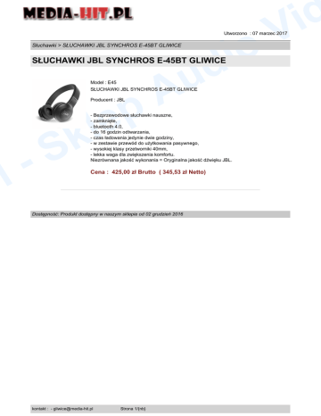 o i d d i V Utworzono : 07 marzec 2017 Słuchawki > SŁUCHAWKI JBL SYNCHROS E-45BT GLIWICE SŁUCHAWKI JBL SYNCHROS E-45BT GLIWICE Model : E45 u A SŁUCHAWKI JBL SYNCHROS E-45BT GLIWICE p le Producent : JBL l p - Bezprzewodowe słuchawki nauszne, - zamknięte, - bluetooth 4.0, - do 16 godzin odtwarzania, - czas ładowania jedynie dwie godziny, - w zestawie przewód do użytkowania pasywnego, - wysokiej klasy przetworniki 40mm, - lekka waga dla zwiększenia komfortu. Niezrównana jakość wykonania = Oryginalna jakość dźwięku JBL. k S Cena : 425,00 zł Brutto ( 345,53 zł Netto) Dostępność: Produkt dostępny w naszym sklepie od 02 grudzień 2016 kontakt : - [email protected] Strona 1/{nb}