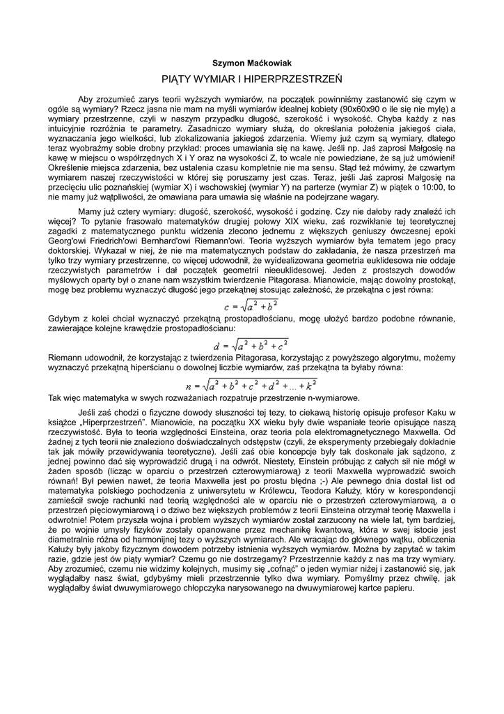 Szymon Maćkowiak PIĄTY WYMIAR I HIPERPRZESTRZEŃ Aby zrozumieć zarys teorii wyższych wymiarów, na początek powinniśmy zastanowić się czym w ogóle są wymiary? Rzecz jasna nie mam na myśli wymiarów idealnej kobiety (90x60x90 o ile się nie mylę) a wymiary przestrzenne, czyli w naszym przypadku długość, szerokość i wysokość. Chyba każdy z nas intuicyjnie rozróżnia te parametry. Zasadniczo wymiary służą, do określania położenia jakiegoś ciała, wyznaczania jego wielkości, lub zlokalizowania jakiegoś zdarzenia. Wiemy już czym są wymiary, dlatego teraz wyobraźmy sobie drobny przykład: proces umawiania się na kawę. Jeśli np. Jaś zaprosi Małgosię na kawę w miejscu o współrzędnych X i Y oraz na wysokości Z, to wcale nie powiedziane, że są już umówieni! Określenie miejsca zdarzenia, bez ustalenia czasu kompletnie nie ma sensu. Stąd też mówimy, że czwartym wymiarem naszej rzeczywistości w której się poruszamy jest czas. Teraz, jeśli Jaś zaprosi Małgosię na przecięciu ulic poznańskiej (wymiar X) i wschowskiej (wymiar Y) na parterze (wymiar Z) w piątek o 10:00, to nie mamy już wątpliwości, że omawiana para umawia się właśnie na podejrzane wagary. Mamy już cztery wymiary: długość, szerokość, wysokość i godzinę. Czy nie dałoby rady znaleźć ich więcej? To pytanie frasowało matematyków drugiej połowy XIX wieku, zaś rozwikłanie tej teoretycznej zagadki z matematycznego punktu widzenia zlecono jednemu z większych geniuszy ówczesnej epoki Georg'owi Friedrich'owi Bernhard'owi Riemann'owi. Teoria wyższych wymiarów była tematem jego pracy doktorskiej. Wykazał w niej, że nie ma matematycznych podstaw do zakładania, że nasza przestrzeń ma tylko trzy wymiary przestrzenne, co więcej udowodnił, że wyidealizowana geometria euklidesowa nie oddaje rzeczywistych parametrów i dał początek geometrii nieeuklidesowej. Jeden z prostszych dowodów myślowych oparty był o znane nam wszystkim twierdzenie Pitagorasa. Mianowicie, mając dowolny prostokąt, mogę bez problemu wyznaczyć długość jego przekątnej stosując zależność, że przekątna c jest równa: Gdybym z kolei chciał wyznaczyć przekątną prostopadłościanu, mogę ułożyć bardzo podobne równanie, zawierające kolejne krawędzie prostopadłościanu: Riemann udowodnił, że korzystając z twierdzenia Pitagorasa, korzystając z powyższego algorytmu, możemy wyznaczyć przekątną hiperścianu o dowolnej liczbie wymiarów, zaś przekątna ta byłaby równa: Tak więc matematyka w swych rozważaniach rozpatruje przestrzenie n-wymiarowe. Jeśli zaś chodzi o fizyczne dowody słuszności tej tezy, to ciekawą historię opisuje profesor Kaku w książce „Hiperprzestrzeń”. Mianowicie, na początku XX wieku były dwie wspaniałe teorie opisujące naszą rzeczywistość. Była to teoria względności Einsteina, oraz teoria pola elektromagnetycznego Maxwella. Od żadnej z tych teorii nie znaleziono doświadczalnych odstępstw (czyli, że eksperymenty przebiegały dokładnie tak jak mówiły przewidywania teoretyczne). Jeśli zaś obie koncepcje były tak doskonałe jak sądzono, z jednej powinno dać się wyprowadzić drugą i na odwrót. Niestety, Einstein próbując z całych sił nie mógł w żaden sposób (licząc w oparciu o przestrzeń czterowymiarową) z teorii Maxwella wyprowadzić swoich równań! Był pewien nawet, że teoria Maxwella jest po prostu błędna ;-) Ale pewnego dnia dostał list od matematyka polskiego pochodzenia z uniwersytetu w Królewcu, Teodora Kałuży, który w korespondencji zamieścił swoje rachunki nad teorią względności ale w oparciu nie o przestrzeń czterowymiarową, a o przestrzeń pięciowymiarową i o dziwo bez większych problemów z teorii Einsteina otrzymał teorię Maxwella i odwrotnie! Potem przyszła wojna i problem wyższych wymiarów został zarzucony na wiele lat, tym bardziej, że po wojnie umysły fizyków zostały opanowane przez mechanikę kwantową, która w swej istocie jest diametralnie różna od harmonijnej tezy o wyższych wymiarach. Ale wracając do głównego wątku, obliczenia Kałuży były jakoby fizycznym dowodem potrzeby istnienia wyższych wymiarów. Można by zapytać w takim razie, gdzie jest ów piąty wymiar? Czemu go nie dostrzegamy? Przestrzennie każdy z nas ma trzy wymiary. Aby zrozumieć, czemu nie widzimy kolejnych, musimy się „cofnąć” o jeden wymiar niżej i zastanowić się, jak wyglądałby nasz świat, gdybyśmy mieli przestrzennie tylko dwa wymiary. Pomyślmy przez chwilę, jak wyglądałby świat dwuwymiarowego chłopczyka narysowanego na dwuwymiarowej kartce papieru. Rys. 1. Dwuwymiarowy chłopczyk w dwuwymiarowej przestrzeni. Nasz chłopczyk ma dwa wymiary i jego świat też ma dwa wymiary. I generalnie dzięki nim dotrze do każdego fragmentu swojego świata i kolejny wymiar przestrzenny nie jest mu do niczego potrzebny. Nie dostrzega go bo jego zmysły nie zostały do tego przygotowane, zaś dobór naturalny w żaden sposób nie premiował osobników dostrzegających więcej wymiarów, gdyż nie miało to biologicznie-praktycznego zastosowania. Jednak, jeśli spojrzymy na kartkę, zauważymy, że w dużym powiększeniu, ma ona trzeci wymiar! Owszem, grubość kartki jest niezwykle mała, niezwykle drobna w porównaniu do jej pozostałych wymiarów, ale jest! Podobnie jest z nami! Nie dostrzegamy kolejnych wymiarów przestrzennych, nie możemy sobie ich nawet wyobrazić, gdyż nie zostaliśmy do nich stworzeni, a one same zaś są po prostu spłaszczone! Obliczenia Kałuży kontynuowane potem przez Kleina mówią o spłaszczeniu do odległości rzędu 10−35 m ! Wróćmy jednak do naszego dwuwymiarowego „płaszczaka”. Gdyby go np. obrysować kółkiem, to nasz chłopczyk jest totalnie zamknięty i w oparciu o dwa wymiary nie ma prawa wyjść ze swojej pułapki, jeśliby jednak uświadomić go czym jest trzeci wymiar, mógłby śmiało stanąć na nogi