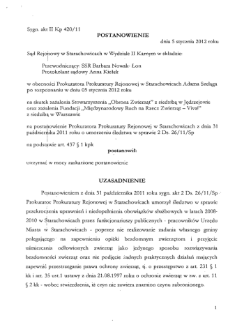 Sygn. akt II Kp 420/11 POSTANOWIENIE dnia 5 stycznia 2012 roku Sąd Rejonowy w Starachowicach w Wydziale II Karnym w składzie: Przewodniczący: SSR Barbara Nowak- Łon Protokolant sądowy Anna Kiełek w obecności Prokuratora Prokuratury Rejonowej w Starachowicach Adama Szeląga po rozpoznaniu w dniu 05 stycznia 2012 roku na skutek zażalenia Stowarzyszenia „Obrona Zwierząt" z siedzibą w Jędrzejowie oraz zażalenia Fundacji „Międzynarodowy Ruch na Rzecz Zwierząt — Viva!" z siedzibą w Warszawie na postanowienie Prokuratora Prokuratury Rejonowej w Starachowicach z dnia 31 października 2011 roku o umorzeniu śledztwa w sprawie 2 Ds. 26/11/Sp j na podstawie art. 437 § 1 kpk postanowił: utrzymać w mocy zaskarżone postanowienie UZASADNIENIE Postanowieniem z dnia 31 października 2011 roku sygn. akt 2 Ds. 26/11/Sp Prokurator Prokuratury Rejonowej w Starachowicach umorzył śledztwo w sprawie przekroczenia uprawnień i niedopełnienia obowiązków służbowych w latach 20082010 w Starachowicach przez funkcjonariuszy publicznych - pracowników Urzędu Miasta w Starachowicach - poprzez nie realizowanie zadania własnego gminy polegającego uśmiercania na zapewnieniu odłowionych opieki zwierząt bezdomnym jako jedynego zwierzętom sposobu i przyjęcie rozwiązywania bezdomności zwierząt oraz nie podjęcie żadnych praktycznych działań mających zapewnić przestrzeganie prawa ochrony zwierząt, tj. o przestępstwo z art. 231 § 1 kk i art. 35 ust.l ustawy z dnia 21.08.1997 roku o ochronie zwierząt w zw. z art. 11 § 2 kk - wobec stwierdzenia, iż czyn nie zawiera znamion czynu zabronionego. Na powyższe postanowienie zażalenie wniosło Stowarzyszenie „Obrona Zwierząt" z siedzibą w Jędrzejowie oraz Fundacja „Międzynarodowy Rucb na Rzecz Zwierząt Viva!" z siedzibą w Warszawie. W zażaleniu Stowarzyszenia „Obrona Zwierząt" zaskarżonemu postanowieniu zarzucono obrazę przepisu prawa materialnego, wyrażonego w arr. i 30 k.k. poprzez jego niezastosowanie (lub błędne zastosowanie)] Ponadto podniesiono, iż w toku śledztwa nie ustalono w sposób szczegółowy;procedury postępowania z wyłapanymi zwierzętami oraz który z. urzędników zatrudnionych w Urzędzie Miasta i w jaki sposób uczestniczył w tej procedurze. W ocenie skarżącego Prokurator w zaskarżonym postanowieniu nie. wskazał w dostateczny sposób, dlaczego nie jest możliwym przypisanie przestępstwa osobom wykonującym prawo miejscowe. Skarżący podniósł, zaskarżonego postanowienia nie 'wynika, czy postępowanie że z treści przygotowawcze zostało umorzone z powodu braku bezprawności czynu, czy też z porodu braku nieświadomości sprawcy, że jego dzianinie jest bezprawne. Precyzując podniesiony w zażaleniu zarzut obrazy przepisu prawa materialnego wyrażonego w art 30 k.k. skarżący wskazał, że Prokurator nie przeprowadził żadnej analizy prawnej i nic wyjaśnił podstawy prawnej swojej decyzji. Ponadto wskazano, że możliwość powołania się na nieświadomość bezprawności jako okoliczności wyłączającej winę istnieje wtedy, gdy błąd co do bezprawności ma charakter usprawiedliwiony, przv czym kryterium to ma charakter obiektywny. Skarżący podniósł również, ze błędnym jest pogląd wyrażony w zaskarżonym postanowieniu, że realizowanie przepisów prawa miejscowego sprzecznego z ustawą uchyla bezkarność. Na potwierdzenie zaprezentowanego stanowiska przywołano wyrok Wojewódzkiego Sądu Administracyjnego w Kielcach z dnia 11 maja 2011 roku, sygn. III SA/Ke 243/11, stwierdzający nieważność zapisów uchwały Rady Miejskiej w Starachowicach nr 11/21/99 z dnia 01.03.1999 roku w sprawie zasad i warunków wyłapywania bezdomnych zwierząt na terenie miasta Starachowice. Nadto skarżący wskazał, że nie został ustalony krąg osób, które niedopełniały bądź przekroczyły swoje uprawnienia wykonując uchwały Rady Miejskiej w Starachowicach, co skutkuje niemożnością stwierdzenia, czy osoby te działały w usprawiedliwionym błędzie co do bezprawności. W konkluzji wniesiono o uchylenie postanowienia i przekazanie ,,sprawy Prokuratorowi celem dalszego prowadzenia postępowania przygotowawczego. W. zażaleniu Fundacji „Międzynarodowy Ruch na Rzecz Zwierząt Viva!" podniesiono zarzut obrazy art. 87 Konstytucji RP poprzez przyjęcie, że w hierarchii źródeł p^rawa prawo miejscowe zajmuje miejsce wyższe niż przepisy ustaw i rozporządzeń. Wskazano, że w razie sprzeczności prawa miejscowego z ustawą lub rozporządzeniem, stosuje się przepisy ustawy lub rozporządzenia. W konkluzji wniesiono o uchylenie zaskarżonego postanowienia i przekazanie sprawy do ponownego rozpoznania. Sad zważył co następuje: Zażalenia wniesione przez Stowarzyszenie „Obrona Zwierząt" z siedzibą w Jędrzejowie oraz Fundację „Międzynarodowy Ruch na Rzecz Zwierząt Viva" z siedzibą w Warszawie na uwzględnienie nie zasługują. W pierwszym rzędzie należy wskazać, iż czyn opisany w zaskarżonym postanowieniu został zakwalifikowany jako wyczerpujący znamiona art. 231 § 1 k.k. i art. 35 ust.l ustawy z dnia 21.08.1997 roku o ochronie zwierząt w zw. z art. 11 § 2 k.k. Odnosząc się do przywołania w kwalifikacji art. 35 u s t l ustawy z dnia 21 sierpnia 1997 roku o ochronie zwierząt, należy przypomnieć, że przepis ten penalizuje zachowanie polegające m.in. na zabijaniu, uśmiercaniu, albo dokonywaniu uboju zwierząt z naruszeniem wymienionych tam przepisów. Odpowiedzialności karnej za przestępstwo z art. 35 ust.l w/w ustawy podlega tylko ten, kto realizuje opisaną tam czynność sprawczą: „zabijania", „uśmiercania", „dokonywania uboju" łub „znęcania się". Nie sposób zatem przypisać przestępstwa określonego w tym przepisie pracownikom Urzędu Miasta w Starachowicach, którzy realizowali zadania związane z zapobieganiem bezdomności zwierząt oraz zapewnieniem porządku i czystości w gminie. Osoby te nie wykonywały bowiem czynno
