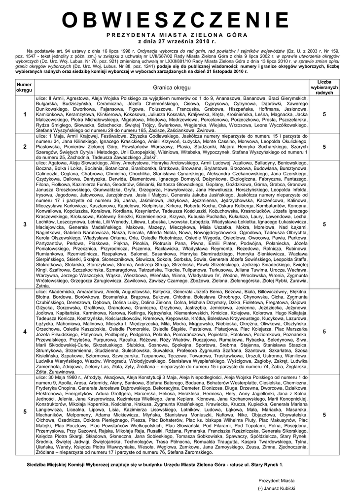OBWIESZCZENIE PREZYDENTA MIASTA ZIELONA GÓRA z dnia 27 września 2010 r. Na podstawie art. 94 ustawy z dnia 16 lipca 1998 r. Ordynacja wyborcza do rad gmin, rad powiatów i sejmików województw (Dz. U. z 2003 r. Nr 159, poz. 1547 - tekst jednolity z późn. zm.) w związku z uchwałą nr LVII/687/02 Rady Miasta Zielona Góra z dnia 9 lipca 2002 r. w sprawie utworzenia okręgów wyborczych (Dz. Urz. Woj. Lubus. Nr 70, poz. 921) zmienioną uchwałą nr LXXII/881/10 Rady Miasta Zielona Góra z dnia 13 lipca 2010 r. w sprawie zmian opisu granic okręgów wyborczych (Dz. Urz. Woj. Lubus. Nr 88, poz. 1241) podaje się do publicznej wiadomości: numery i granice okręgów wyborczych, liczbę wybieranych radnych oraz siedzibę komisji wyborczej w wyborach zarządzonych na dzień 21 listopada 2010 r. Numer okręgu 1 2 3 4 5 Liczba wybieranych radnych Granica okręgu ulice: II Armii, Agrestowa, Aleja Wojska Polskiego za wyjątkiem numerów od 1 do 9, Ananasowa, Bananowa, Braci Gierymskich, Bułgarska, Budziszyńska, Ceramiczna, Józefa Chełmońskiego, Cisowa, Cyprysowa, Cytrynowa, Dąbrówki, Xawerego Dunikowskiego, Dworkowa, Fajansowa, Figowa, Foluszowa, Francuska, Grabowa, Hiszpańska, Hoffmana, Jesionowa, Kamionkowa, Keramzytowa, Klinkierowa, Kokosowa, Juliusza Kossaka, Kraljevska, Kręta, Krośnieńska, Leśna, Magnacka, Jacka Malczewskiego, Piotra Michałowskiego, Migdałowa, Miodowa, Modrzewiowa, Porcelanowa, Porzeczkowa, Prosta, Pszczelarska, Rydza Śmigłego, Słowacka, Szlachecka, Świętej Trójcy, Świerkowa, Węgierska, Wiejska, Wrzosowa, Leona Wyczółkowskiego, Stefana Wyszyńskiego od numeru 29 do numeru 165, Zacisze, Zaściankowa, Żwirowa. ulice: 1 Maja, Armii Krajowej, Festiwalowa, Zbyszka Godlewskiego, Jaskółcza numery nieparzyste do numeru 15 i parzyste do numeru 34, Jana Kilińskiego, Ignacego Krasickiego, Anieli Krzywoń, Łużycka, Monte Cassino, Morwowa, Leopolda Okulickiego, Piastowska, Pionierów Zielonej Góry, Powstańców Warszawy, Ptasia, Studzianki, Majora Henryka Sucharskiego, Szarych Szeregów, Świętych Cyryla i Metodego, Unii Europejskiej, Wiśniowa, Witebska, Wypoczynek, Stefana Wyszyńskiego od numeru 1 do numeru 25, Zachodnia, Tadeusza Zawadzkiego „Zośki”. ulice: Agatowa, Aleja Słowackiego, Aliny, Ametystowa, Henryka Arctowskiego, Armii Ludowej, Azaliowa, Balladyny, Beniowskiego, Boczna, Bolka i Lolka, Bociania, Botaniczna, Braniborska, Bratkowa, Browarna, Brylantowa, Brzozowa, Budowlana, Bursztynowa, Calineczki, Ceglana, Chabrowa, Chmielna, Chochlika, Stanisława Cynarskiego, Aleksandra Czekanowskiego, Jana Czerskiego, Czyżykowa, Daliowa, Dantyszka, Derwida, Diamentowa, Ignacego Domeyki, Dożynkowa, Ekologiczna, Fabryczna, Fantazego, Filona, Fiołkowa, Kazimierza Funka, Geodetów, Glinianki, Bartosza Głowackiego, Goplany, Goździkowa, Górna, Grabca, Gronowa, Janusza Groszkowskiego, Grunwaldzka, Gryfa, Grzegorza, Hawryłowicza, Jana Heweliusza, Horsztyńskiego, Leopolda Infelda, Irysowa, Jagodowa, Jałowcowa, Jarzębinowa, Jasia i Małgosi, Generała Jakuba Jasińskiego, Jaskółcza numery nieparzyste od numeru 17 i parzyste od numeru 36, Jasna, Jaśminowa, Jeżykowa, Jęczmienna, Jędrzychowska, Kaczeńcowa, Kalinowa, Mieczysława Karłowicza, Kasztanowa, Kąpielowa, Kiełpińska, Kirkora, Roberta Kocha, Oskara Kolberga, Kombatantów, Konopna, Konwaliowa, Kopciuszka, Koralowa, Kordiana, Kosynierów, Tadeusza Kościuszki, Kożuchowska, Krasnoludków, Józefa Ignacego Kraszewskiego, Krokusowa, Królewny Śnieżki, Krzemieniecka, Krzywa, Kubusia Puchatka, Kukułcza, Laury, Lawendowa, Lecha, Lechitów, Leszczynowa, Letnia, Lilii Wenedy, Liliowa, Lubuska, Lwowska, Łabędzia, Władysława Łokietka, Ignacego Łukasiewicza, Maciejowicka, Generała Madalińskiego, Makowa, Mazepy, Mieczykowa, Misia Uszatka, Mokra, Morelowa, Nad Łąkami, Nagietkowa, Gabriela Narutowicza, Nasza, Niecała, Alfreda Nobla, Nowa, Nowojędrzychowska, Ogrodowa, Tadeusza Olbrychta, Karola Olszewskiego, Władysława Orkana, Orla, Osiedle Robotnicze, Osiedle Wygoda, Osiedlowa, Owocowa, Pawia, Parkowa, Partyzantów, Perłowa, Piaskowa, Piękna, Pinokia, Piotrusia Pana, Piwna, Emilii Plater, Podwójna, Połaniecka, Józefa Poniatowskiego, Przecznica, Przyrodnicza, Pszenna, Racławicka, Władysława Reymonta, Rezedowa, Rolnicza, Rubinowa, Rumiankowa, Rzemieślnicza, Rzepakowa, Salomei, Sasankowa, Henryka Siemiradzkiego, Henryka Sienkiewicza, Wacława Sierpińskiego, Skierki, Skrajna, Słonecznikowa, Słowicza, Sokola, Sorbska, Sowia, Generała Józefa Sowińskiego, Leopolda Staffa, Stokrotkowa, Stolarska, Storczykowa, Stroma, Andrzeja Struga, Strzelecka, Pawła Strzeleckiego, Jędrzeja Śniadeckiego, Świętej Kingi, Szafirowa, Szczekocińska, Szmaragdowa, Tatrzańska, Tkacka, Tulipanowa, Turkusowa, Juliana Tuwima, Urocza, Wacława, Warzywna, Jerzego Waszczyka, Wąska, Wierzbowa, Wileńska, Winna, Władysława IV, Wodna, Wrocławska, Wronia, Zygmunta Wróblewskiego, Grzegorza Zarugiewicza, Zawilcowa, Zawiszy Czarnego, Zbożowa, Zielona, Zielonogórska, Złotej Rybki, Żurawia, Żytnia. ulice: Akademicka, Amarantowa, Amelii, Augustowska, Bałtycka, Generała Józefa Bema, Beżowa, Biała, Billewiczówny, Błękitna, Błotna, Bordowa, Borówkowa, Bosmańska, Brązowa, Bukowa, Chłodna, Bolesława Chrobrego, Chynowska, Cicha, Zygmunta Czubińskiego, Dereszowa, Dębowa, Dolina Luizy, Dolina Zielona, Dolna, Michała Drzymały, Dzika, Fioletowa, Fregatowa, Gajowa, Giżycka, Gorzowska, Grafitowa, Granatowa, Graniczna, Grzybowa, Jastrzębia, Jemiołowa, Jesienna, Jeździecka, Jeżynowa, Jodłowa, Kapitańska, Karminowa, Karowa, Ketlinga, Kętrzyńska, Klementowskich, Kmicica, Kolejowa, Kolorowa, Hugo Kołłątaja, Tadeusza Konicza, Kostrzyńska, Kościuszkowców, Kremowa, Krępowska, Krótka, Bolesława Krzywoustego, Kucykowa, Lazurowa, Łężycka, Mahoniowa, Malinowa, Mieszka I, Międzyrzecka, Miła, Modra, Mrągowska, Niebieska, Okrężna, Oliwkowa, Olsztyńska, Orzechowa, Osiedle Kaszub