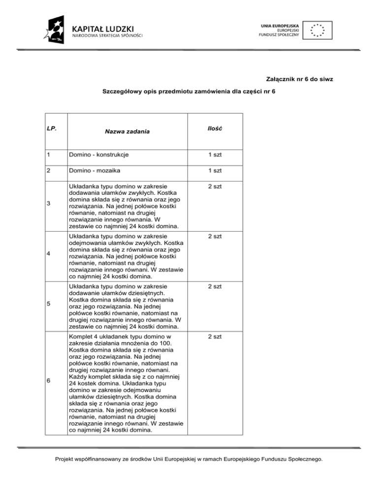 Załącznik nr 6 do siwz Szczegółowy opis przedmiotu zamówienia dla części nr 6 LP. Nazwa zadania Ilość 1 Domino - konstrukcje 1 szt 2 Domino - mozaika 1 szt 2 szt 3 Układanka typu domino w zakresie dodawania ułamków zwykłych. Kostka domina składa się z równania oraz jego rozwiązania. Na jednej połówce kostki równanie, natomiast na drugiej rozwiązanie innego równania. W zestawie co najmniej 24 kostki domina. 2 szt 4 Układanka typu domino w zakresie odejmowania ułamków zwykłych. Kostka domina składa się z równania oraz jego rozwiązania. Na jednej połówce kostki równanie, natomiast na drugiej rozwiązanie innego równani. W zestawie co najmniej 24 kostki domina. 2 szt 5 Układanka typu domino w zakresie dodawanie ułamków dziesiętnych. Kostka domina składa się z równania oraz jego rozwiązania. Na jednej połówce kostki równanie, natomiast na drugiej rozwiązanie innego równania. W zestawie co najmniej 24 kostki domina. 2 szt 6 Komplet 4 układanek typu domino w zakresie działania mnożenia do 100. Kostka domina składa się z równania oraz jego rozwiązania. Na jednej połówce kostki równanie, natomiast na drugiej rozwiązanie innego równani. Każdy komplet składa się z co najmniej 24 kostek domina. Układanka typu domino w zakresie odejmowaniu ułamków dziesiętnych. Kostka domina składa się z równania oraz jego rozwiązania. Na jednej połówce kostki równanie, natomiast na drugiej rozwiązanie innego równani. W zestawie co najmniej 24 kostki domina. Projekt współfinansowany ze środków Unii Europejskiej w ramach Europejskiego Funduszu Społecznego. 2 szt 7 Układanka typu domino w zakresie skracania ułamków zwykłych. Kostka domina składa się z równania oraz jego rozwiązania. Na jednej połówce kostki równanie, natomiast na drugiej rozwiązanie innego równani. W zestawie co najmniej 24 kostki domina. 2 szt 8 Domino pomagające dzieciom utrwalenie czasu. Kostka domina składa się prezentacji czasu formie tarczy zegarowej oraz czasu zapisywanego cyfrowo. Dziecko musi dopasować tą samą godzinę wskazaną na zegarze tarczowym i cyfrowym. W zestawie co najmniej 48 kostek domina. 4 szt (1zestaw) 9 Komplet 4 układanek typu domino w zakresie działania mnożenia do 100. Kostka domina składa się z równania oraz jego rozwiązania. Na jednej połówce kostki równanie, natomiast na drugiej rozwiązanie innego równani. Każdy komplet składa się z co najmniej 24 kostek domina. 2 szt 10 Układanka typu domino w zakresie działań na ułamkach dziesiętnych, składający się z co najmniej 10 układanek po 15 kostek każda. Kostka domina składa się z równania oraz jego rozwiązania. Na jednej połówce kostki równanie, natomiast na drugiej rozwiązanie innego równania. 1 szt 11 Układanka typu domino składająca się różnych figur geometrycznych. Kształty figur geometrycznych można wyczuć dotykiem. Każda figura geometryczna jest odmiennego koloru. W zestawie co najmniej 21 kostek domina. Projekt współfinansowany ze środków Unii Europejskiej w ramach Europejskiego Funduszu Społecznego.