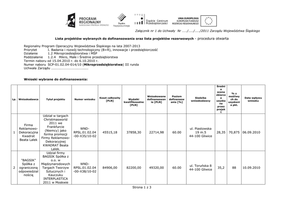 Załącznik nr 1 do Uchwały Nr ……/……/……/2011 Zarządu Województwa Śląskiego Lista projektów wybranych do dofinansowania oraz lista projektów rezerwowych - procedura otwarta Regionalny Program Operacyjny Województwa Śląskiego na lata 2007-2013 Priorytet I. Badania i rozwój technologiczny (B+R), innowacje i przedsiębiorczość Działanie 1.2 Mikroprzedsiębiorstwa i MŚP Poddziałanie 1.2.4 Mikro, Małe i Średnie przedsiębiorstwa Termin naboru od 15.04.2010 r. do 6.10.2010 r. Numer naboru SCP-01.02.04-014/10 (Mikroprzedsiębiorstwa) III runda Uchwała Zarządu ……………………………………… Wnioski wybrane do dofinansowania: Lp. 1 2 Wnioskodawca Tytuł projektu Udział w targach Christmasworld 2011 we Firma Frankfurcie Reklamowo(Niemcy) jako Dekoracyjna forma promocji Kwadrat Firmy ReklamowoBeata Lalek Dekoracyjnej KWADRAT Beata Lalek. Udział firmy BAGSIK Spółka z "BAGSIK" o.o. w Spółka z Międzynarodowych ograniczoną Targach Tworzyw odpowiedzial Sztucznych i nością Kauczuku INTERPLASTICA 2011 w Moskwie Wnioskowane dofinansowan ie [PLN] Poziom dofinansow ania [%] Siedziba wnioskodawcy Średni a ocena zbiorcz a uzyska na przez projek t Numer wniosku Koszt całkowity [PLN] WNDRPSL.01.02.04 -00-X35/10-02 45515,18 37858,30 22714,98 60.00 ul. Piastowska 19 m.5 44-100 Gliwice 28,35 WNDRPSL.01.02.04 -00-X38/10-02 84906,00 82200,00 49320,00 60.00 ul. Toruńska 8 44-100 Gliwice 35,2 Wydatki kwalifikowalne [PLN] Strona 1 z 3 %z możliwy ch do uzyskani a pkt. 70,875 06.09.2010 88 Data wpływu wniosku 10.09.2010 3 BIS Paweł Błaszczyk 4 BIS Paweł Błaszczyk 5 Roko spółka z ograniczoną odpowiedzial nością Misja gospodarcza firmy BIS Paweł Błaszczyk na wystawę podczas Conference of the International Federation of Operation Research Societes IFORS 2011, Melbourne, Australia Misja gospodarcza firmy BIS Paweł Błaszczyk na wystawę podczas INFORMS Annual Meeting 2011, Charlotte, North Carolina, USA WNDRPSL.01.02.04 -00-X41/10-02 15022,00 12790,00 7674,00 60.00 ul. Halembska 88 41-706 Ruda Śląska 30 75 16.09.2010 30 75 16.09.2010 WNDRPSL.01.02.04 -00-X43/10-02 12200,00 11000,00 6600,00 60.00 ul. Halembska 88 41-706 Ruda Śląska Udział w targach DENTAL SOUTH CHINA w Gaungzhou w Chinach WNDRPSL.01.02.04 -00-X53/10-02 95000,00 83300,00 49980,00 60.00 ul. Bór 177 42-202 Częstochowa 33,2 83 05.10.2010 6 Roko spółka z ograniczoną odpowiedzial nością Udział w targach SIDEX w Seulu w Korei Południowej. WNDRPSL.01.02.04 -00-X54/10-02 95000,00 83300,00 49980,00 60.00 ul. Bór 177 42-202 Częstochowa 33,2 83 05.10.2010 7 Roko spółka z ograniczoną odpowiedzial nością Udział w targach GREATER NEW YORK DENTAL MEETING w New York w Stanach Zjednoczonych. WNDRPSL.01.02.04 -00-X55/10-02 95620,00 83330,00 49998,00 60.00 ul. Bór 177 42-202 Częstochowa 33,2 83 05.10.2010 Strona 2 z 3 8 OLYMPIA YACHT JOLANTA HOŁDOWICZ 9 OLYMPIA YACHT JOLANTA HOŁDOWICZ Roko spółka z 10 ograniczoną odpowiedzial nością Udział w targach BOOT UND FUN 2011 w Berlinie w Niemczech jako wystawca szansą na pozyskanie nowych klientów dla firmy OLYMPIA YACHT. Udział w targach BOOT 2012 w Dusseldorfie w Niemczech jako wystawca szansą na pozyskanie nowych klientów dla firmy OLYMPIA YACHT. Udział w targach SINO-DENTAL w Pekinie w Chinach WNDRPSL.01.02.04 -00-X56/10-02 41200,00 33770,00 20248,50 59.96 ul. ŚWIERCZYNIECK A 75 43-150 BIERUŃ 36,2 90,5 06.10.2010 36,2 90,5 06.10.2010 33,2 83 06.10.2010 WNDRPSL.01.02.04 -00-x57/10-02 59200,00 48524,50 29095,30 59.96 ul. ŚWIERCZYNIECK A 75 43-150 BIERUŃ WNDRPSL.01.02.04 -00-X58/10-02 95000,00 83300,00 49980,00 60.00 ul. Bór 177 42-202 Częstochowa 638 663,18 559 372,80 335 590,78 Razem: Lista rezerwowa projektów: brak …………………………………… Miejscowość Strona 3 z 3 ……………………… Data …………………………… Zatwierdził