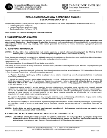 International House Integra Bielsko CENTRUM EGZAMINACYJNE CAMBRIDGE ENGLISH PL070 REGULAMIN EGZAMINÓW CAMBRIDGE ENGLISH SESJA WIOSENNA 2015 Niniejszy Regulamin dotyczy egzaminów organizowanych przez International House Integra Bielsko w sesji wiosennej 2015, tj.: - Cambridge English: First (FCE) - Cambridge English: Advanced (CAE) - Cambridge English: Proficiency (CPE) Sesja wiosenna 2015 trwa od 20 lutego do 15 marca 2015 roku. I. REJESTRACJA NA EGZAMIN Zapisy na egzaminy Cambridge English odbywają się zgodnie z Kalendarzem i cennikiem egzaminów w sesji wiosennej 2015 stanowiącym Załącznik nr 1 do niniejszego Regulaminu. Na egzamin można zarejestrować się indywidualnie lub za pośrednictwem wybranej przez siebie szkoły czy instytucji, która wyrazi gotowość dopełnienia, w imieniu kandydata, wymaganych procedur rejestracyjnych. A. KANDYDACI INDYWIDUALNI UWAGA: Osoby, które chcą wykorzystać swój wynik egzaminu w celach wizowych/imigracyjnych do Wielkiej Brytanii zobowiązane są skontaktować się z Centrum Egzaminacyjnym PRZED dokonaniem rejestracji. Przed dokonaniem rejestracji kandydaci winni dokładnie zapoznać się z niniejszym Regulaminem oraz jego Załącznikiem (Kalendarz i cennik egzaminów w sesji wiosennej 2015), jak również z następującymi dokumentami: - Regulations 2015 - Summary regulations for candidates 2015 and Notice to candidates Dokumenty te można pobrać ze strony www.ih.com.pl/bielsko-biala (zakładka Centrum Egzaminacyjne, Aktualne sesje egzaminacyjne – SESJA WIOSENNA 2015). Następnie należy – w terminie rejestracji, podanym w Kalendarzu i cenniku egzaminów w sesji wiosennej 2015, stanowiącym Załącznik nr 1 do niniejszego Regulaminu – wykonać następujące czynności: 1. Wypełnić formularz rejestracyjny on-line znajdujący się na stronie internetowej www.ih.com.pl/bielsko-biala (w zakładce Centrum Egzaminacyjne). 2. Wnieść wymaganą w danym trybie opłatę egzaminacyjną, zgodnie z Kalendarzem i cennikiem egzaminów w sesji wiosennej 2015 stanowiącym Załącznik nr 1 do niniejszego Regulaminu, przelewem na konto banku ING o/Bielsko-Biała o numerze 35 1050 1070 1000 0024 0564 1289 (w tytule przelewu należy podać imię i nazwisko osoby zdającej oraz skróconą nazwę egzaminu – np. Jan Kowalski, FCE). 3. Dodatkowo należy wypełnić i ręcznie podpisać formularz oświadczenia obejmujący zgodę na wykonanie fotografii podczas egzaminu (do pobrania ze strony www.ih.com.pl/bielsko-biala, zakładka Centrum Egzaminacyjne, Aktualne sesje egzaminacyjne – SESJA WIOSENNA 2015). Formularz należy następnie dostarczyć do biura Centrum Egzaminacyjnego najpóźniej w ostatnim dniu rejestracji w trybie zwykłym lub późnym (zależnie od tego, kiedy kandydat rejestruje się na egzamin). W przypadku osób niepełnoletnich podpis składa rodzic lub opiekun prawny. Po wysłaniu formularza rejestracyjnego on-line, kandydat otrzyma pocztą elektroniczną potwierdzenie, że jego dane zostały wpisane na listę zgłoszeń, wraz z informacją o sposobie wniesienia opłaty egzaminacyjnej. Po zaksięgowaniu wpłaty na koncie Centrum Egzaminacyjnego oraz otrzymaniu przez Centrum Egzaminacyjne wypełnionego i podpisanego formularza zgody na wykonanie zdjęcia, kandydat otrzyma pocztą elektroniczną potwierdzenie rejestracji na egzamin. UWAGA: Osoby, które nie spełnią wymagań wymienionych w punktach 1 - 3 nie zostaną zarejestrowane na egzamin, a ich dane zostaną usunięte z listy kandydatów. B. KANDYDACI REJESTROWANI GRUPOWO PRZEZ SZKOŁY LUB INSTYTUCJE UWAGA: Jeżeli któryś z kandydatów zapisywanych na egzamin przez szkołę lub instytucję chce wykorzystać swój wynik egzaminu w celach wizowych/imigracyjnych do Wielkiej Brytanii, szkoła lub instytucja rejestrująca kandydata jest zobowiązana skontaktować się z Centrum Egzaminacyjnym PRZED dokonaniem rejestracji. International House Integra Bielsko Sp. z o.o., ul. Zielona 32, 43-300 Bielsko-Biała tel. 33/8223330, fax 33/8223350, e-mail: [email protected] Data utworzenia: 02-01-2015 Strona 1 z 6 International House Integra Bielsko CENTRUM EGZAMINACYJNE CAMBRIDGE ENGLISH PL070 Kandydaci zapisywani na egzamin przez szkoły lub instytucje dokonują formalności związanych z rejestracją za ich pośrednictwem. W celu zarejestrowania kandydata/ów na egzamin, szkoła/ instytucja powinna: 1. Pobrać z Centrum Egzaminacyjnego lub ze strony internetowej www.ih.com.pl/bielsko-biala (zakładka Centrum Egzaminacyjne, Aktualne sesje egzaminacyjne – SESJA WIOSENNA 2015) dokumenty rejestracyjne, w tym: a) b) c) d) Regulamin egzaminów Cambridge English, wraz z Załącznikiem nr 1 (Kalendarz i cennik egzaminów w sesji wiosennej 2015); Formularz rejestracyjny dla szkół i instytucji; Oświadczenie kandydata zgłaszanego za pośrednictwem szkoły lub instytucji; Formularz oświadczenia obejmujący zgodę na wykonanie fotografii podczas egzaminu. 2. Przekazać rejestrowanym przez siebie kandydatom Regulamin egzaminów Cambridge English wraz z Załącznikiem nr 1 oraz dopilnować, aby kandydaci złożyli podpisy na wspomnianym wyżej formularzu rejestracyjnym i oświadczeniu/ oświadczeniach. 3. Poinformować kandydatów, iż powinni zapoznać się dodatkowo z dokumentami: Regulations 2015 oraz Summary regulations for candidates 2015 and Notice to candidates, które pobrać można ze strony www.ih.com.pl/bielsko-biala (zakładka Centrum Egzaminacyjne, Aktualne sesje egzaminacyjne – SESJA WIOSENNA 2015). 4. Wnieść odpowiednią opłatę egzaminacyjną, zgodnie z Kalendarzem i cennikiem egzaminów w sesji wiosennej 2015 stanowiącym Załącznik nr 1 do niniejszego Regulaminu, przelewem na konto banku ING o/Bielsko-Biała o numerze 35 1050 1070 1000 0024 0564 1289 (w tytule przelewu należy podać nazwę szkoły/ instytucji zgłaszającej, skróconą nazwę egzaminu/ów, wraz z ilością osób rejestrowanych na dany egzamin, np. Smith&Co., BEC Vantage-4, FCE-19, CAE-7, CPE-2). Alternat